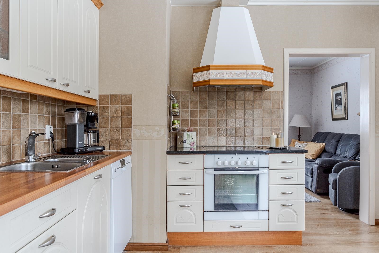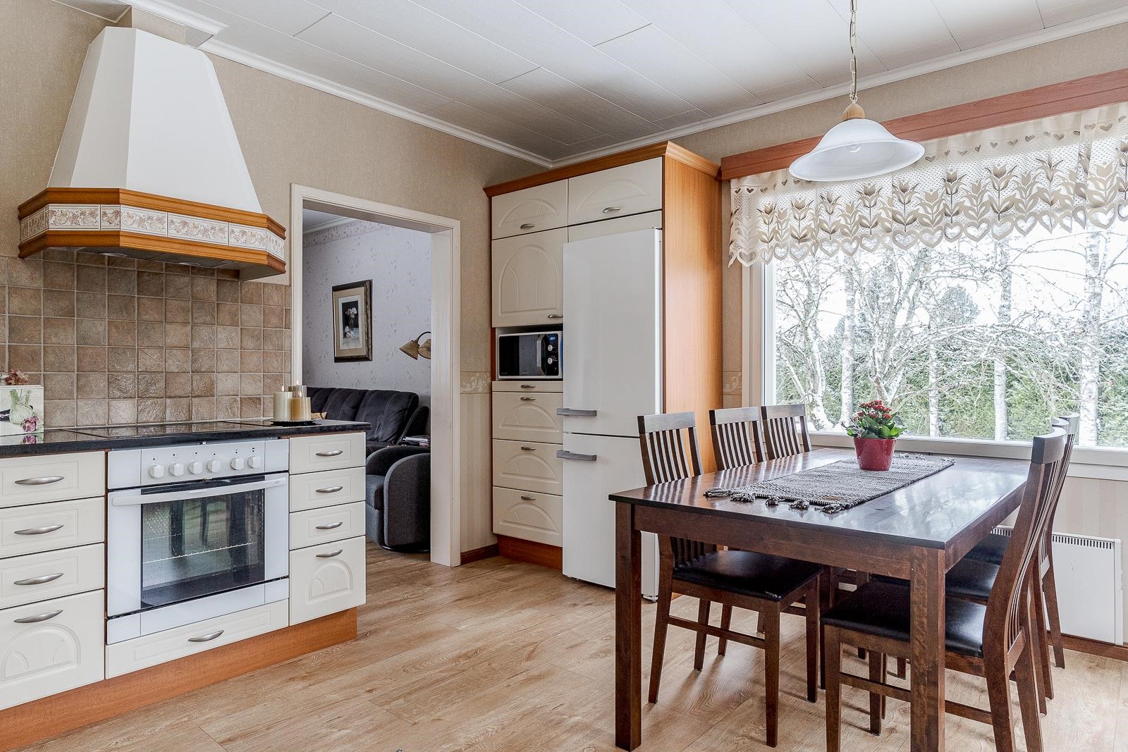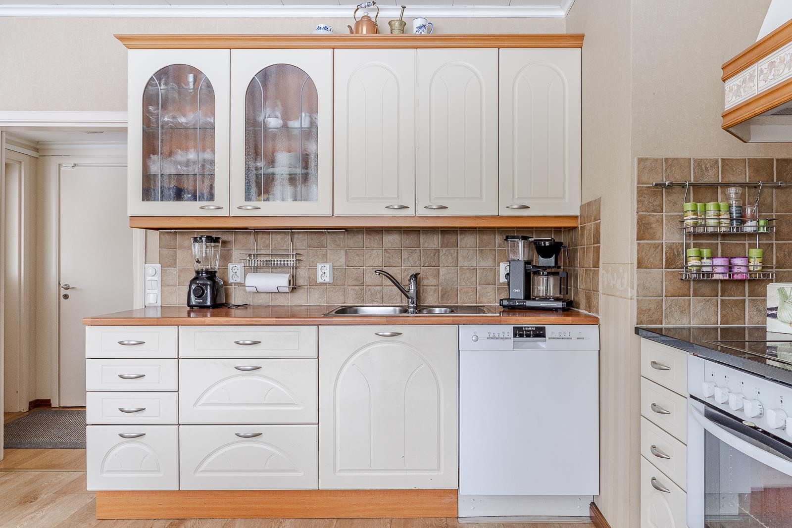 - Jääkaappi, jääkaappipakastin, pakastekaappi, keraaminen liesi, liesituuletin, astianpesukone, kaapistot, kiinteät valaisimet, pöytätasojen materiaali kivi.