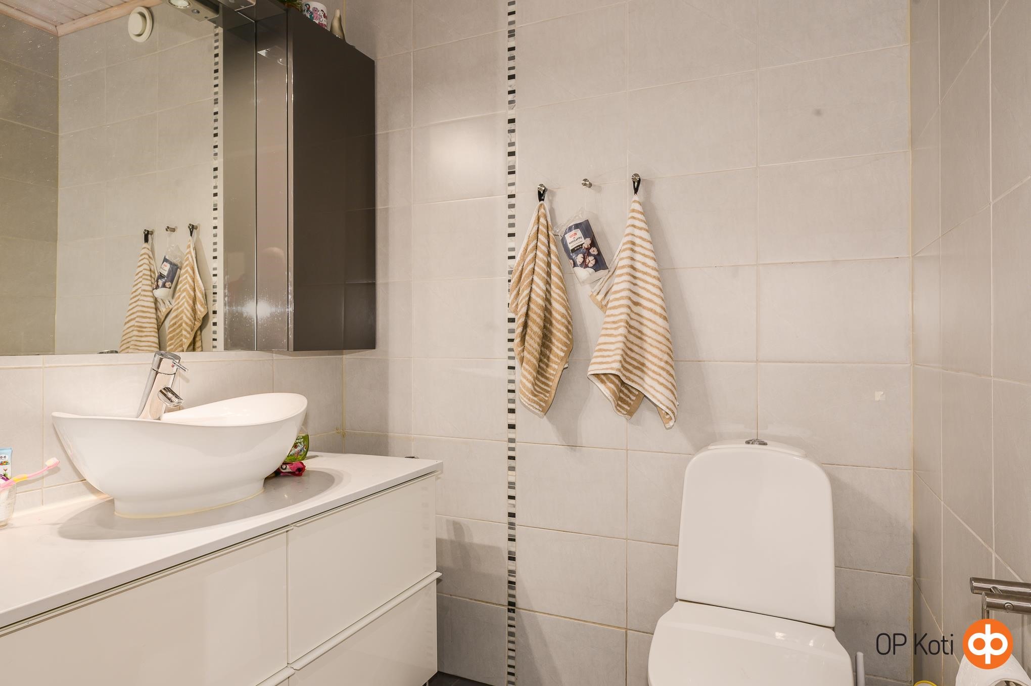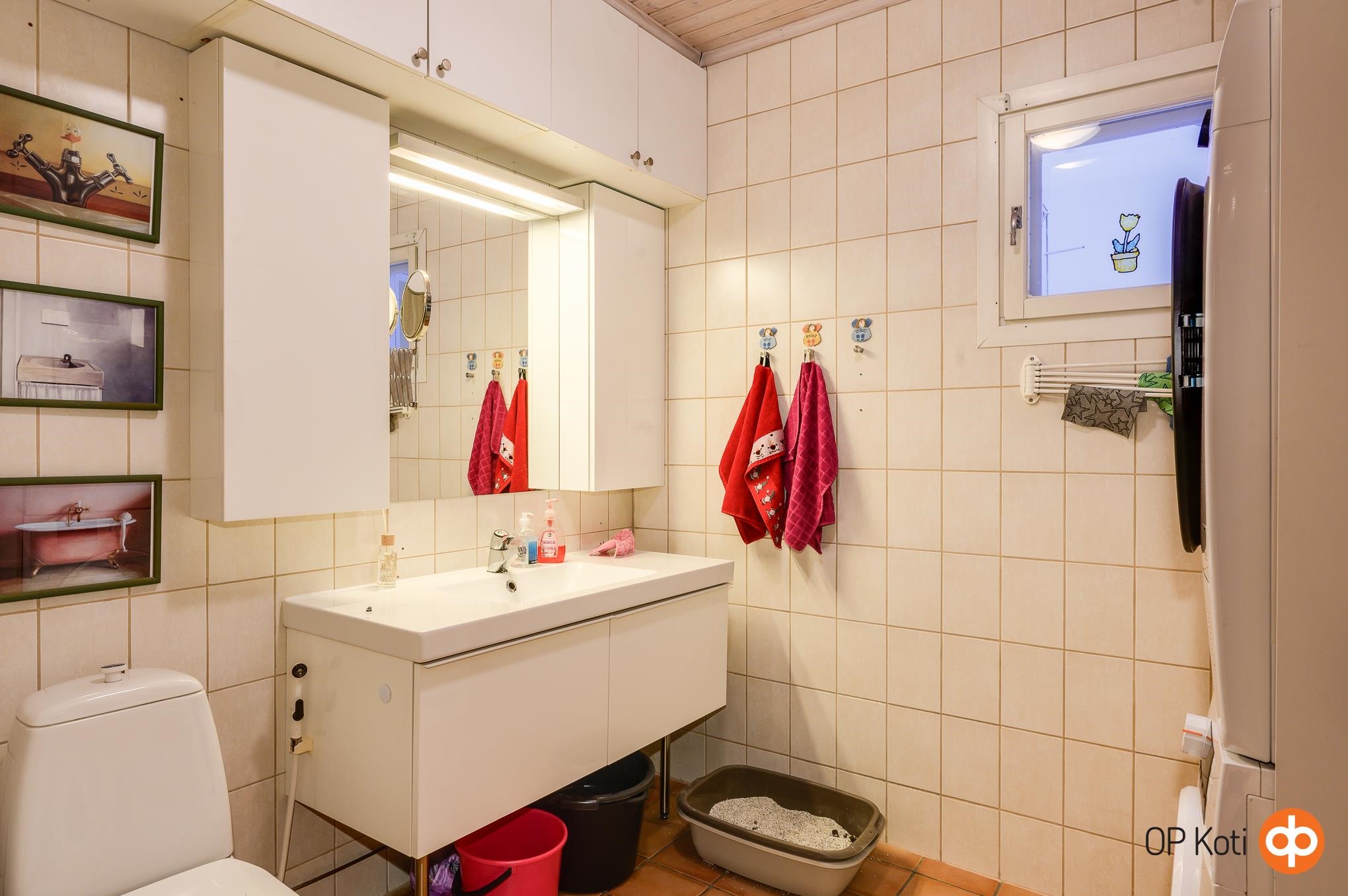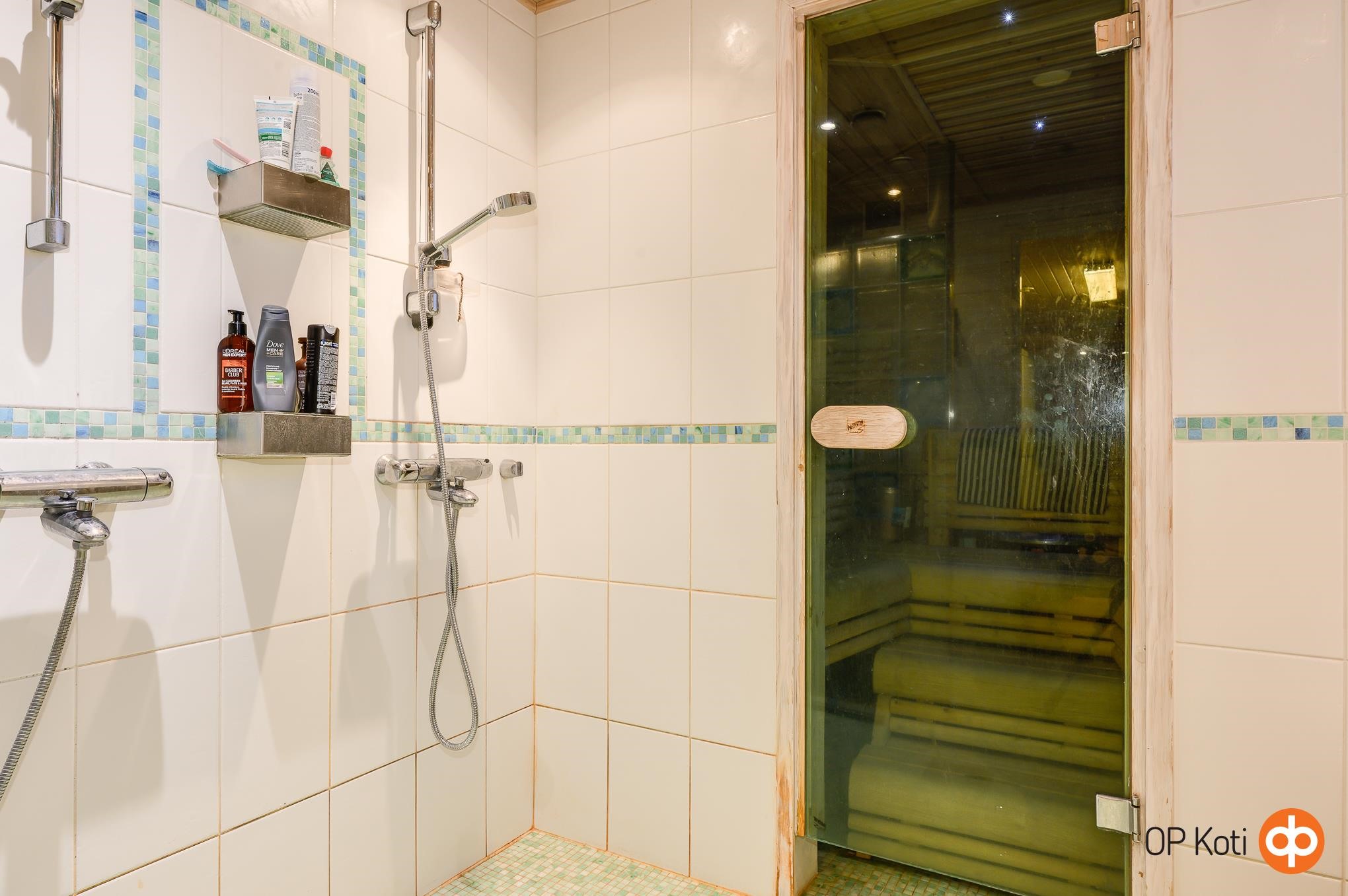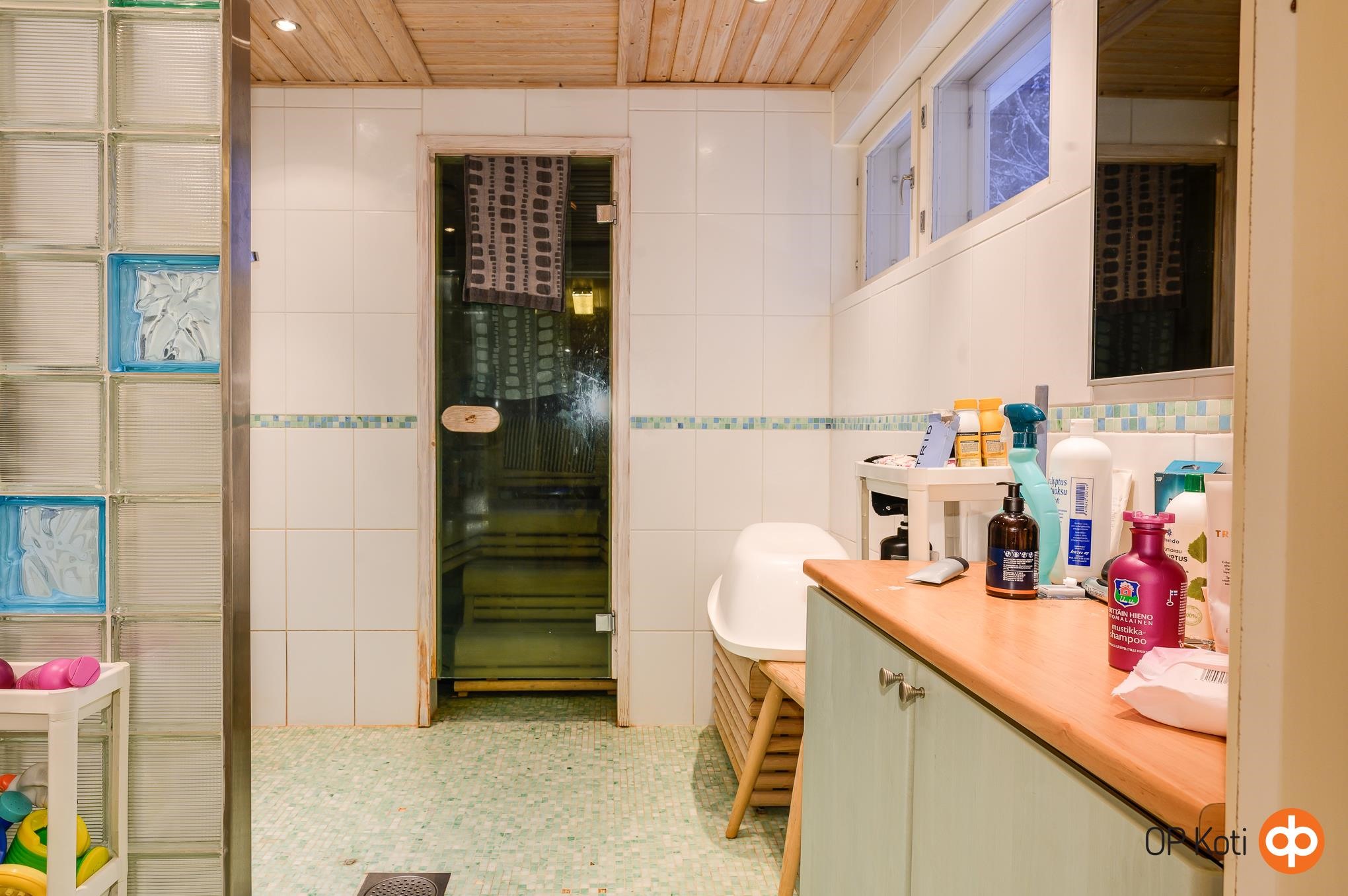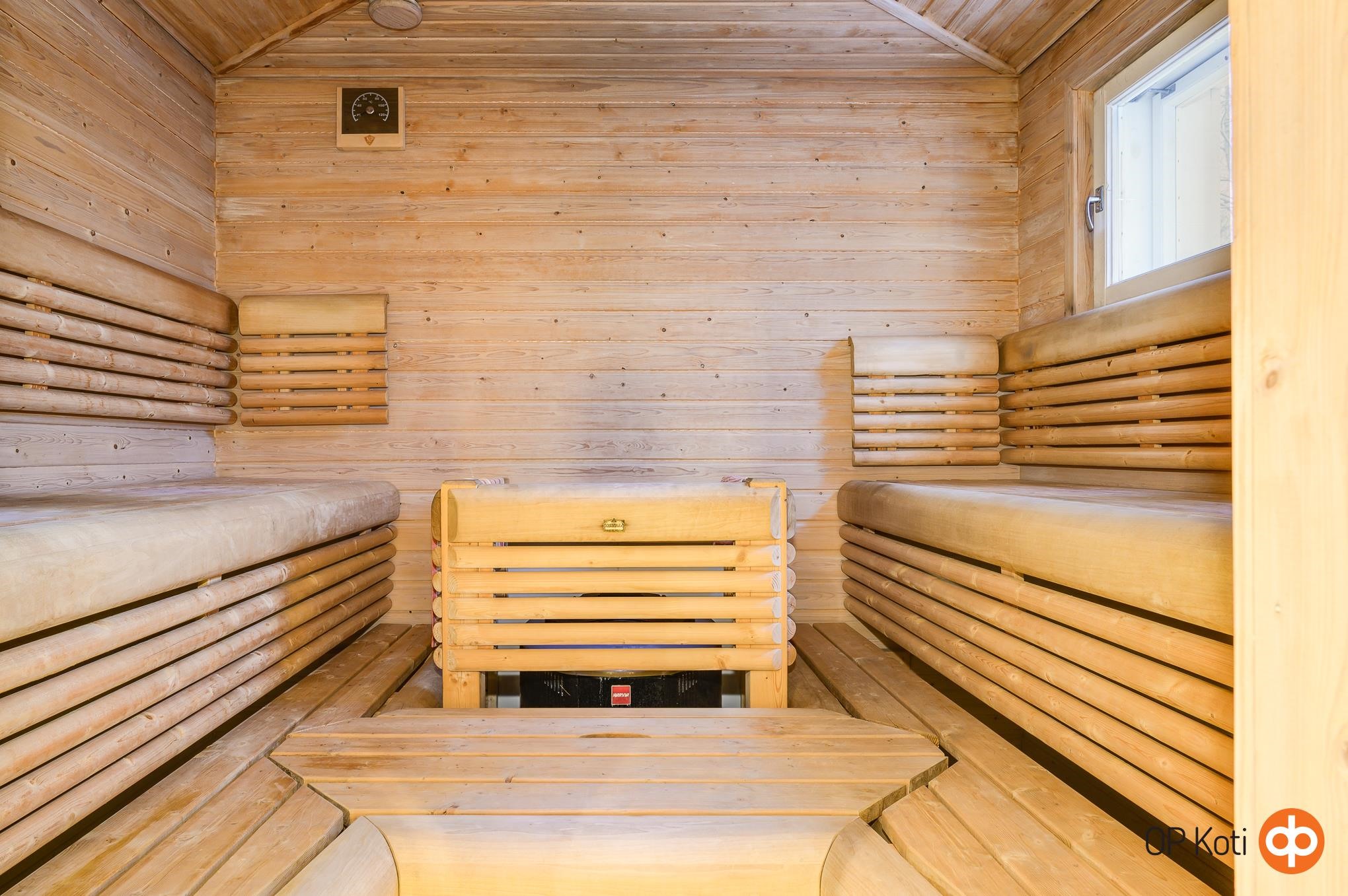 - Sauna, sähkökiuas, kylpyhuone, erillinen wc, suihku 2 kpl, suihkuseinä, peilikaappi, kaapit, allaskaappi, pesukoneliitäntä, lattialämmitys, kiinteät valaisimet.
