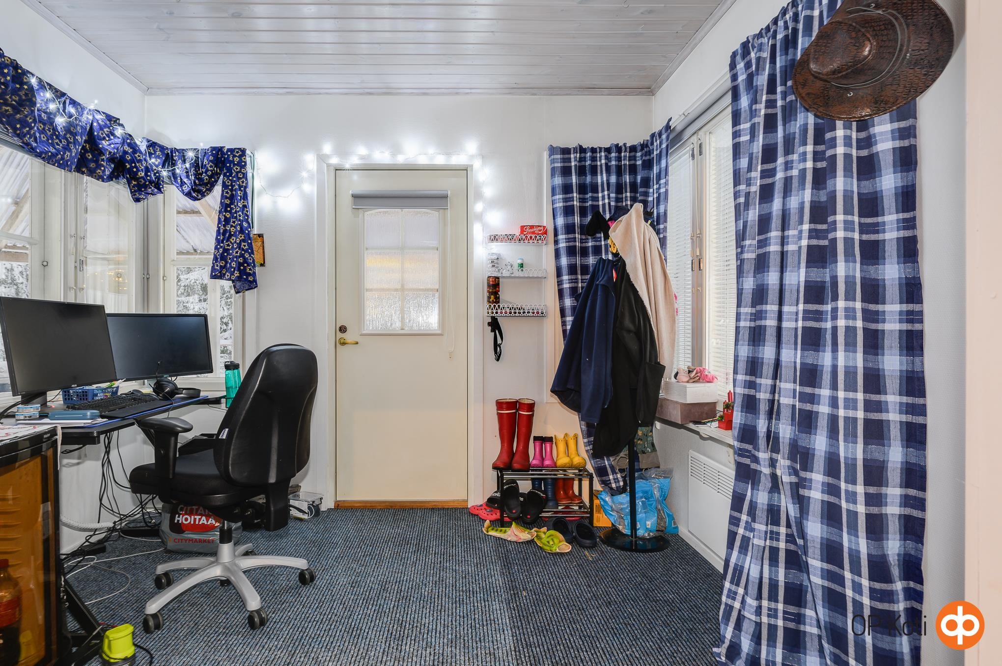 Keittiö: laatta/maalattavatapetti. Olohuone: parketti/tapetti. Makuuhuone 1: laminaatti/tapetti. Makuuhuone 2: laminaatti/maali. Makuuhuone 3: parketti/tapetti. Kodinhoitohuone: laatta/tapetti. Sauna: laatta/paneeli. Kylpyhuone: laattaa. Eteinen: laatta/maalattavatapetti. Wc: laatta. Työhuone: kokolattiamatto/tapetti. Wc 2: laatta.