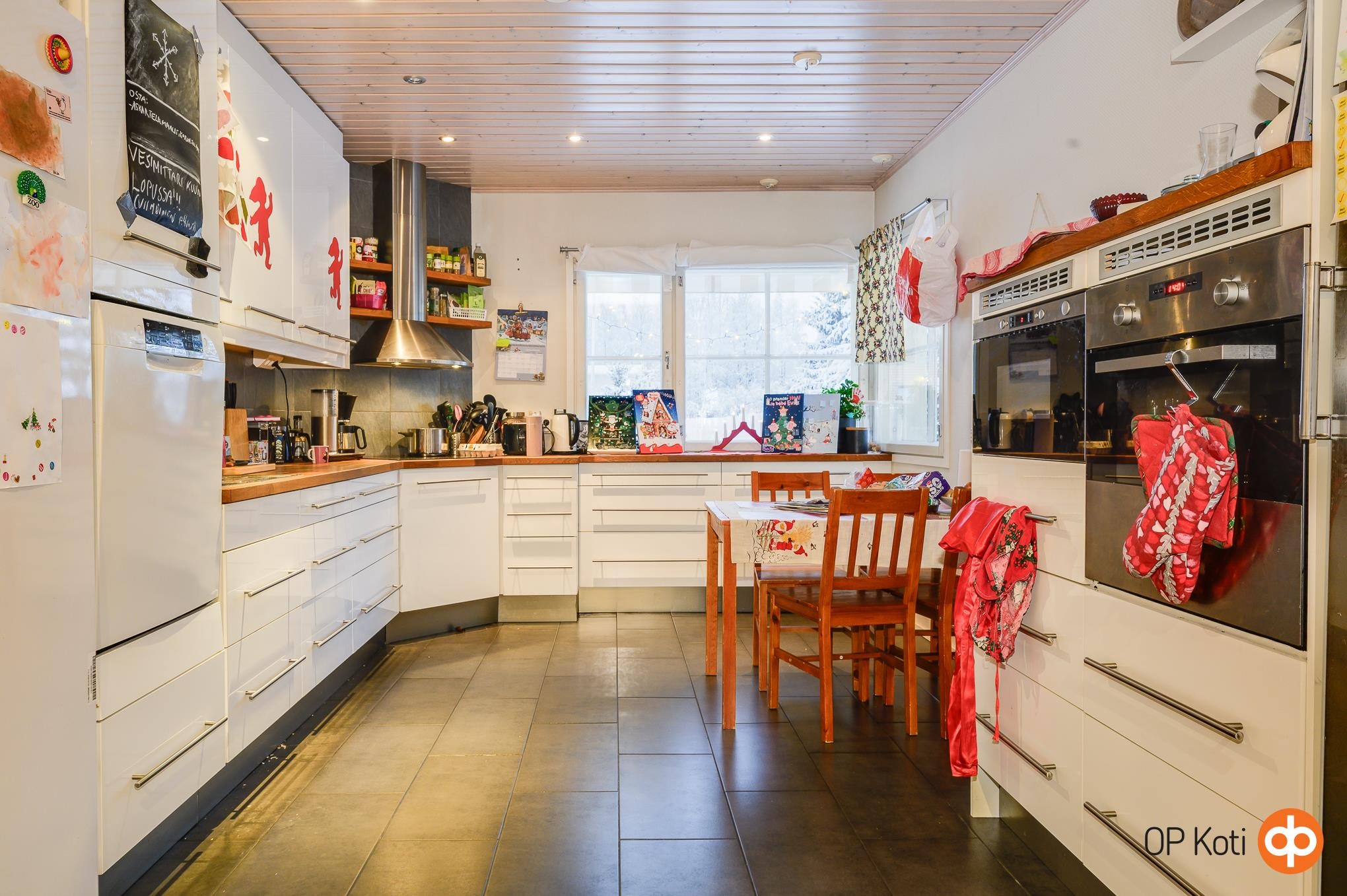 - Jääkaappi, jääkaappipakastin, erillisuuni, liesitaso, keraaminen liesi, liesituuletin, leivinuuni, mikroaaltouuni, astianpesukone, kaapistot, kiinteät valaisimet, pöytätasojen materiaali puu.