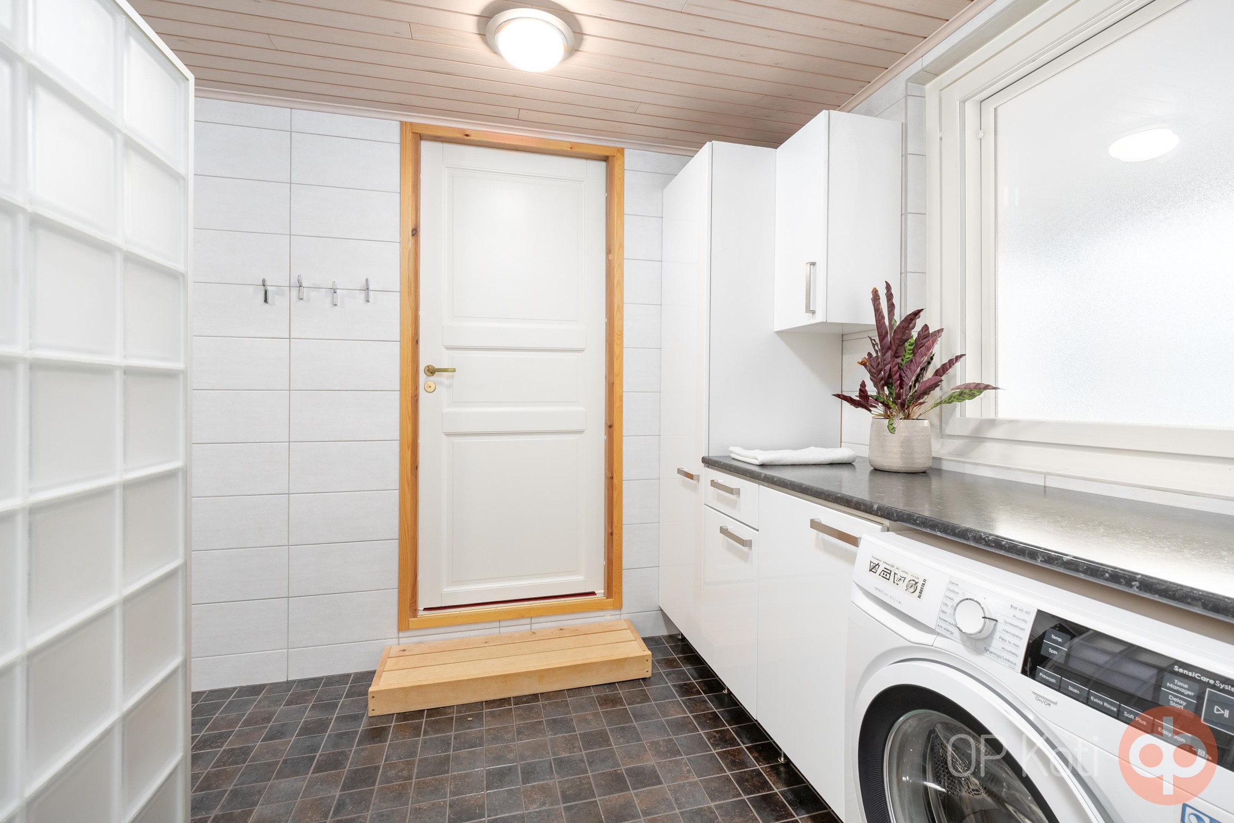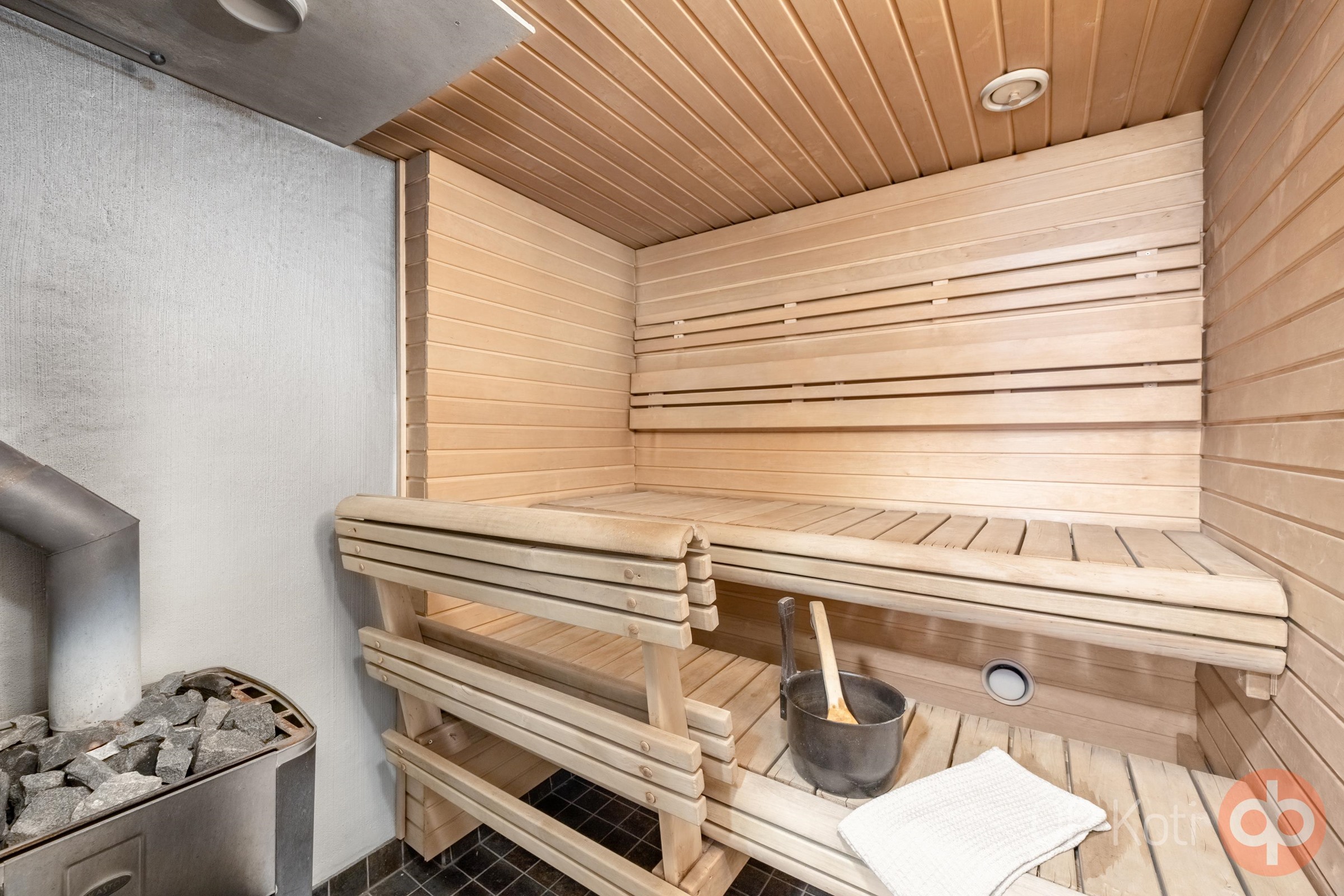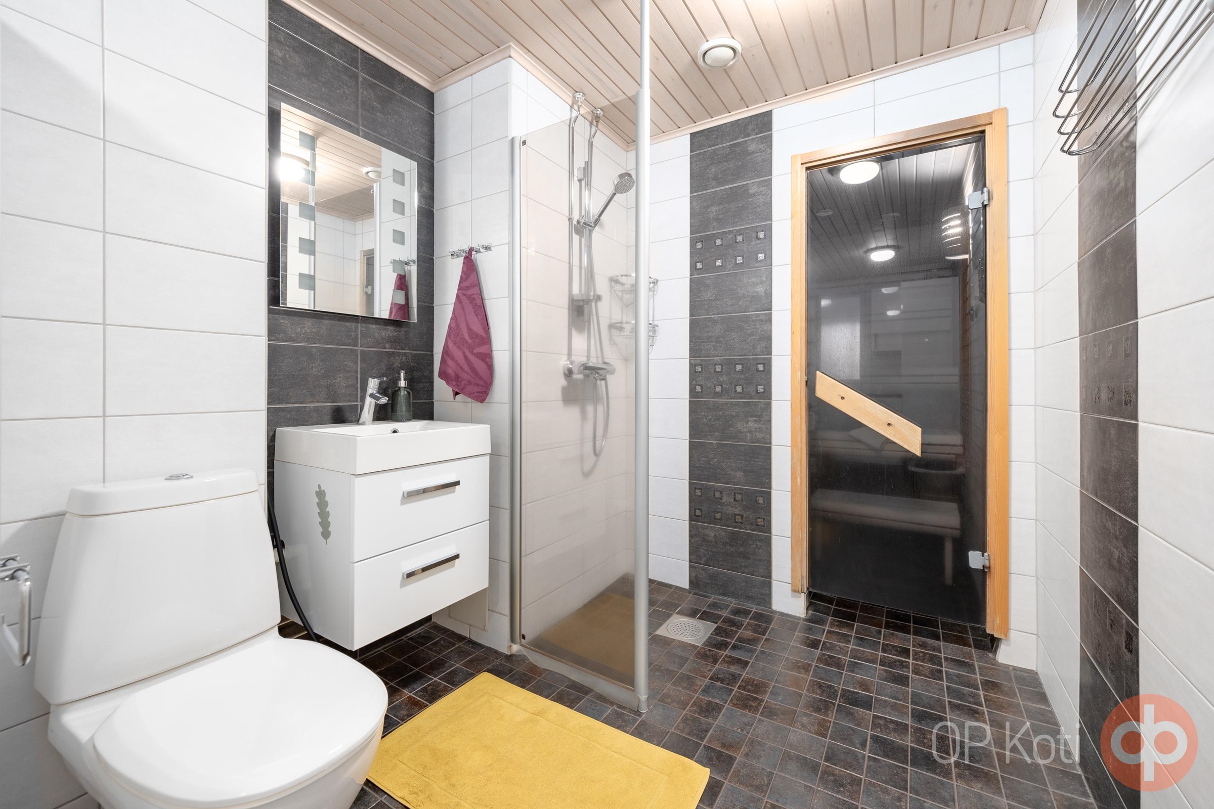 - Sauna, puukiuas, kylpyhuone, suihku, suihkuseinä, peilit, peilikaappi, allaskaappi, lattialämmitys.