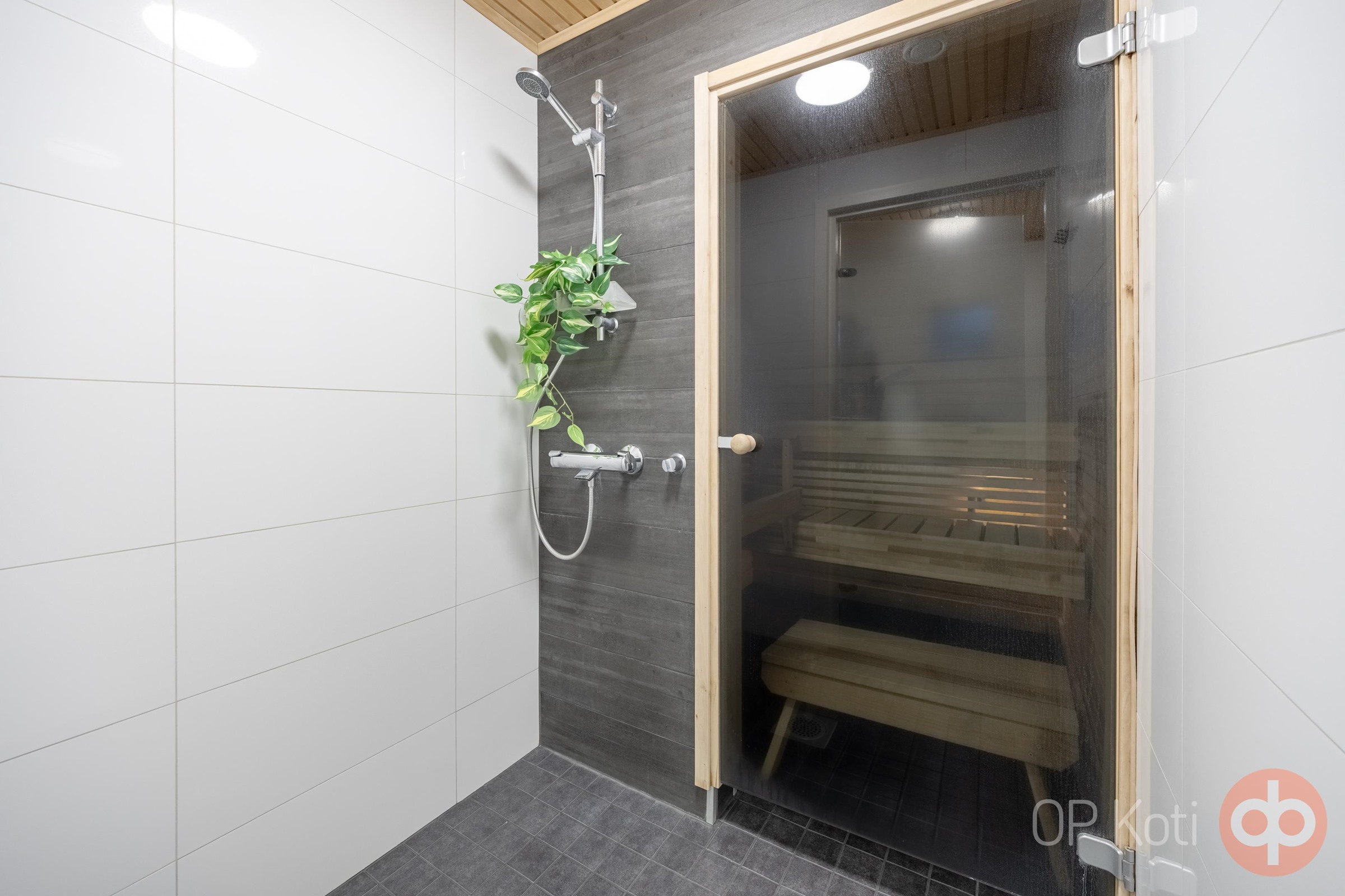 - Sauna, sähkökiuas, kylpyhuone, erillinen wc, suihku, peilikaappi, kaapit, allaskaappi, pesukoneliitäntä, lattialämmitys, kiinteät valaisimet.