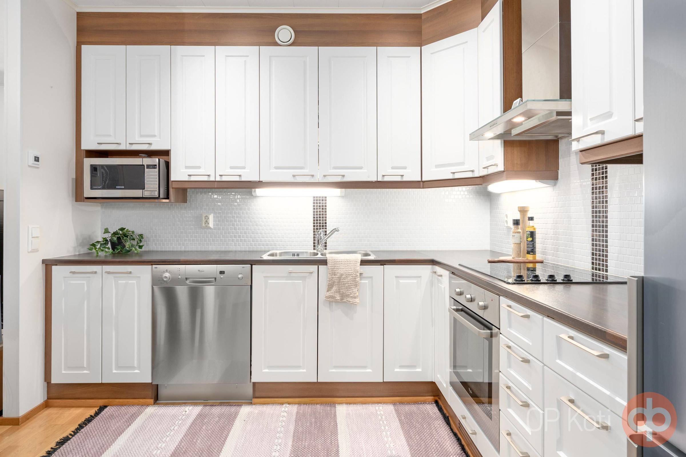 - Jääkaappipakastin, keraaminen liesi, liesituuletin, astianpesukone, kaapistot, kiinteät valaisimet.