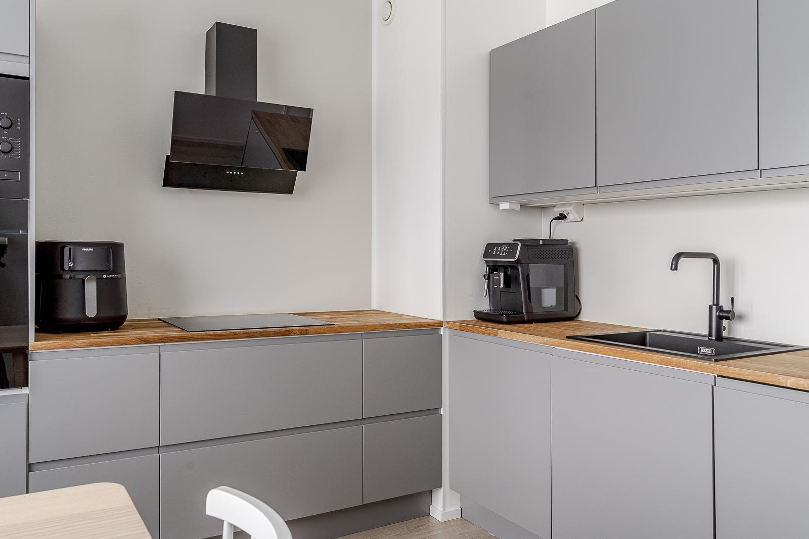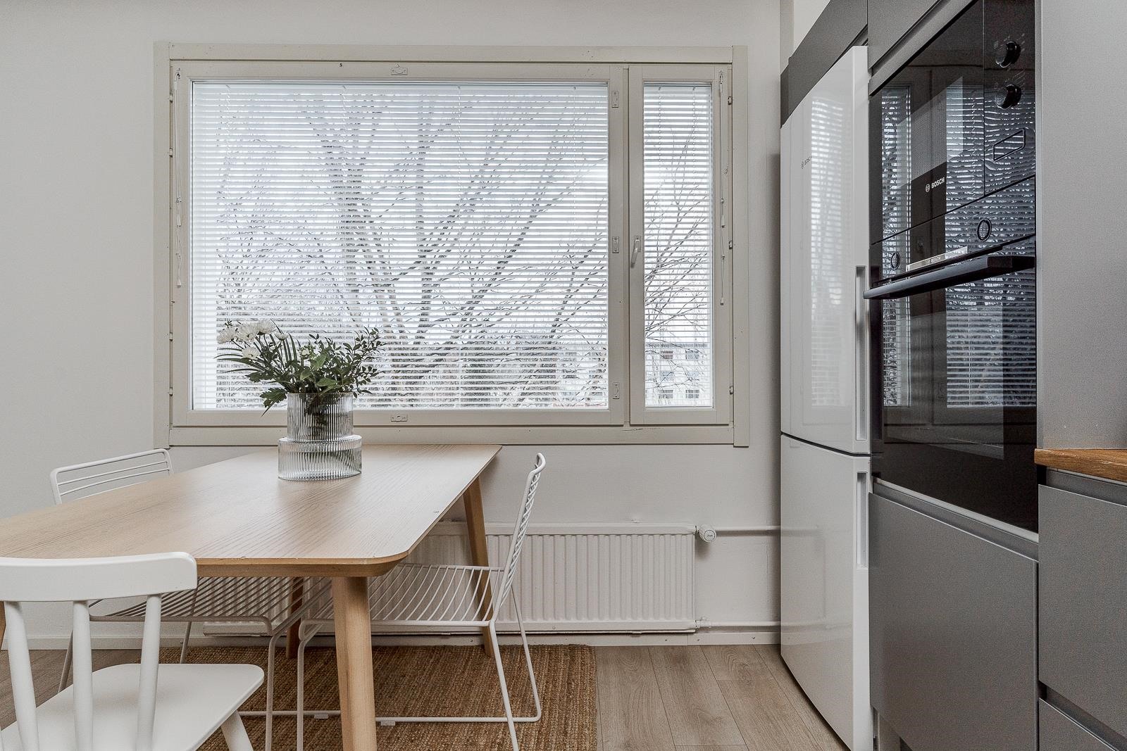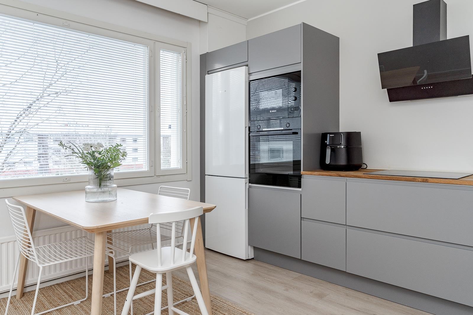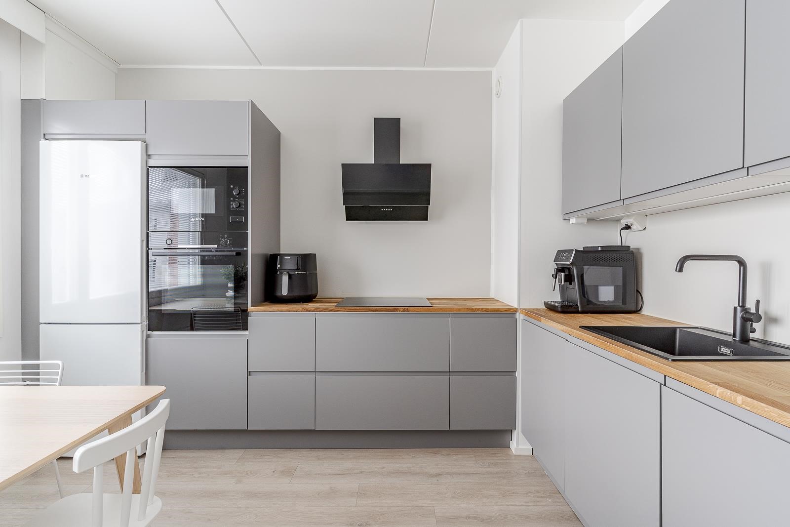 Keittiö kodinkoneineen ja huoneiston pinnat uusittiin 2021. Hyväkuntoinen koti, joten voit muuttaa ilman remonttihuolia. Kaikki pinnat ja keittiö on uusittu huolella, ja värimaailma luo tyylikkään ja rauhallisen tunnelman.