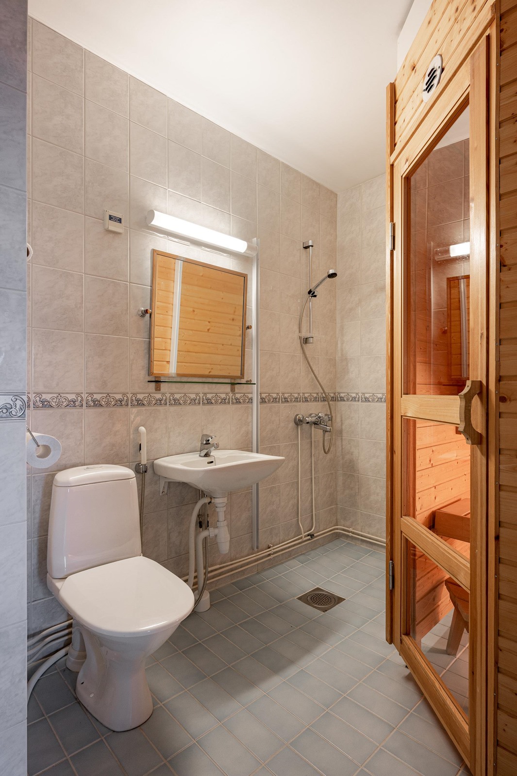 - Kylpyhuone: suihku, peilit, allaskaappi, pesukoneliitäntä. Sauna: sähkökius Sauna ei ole yhtiöjärjestyksen mukainen