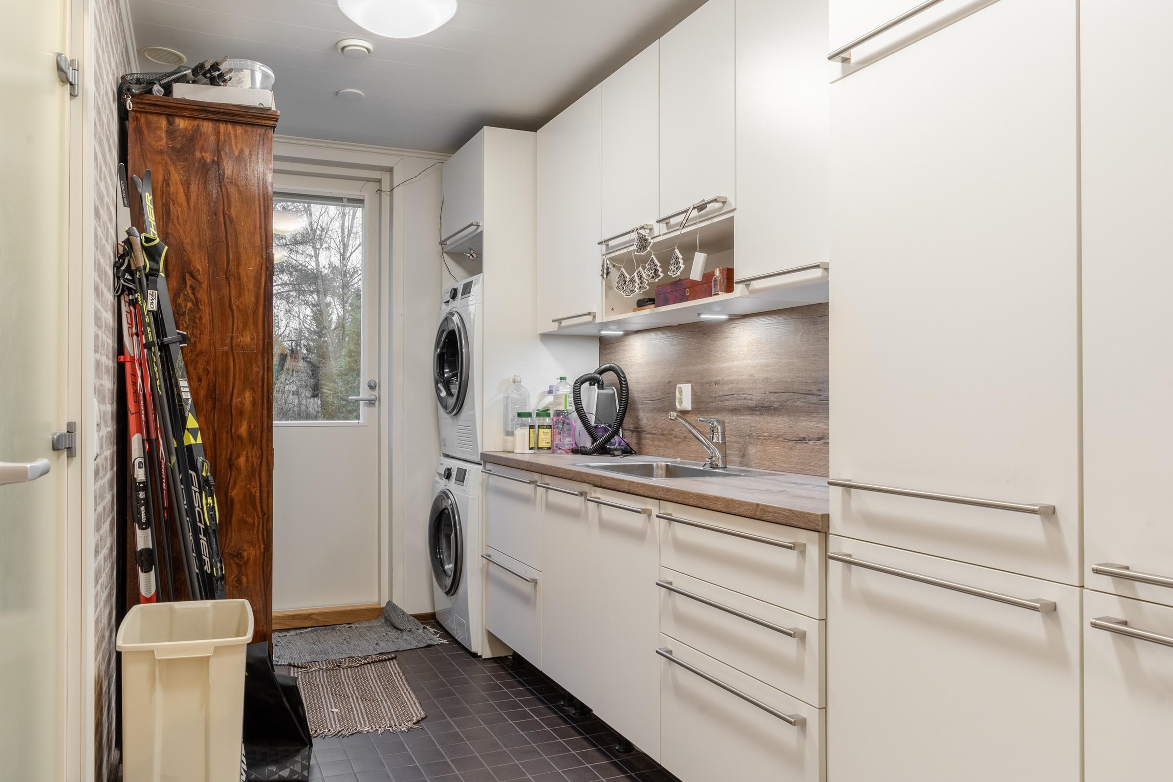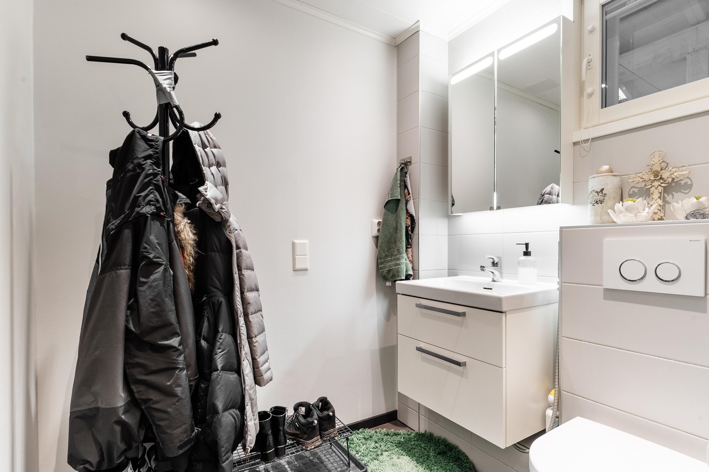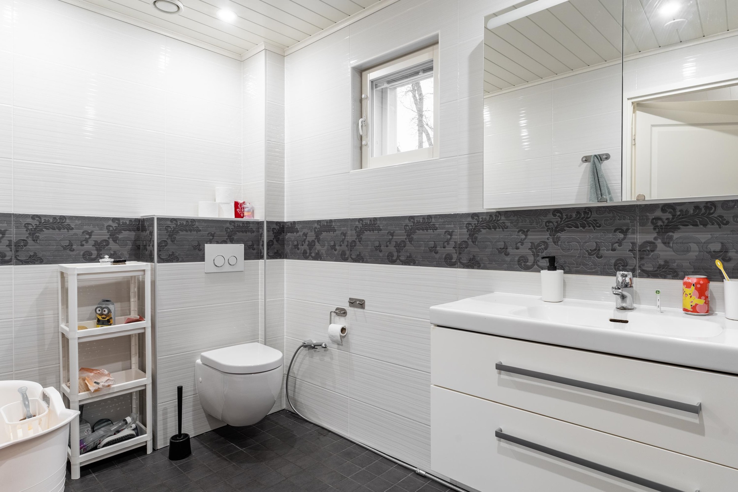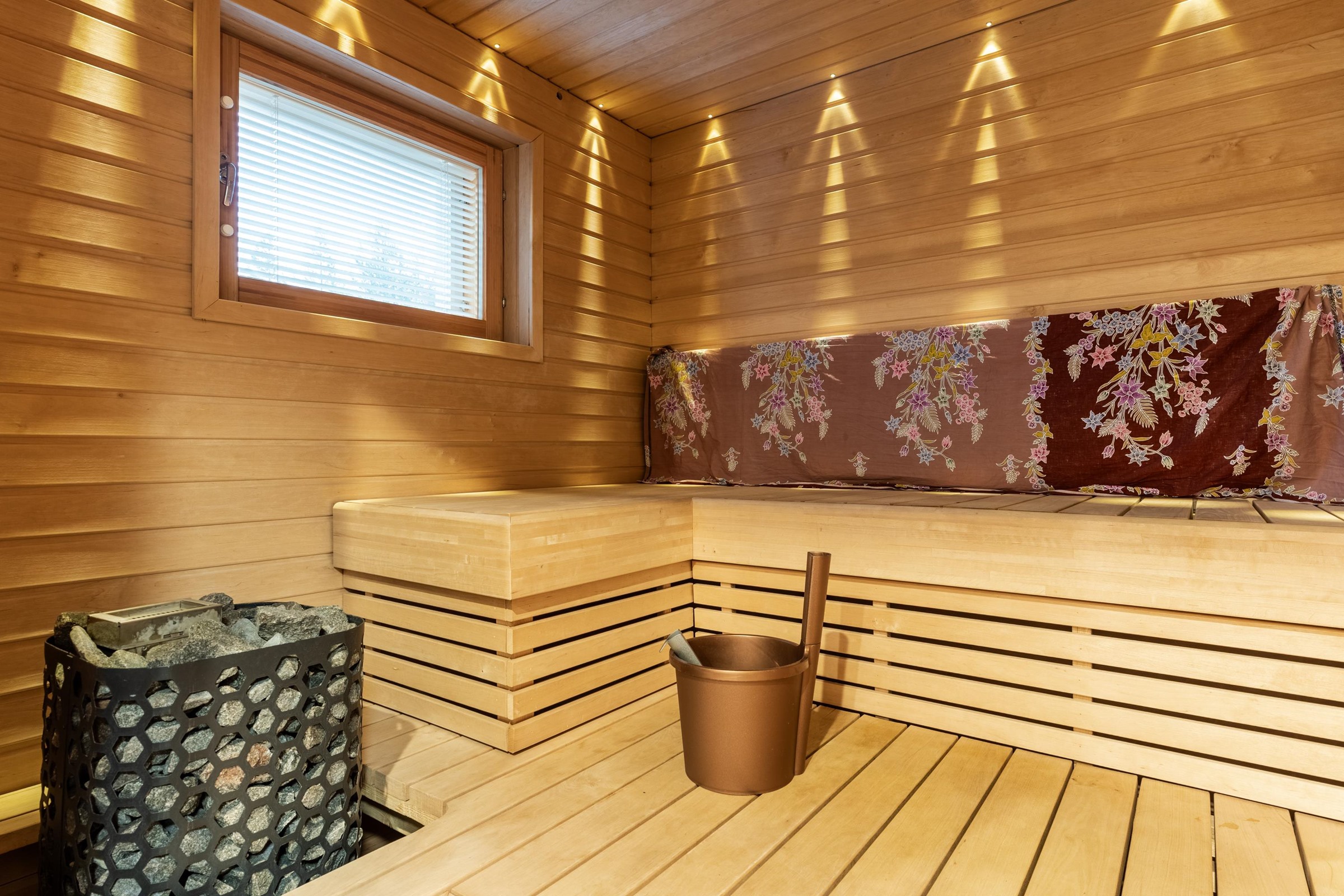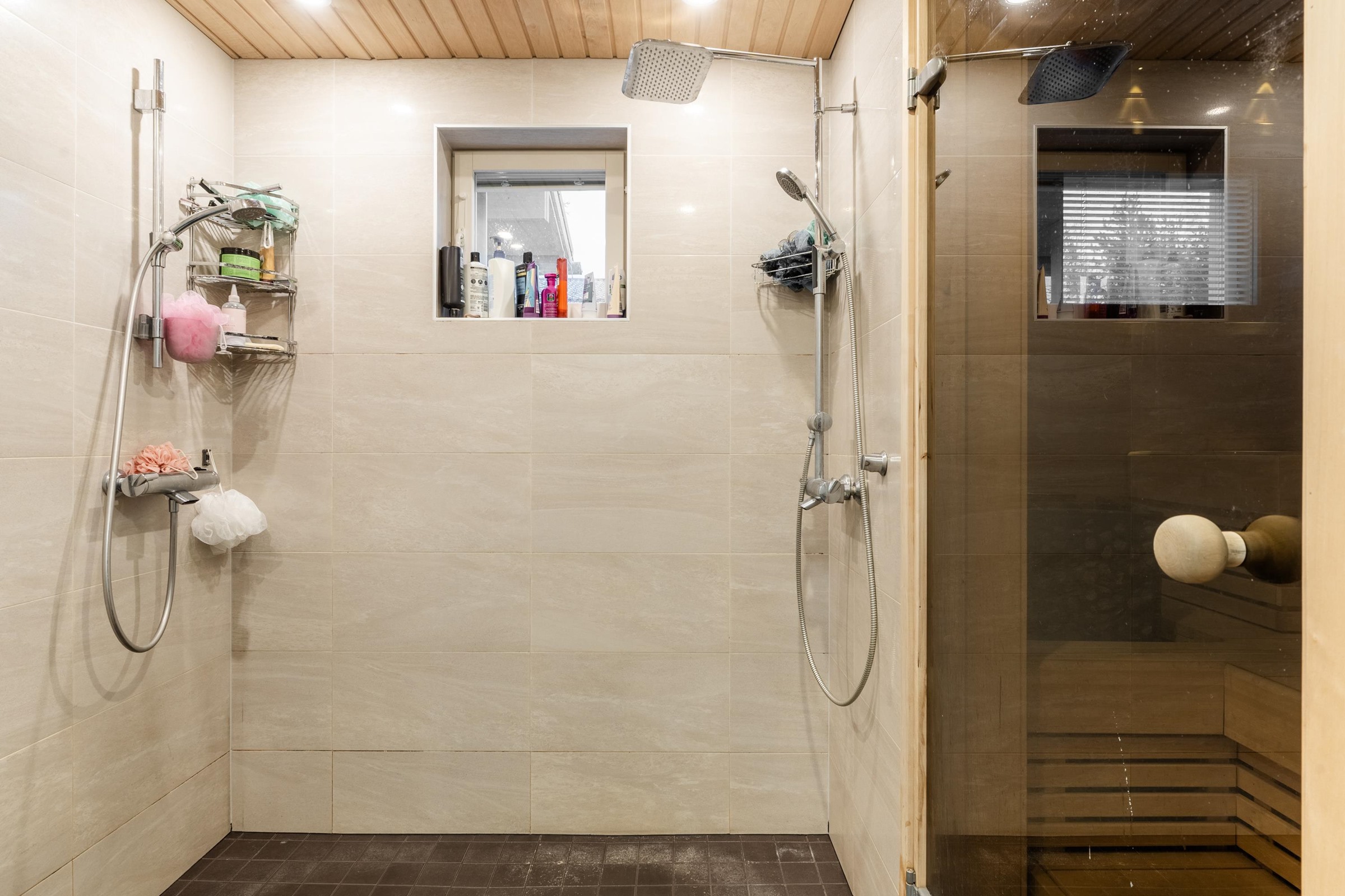 - Sauna, sähkökiuas, kylpyhuone, erillinen wc 2 kpl, suihku 3 kpl, peilikaappi, kaapit, allaskaappi, pesukoneliitäntä, lattialämmitys, kiinteät valaisimet.