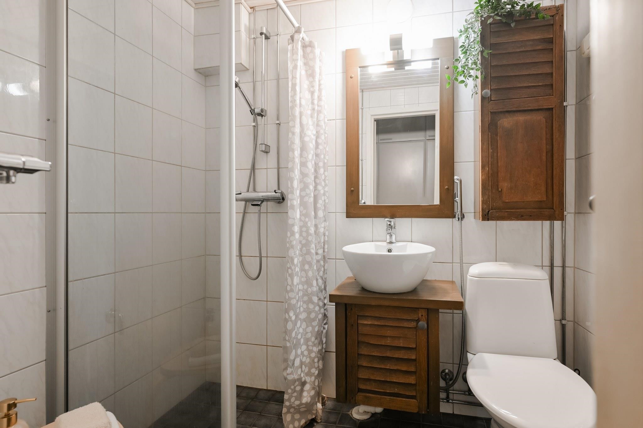 - Kylpyhuone, suihku, suihkuseinä, peilit, kaapit, allaskaappi, pesukoneliitäntä, kiinteät valaisimet. Kph on remointoitu 2011 käyttö- ja viemäriverkosto remontin yhteydessä.