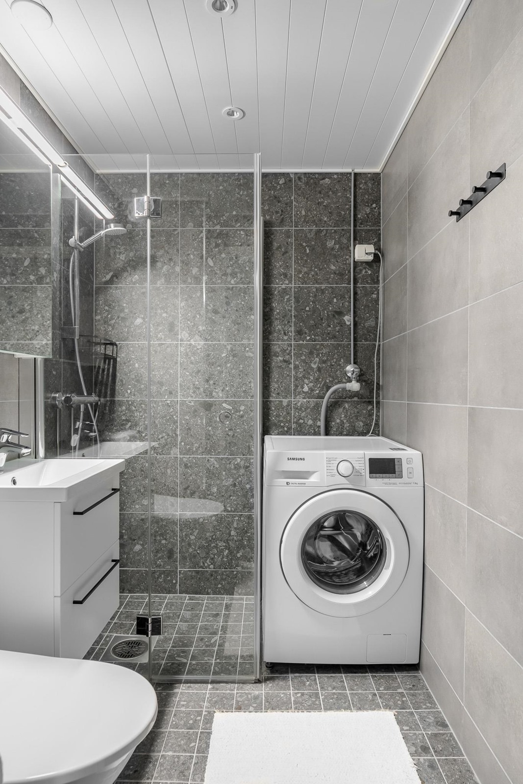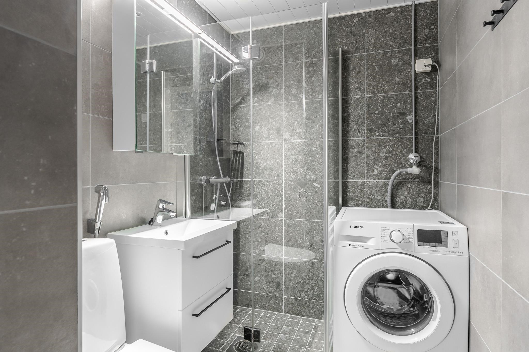 - Kylpyhuone, suihku, suihkuseinä, peilikaappi, allaskaappi, pesukoneliitäntä, lattialämmitys.