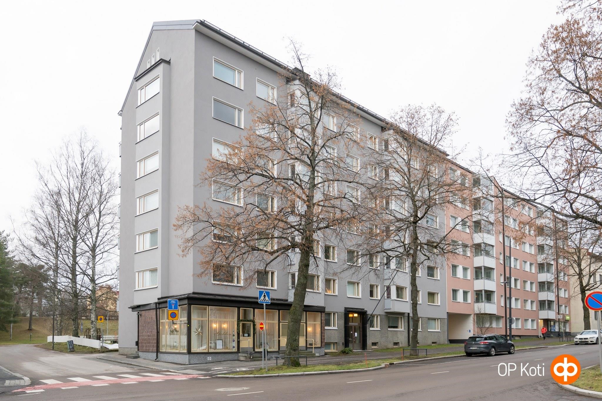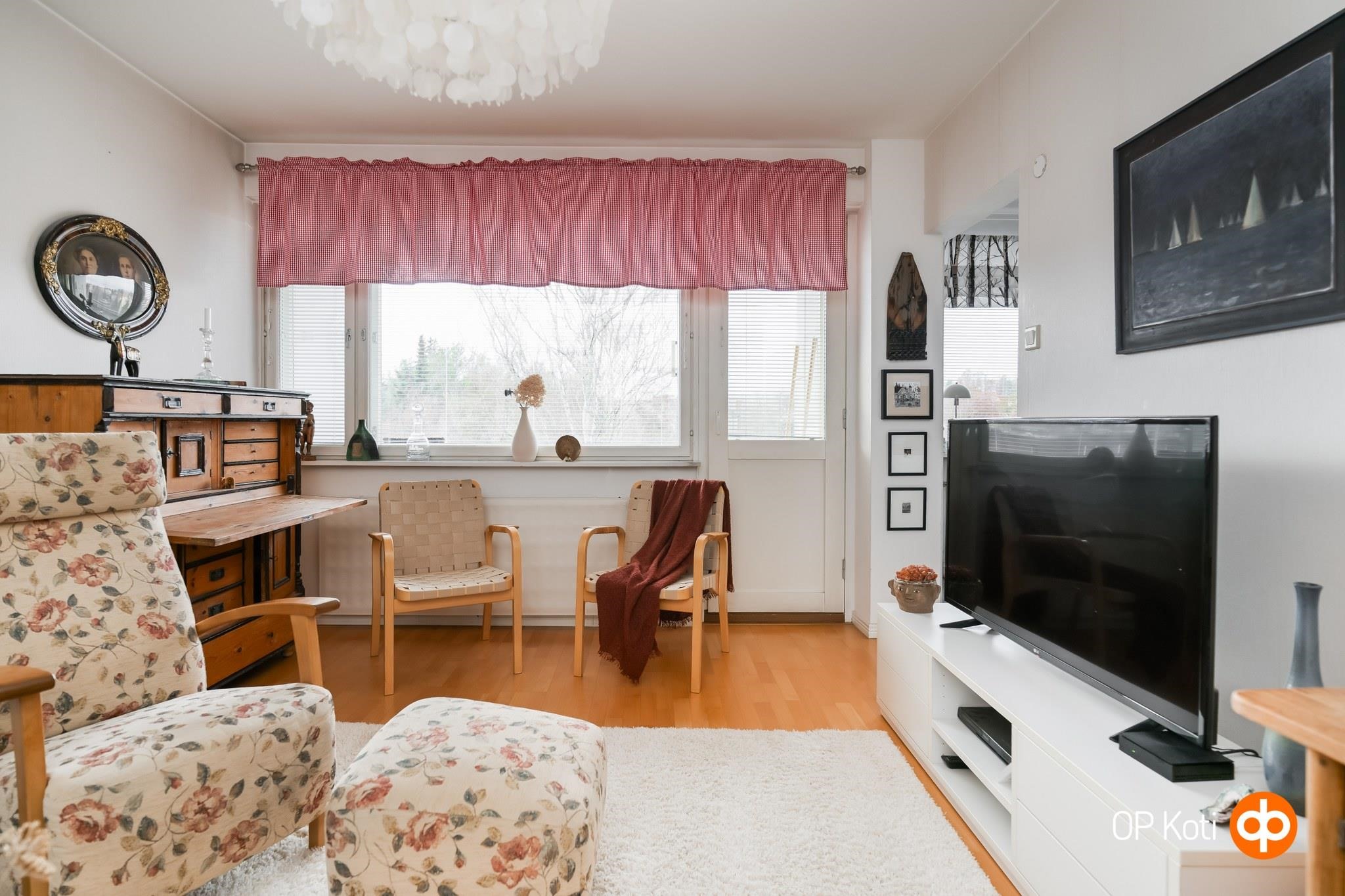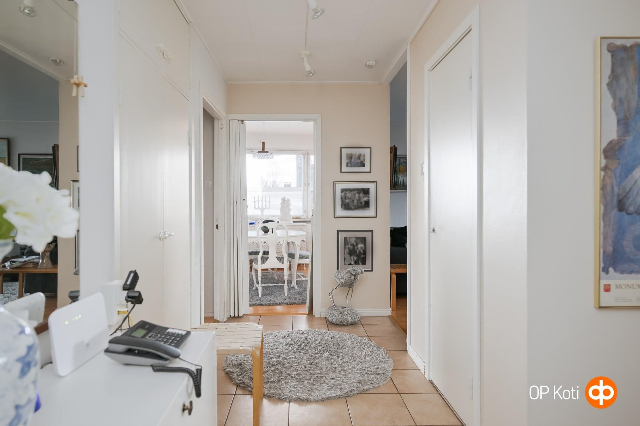 Tämä siistikuntoinen 6/7 kerroksen koti on sellaisenaan valmis uusille asukkaille. Olohuone yhdistyy sujuvasti keittiöön ja molemmista on näkymät Tellervonpuistoon. Asunto sijaitsee talon päädyssä, joten valoa kotiin tulee kolmesta suunnasta. Kahdesta makuuhuoneesta pienempi toimii tällä hetkellä ruokailutilana - mahdollisuuksia on muuntaa tila tarpeen mukaan; työ- tai harrastushuoneeksi, vierashuoneeksi tai perheen juniorin omaksi huoneeksi. Kylpyhuone on remontoitu linjasaneerauksen yhteydessä vuonna 2015.