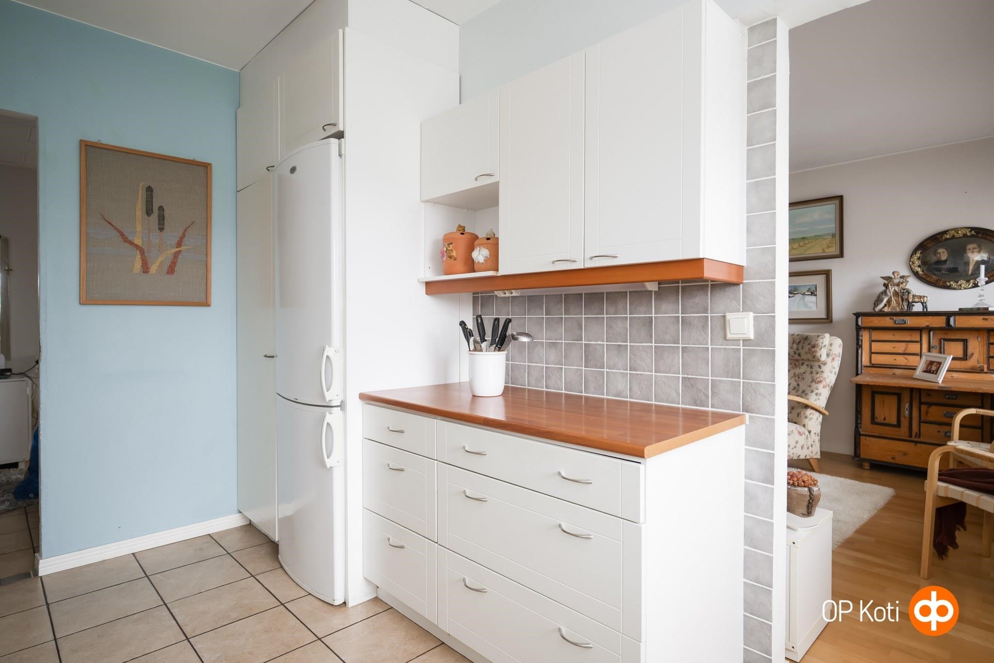Keittiö: Lattia laattaa, seinät maalattu, välitilassa laatta. Olohuone: Lattia parkettia, seinät maalattu/tapetoitu. Makuuhuone 1: Lattia parkettia, seinät tapetoitu. Makuuhuone 2: Lattia parkettia, seinät maalattu. Kylpyhuone: Lattia ja seinät laattaa. Eteinen: Lattia laattaa, seinät maalattu.