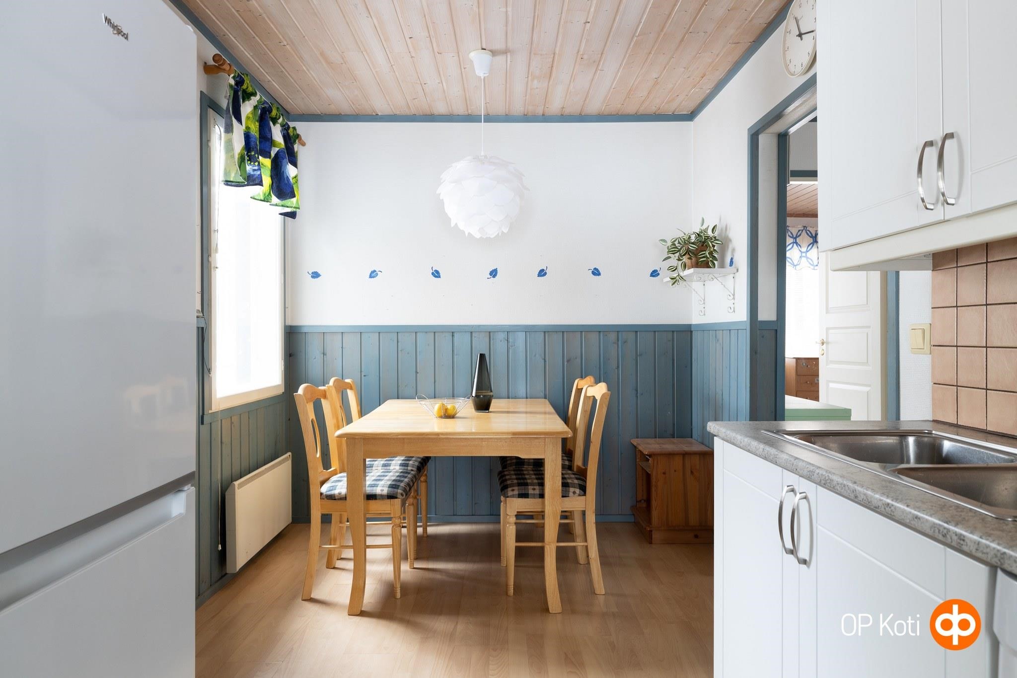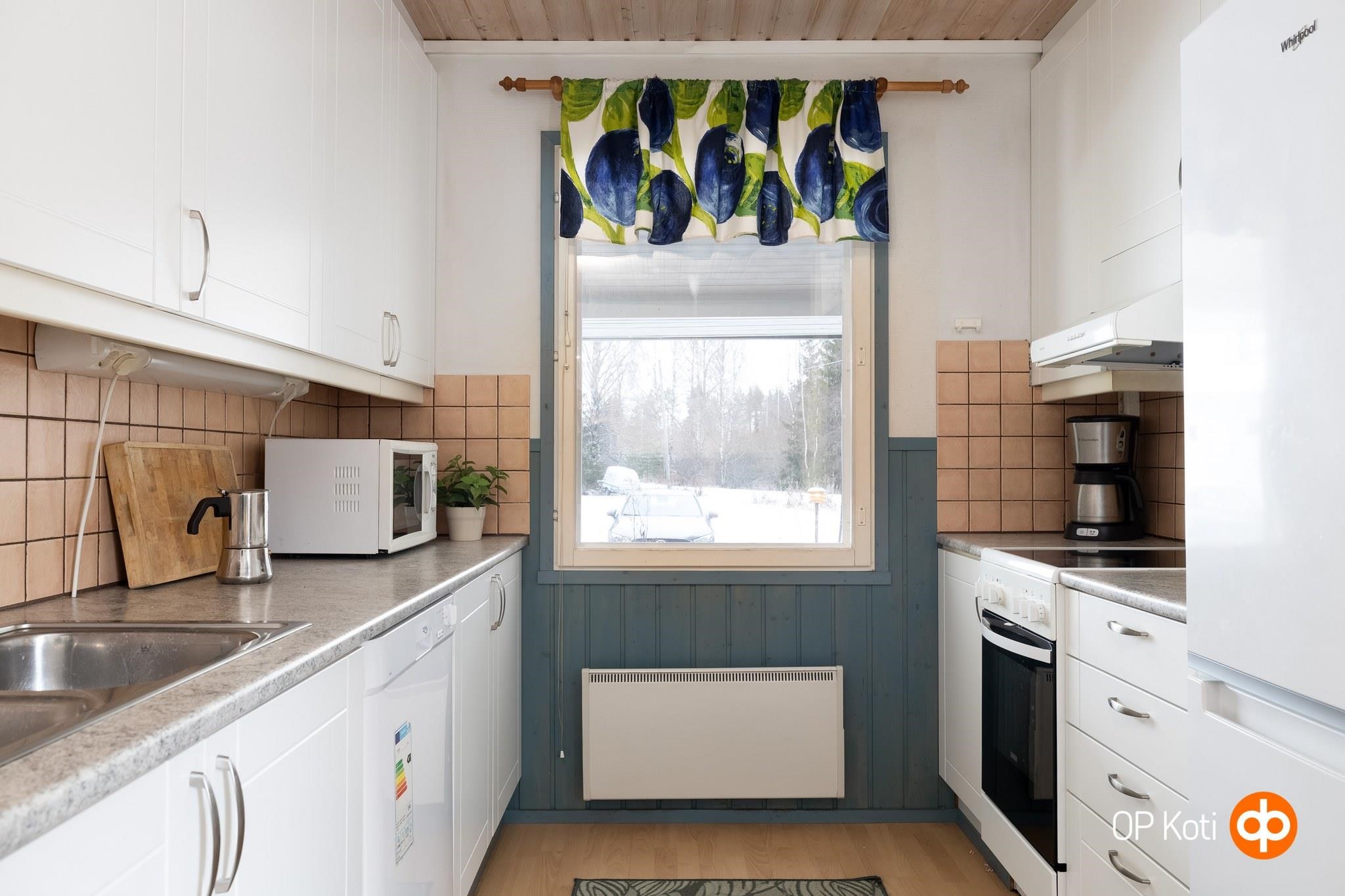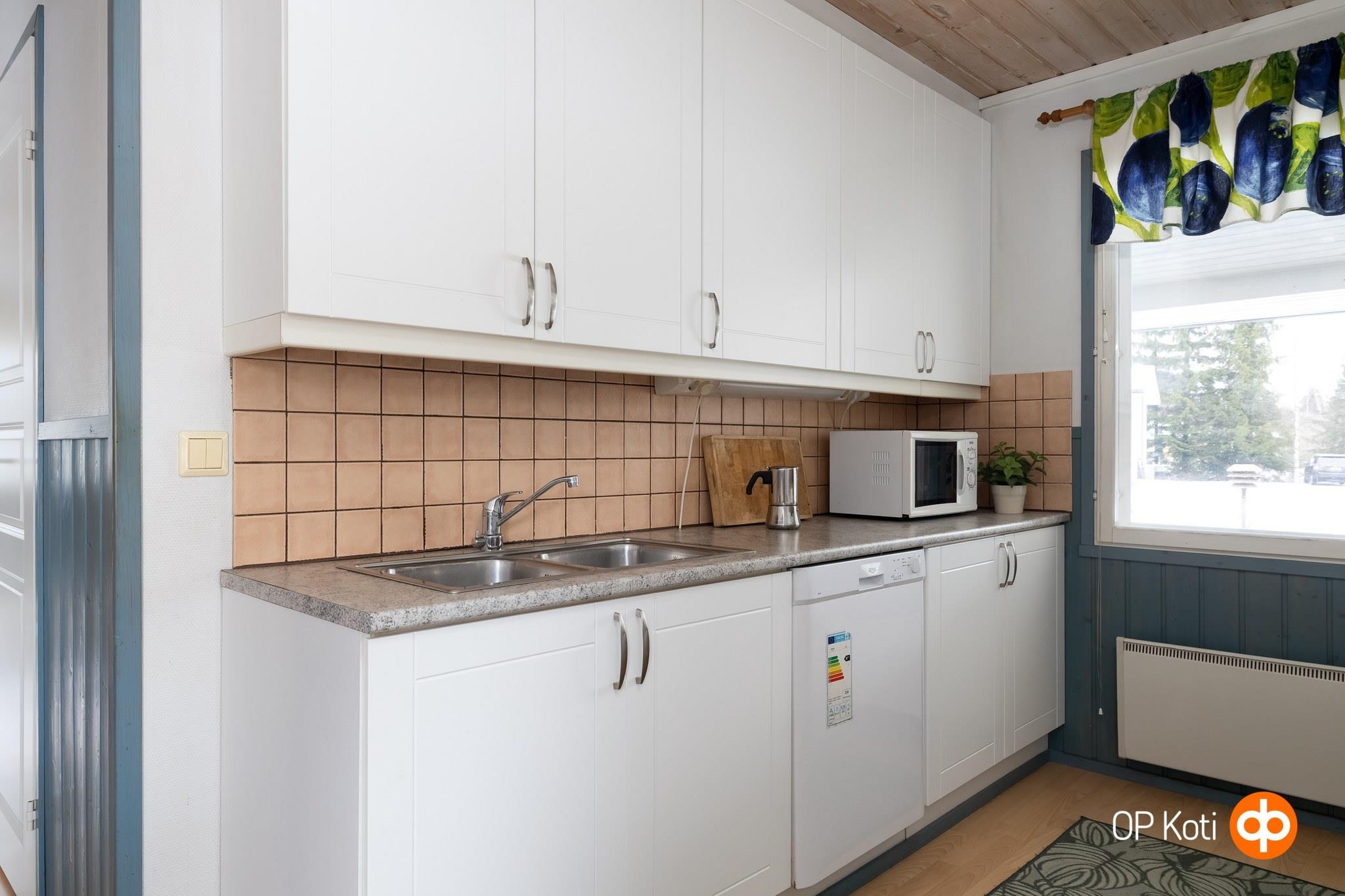 - Jääkaappipakastin, keraaminen liesi, liesituuletin, leivinuuni, astianpesukone, kaapistot, pöytätasojen materiaali laminaatti. Keittiön kaapistojen ovet uusittu 2025