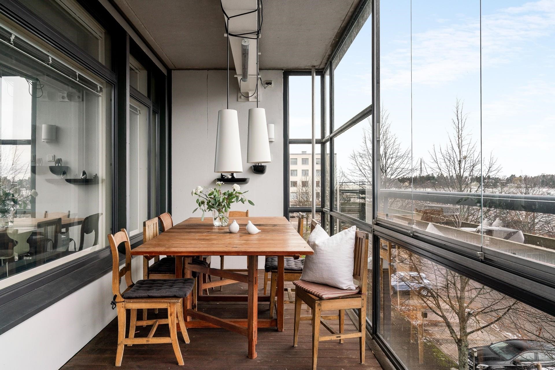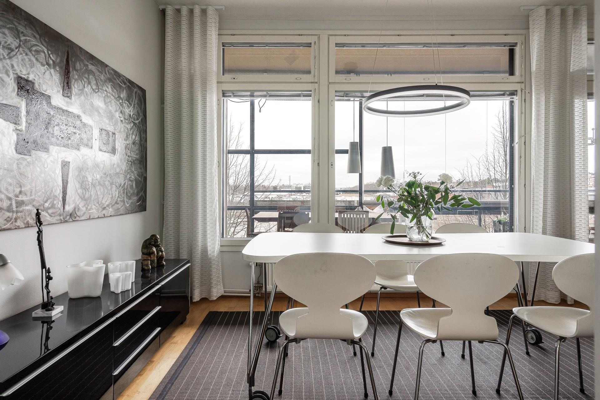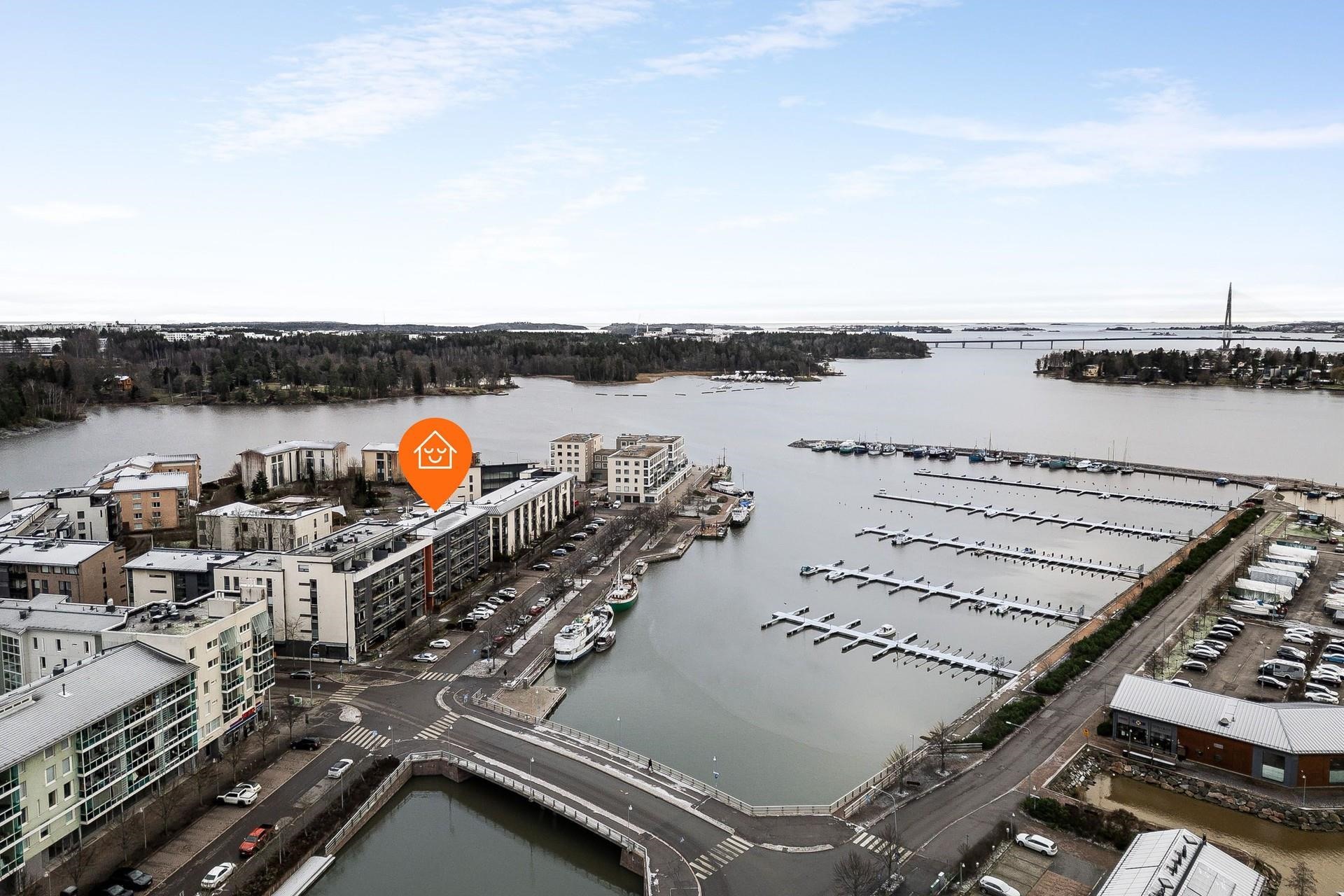 Tämän kodin keskiössä on upea olohuone-ruokailutila, jonka suuret ikkunat avautuvat länteen merelle ja venesatamaan. Tilaa jatkaa koko huoneiston levyinen parveke, jossa voit nauttia unohtumattomista auringonlaskuista. Keittiö on hyvin varusteltu ja tilava.