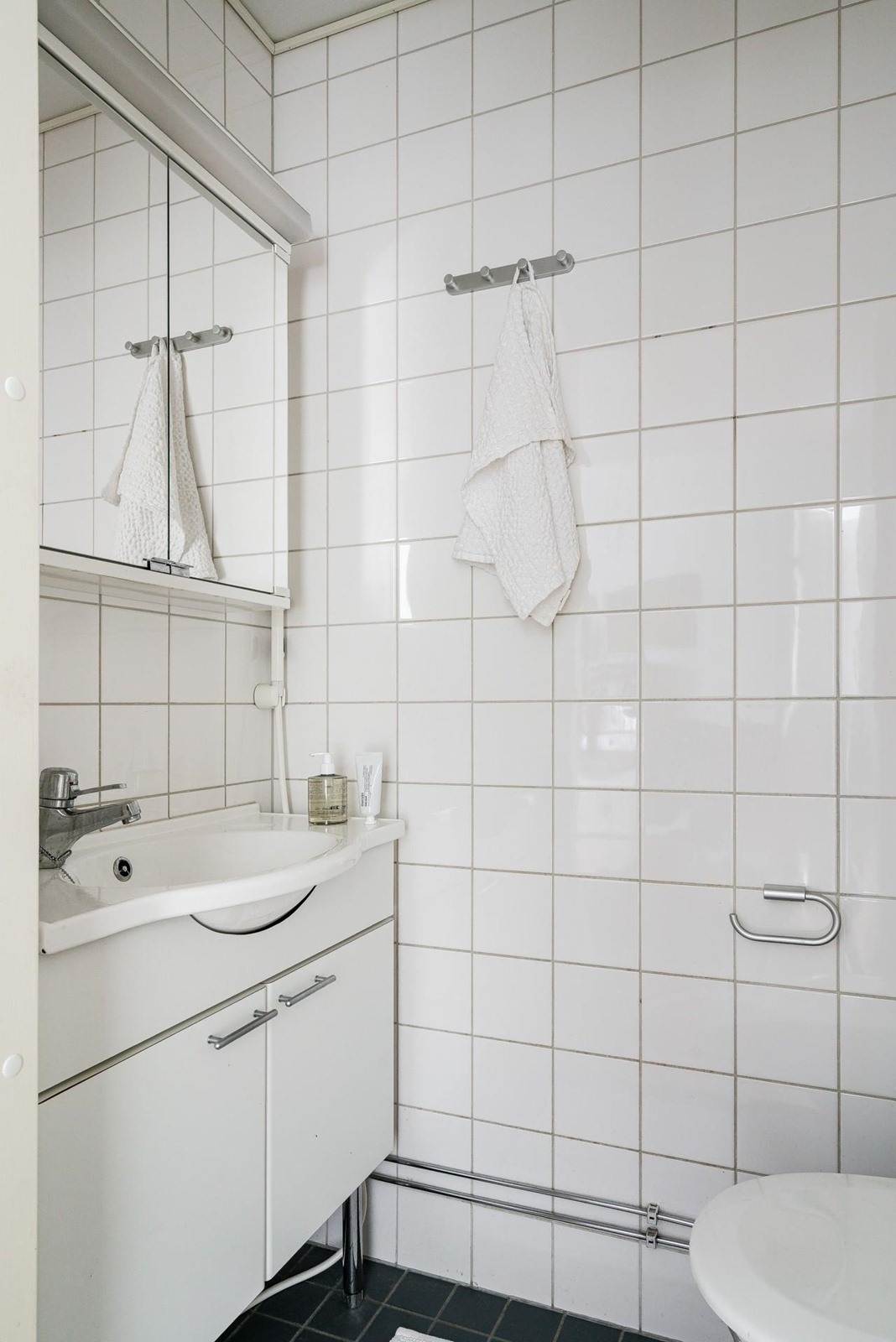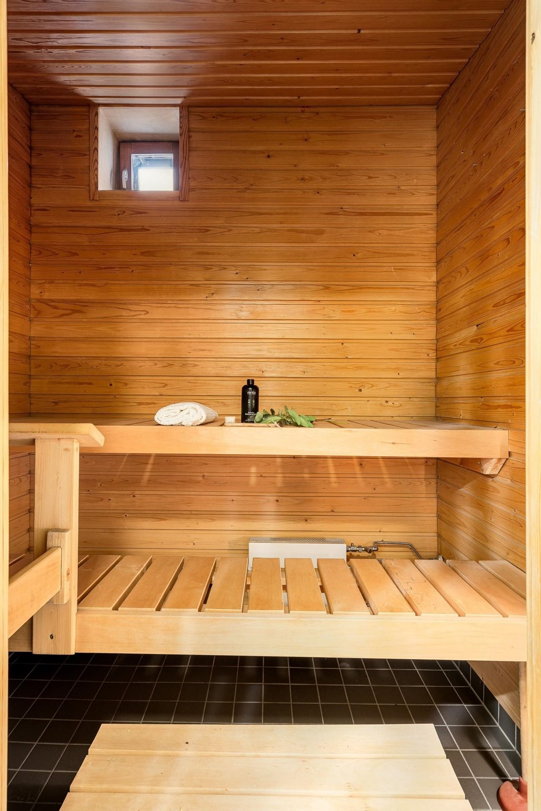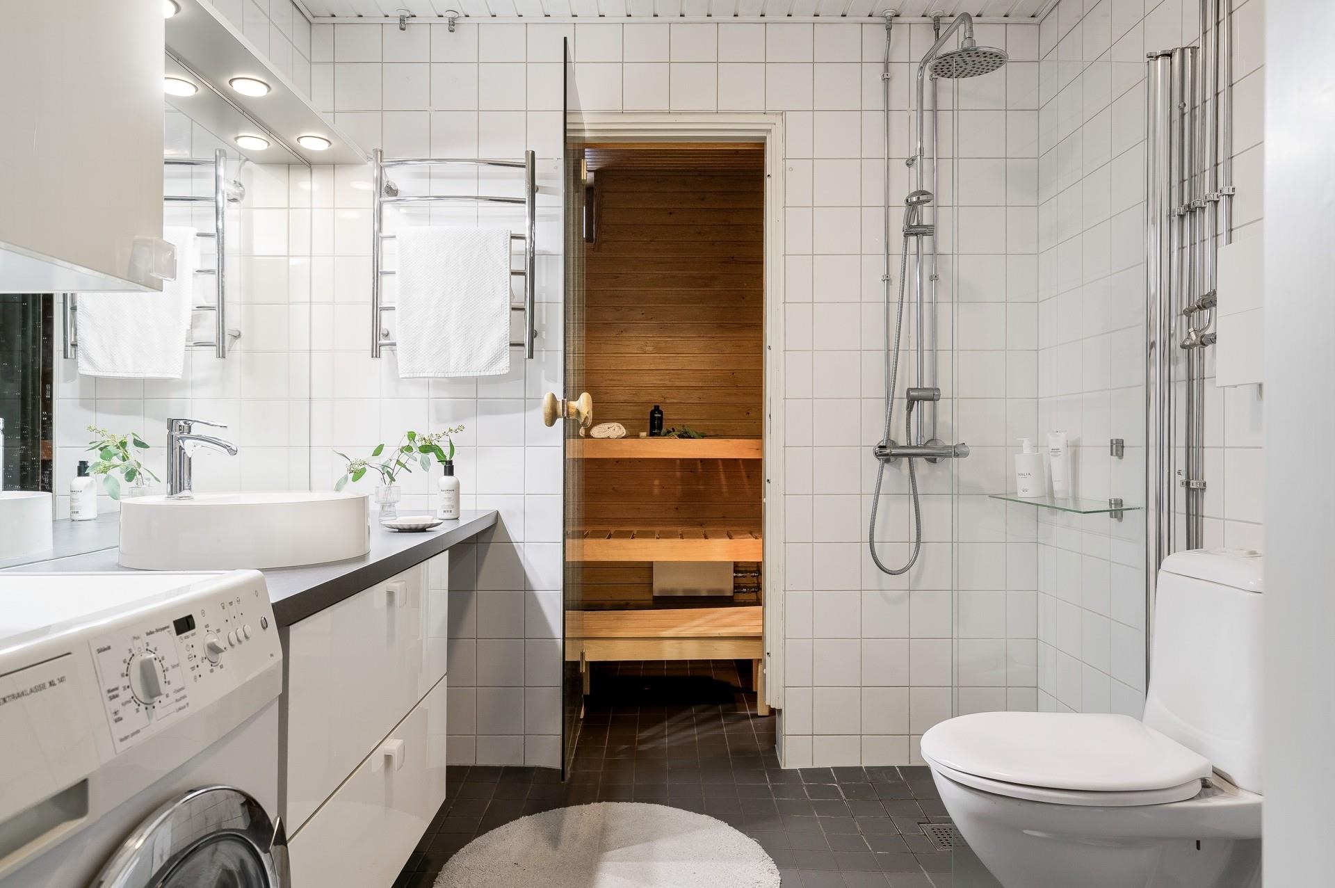 Laatoitettu kylpyhuone tarjoaa runsaasti tilaa myös vaatehuollolle, ja sen yhteydessä oleva oma sauna kutsuu löylyttemään päivän päätteeksi. Lisäksi erillinen wc tuo arkeen käytännöllisyyttä.