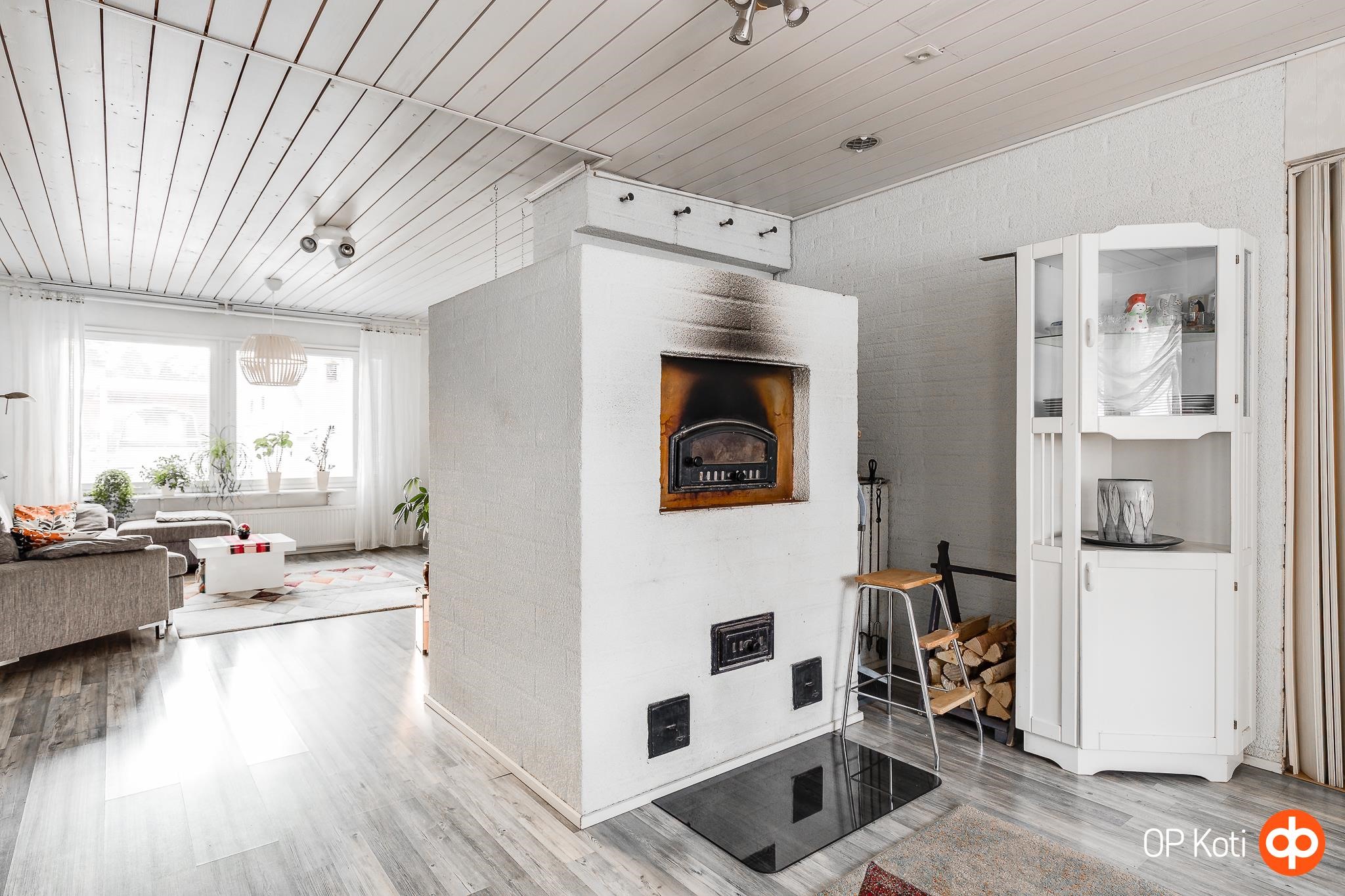 - Vesikiertoinen patterilämmitys. Varaava takka, leivinuuni, puuhella ja ilmalämpöpumppu.