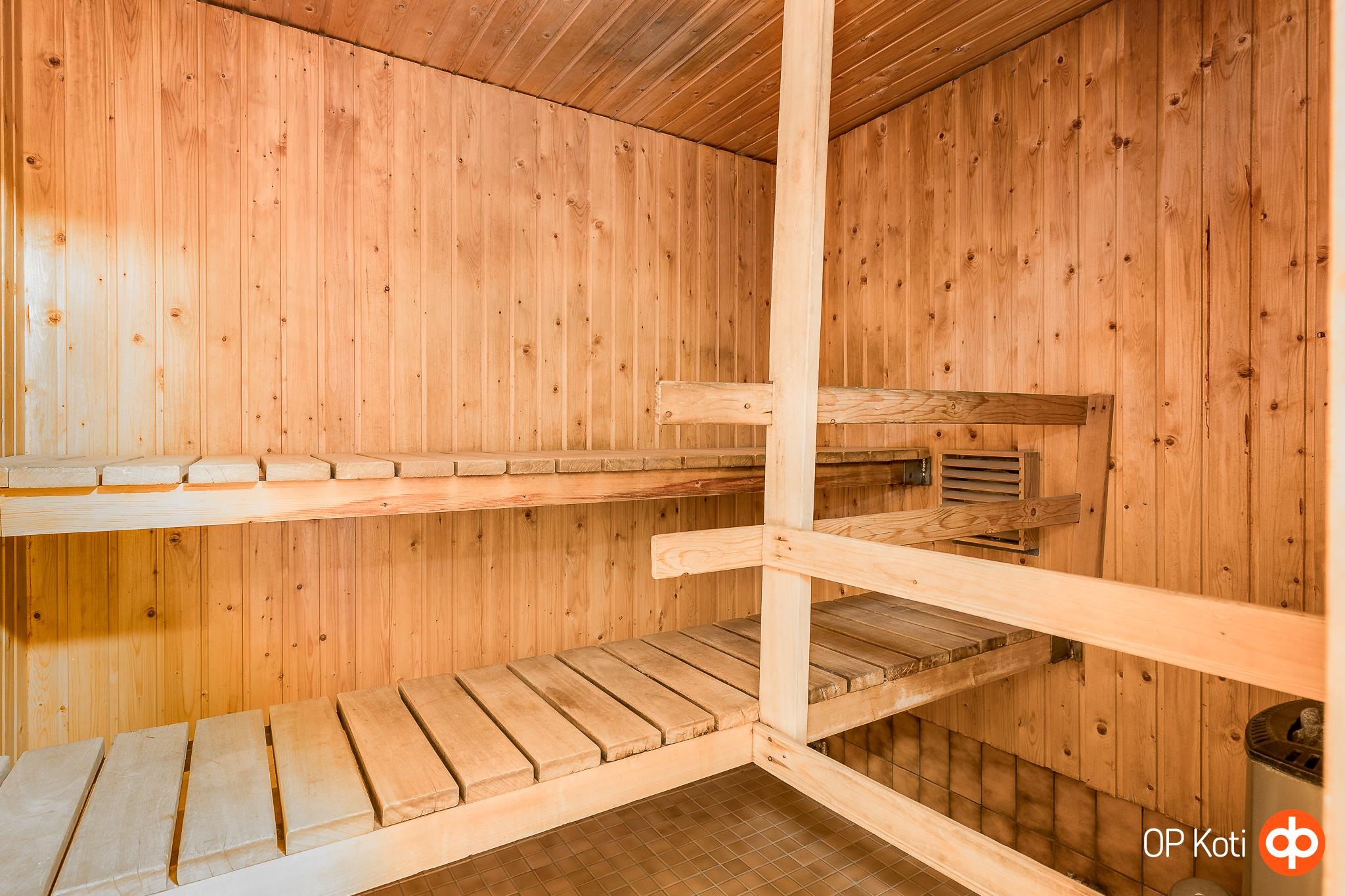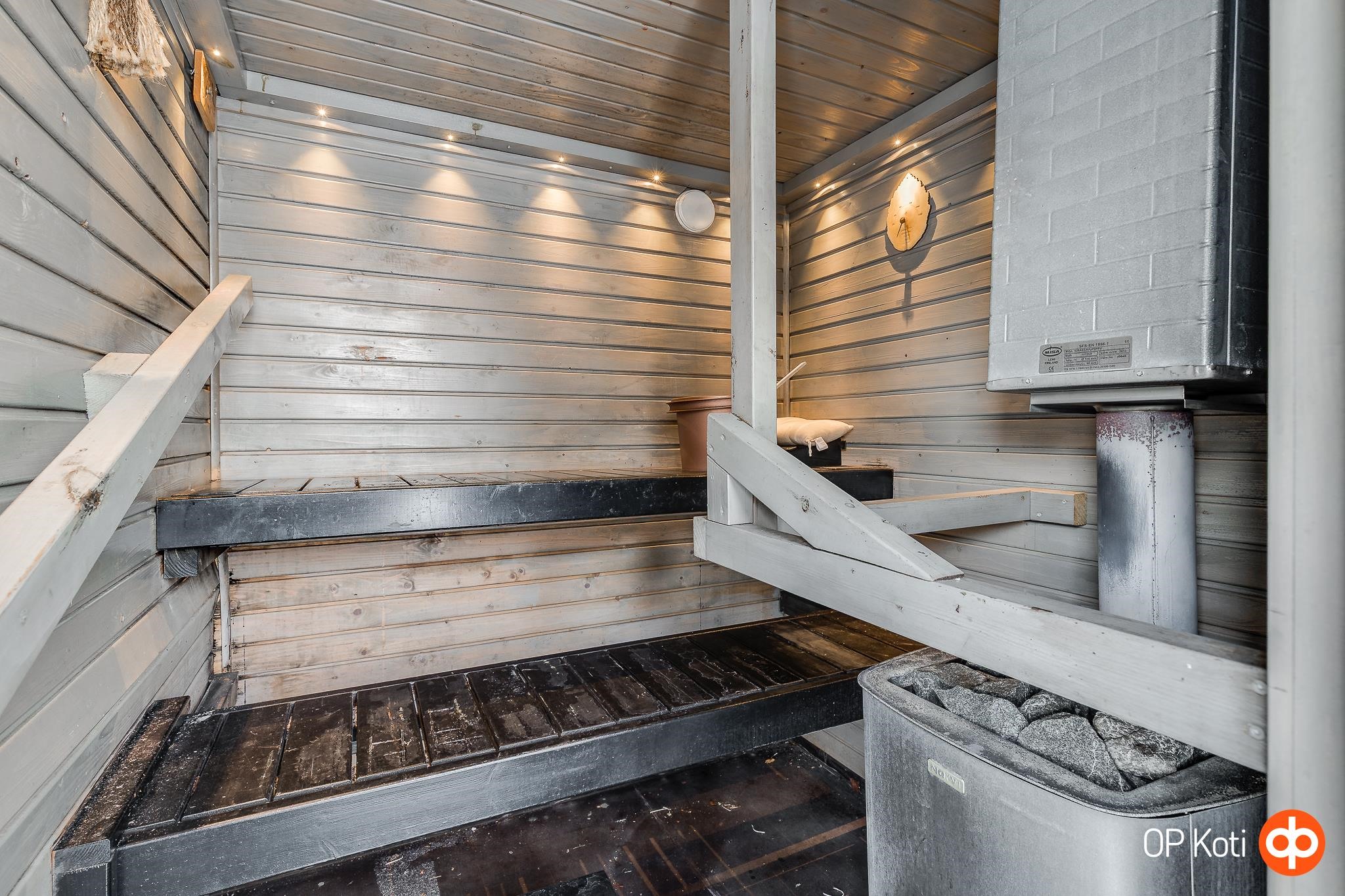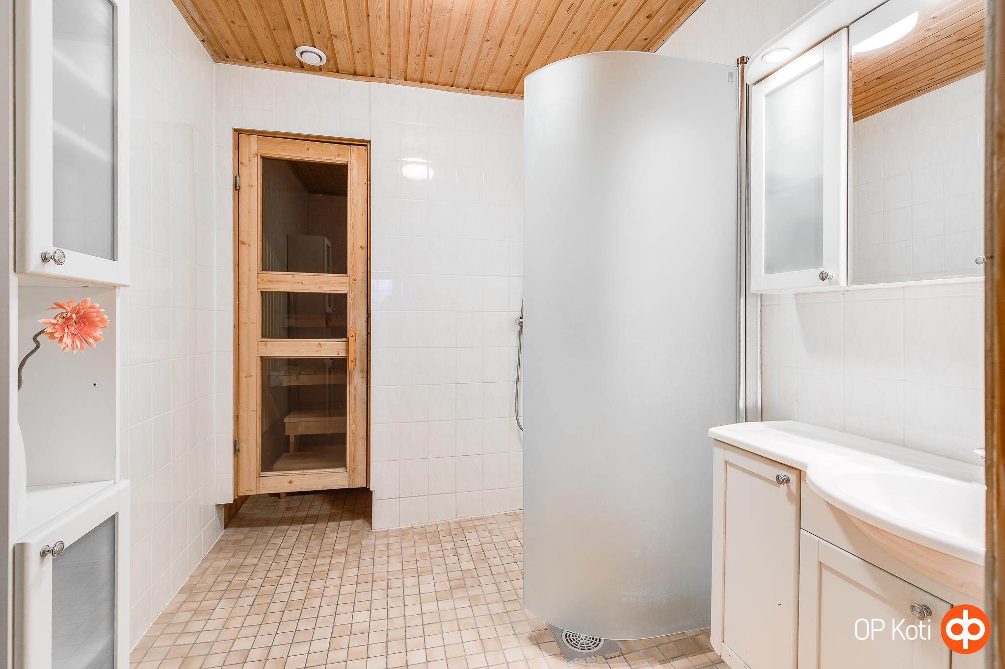 - Sauna, sähkökiuas (uusittu 2015), kylpyhuone, erillinen wc, suihku, suihkuseinä, peilikaappi, kaapit, allaskaappi, pesukoneliitäntä (kodinhoitotilassa), lattialämmitys (kosteissa tiloissa), kiinteät valaisimet. Ulkosaunassa puukiuas.