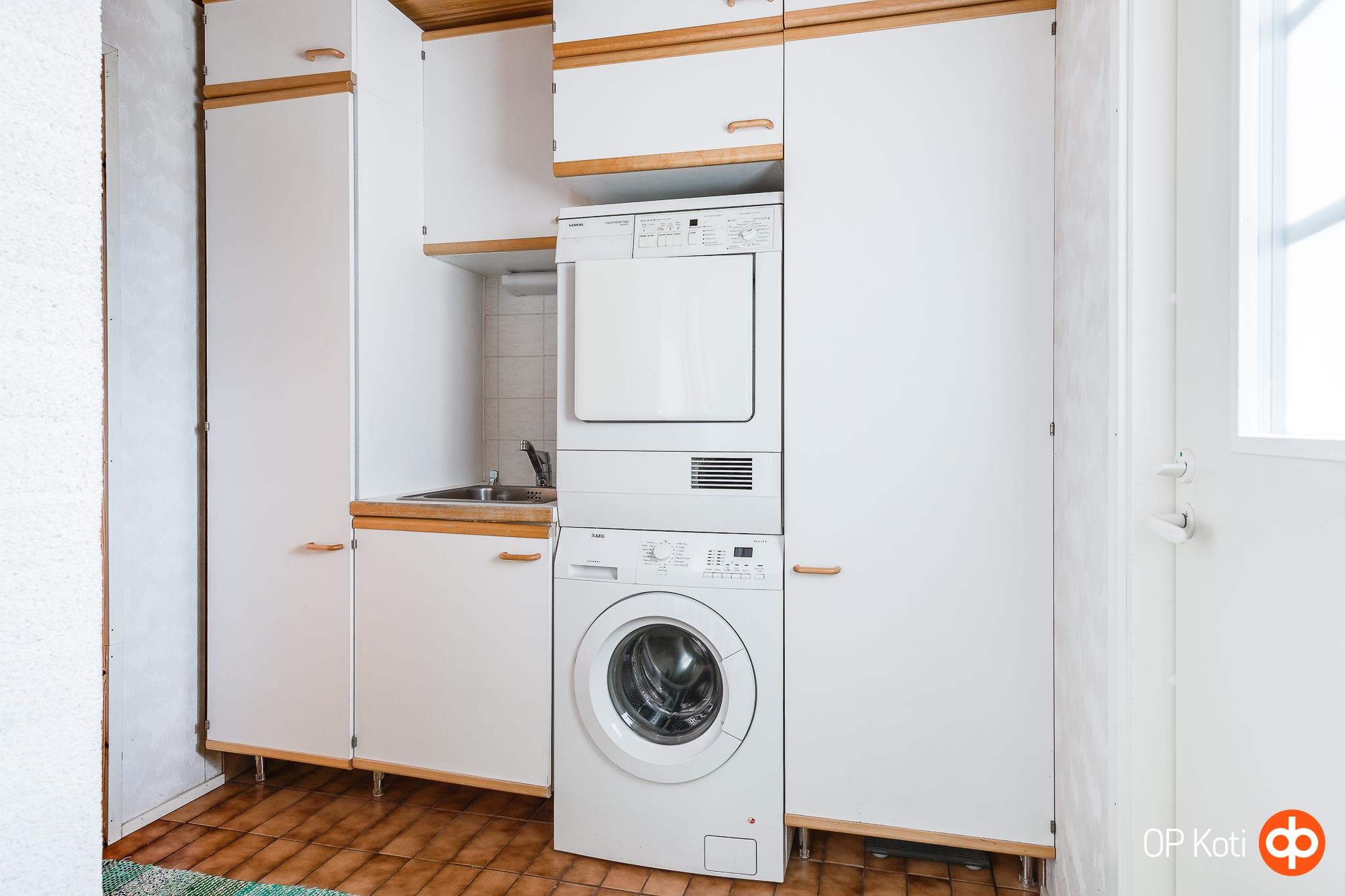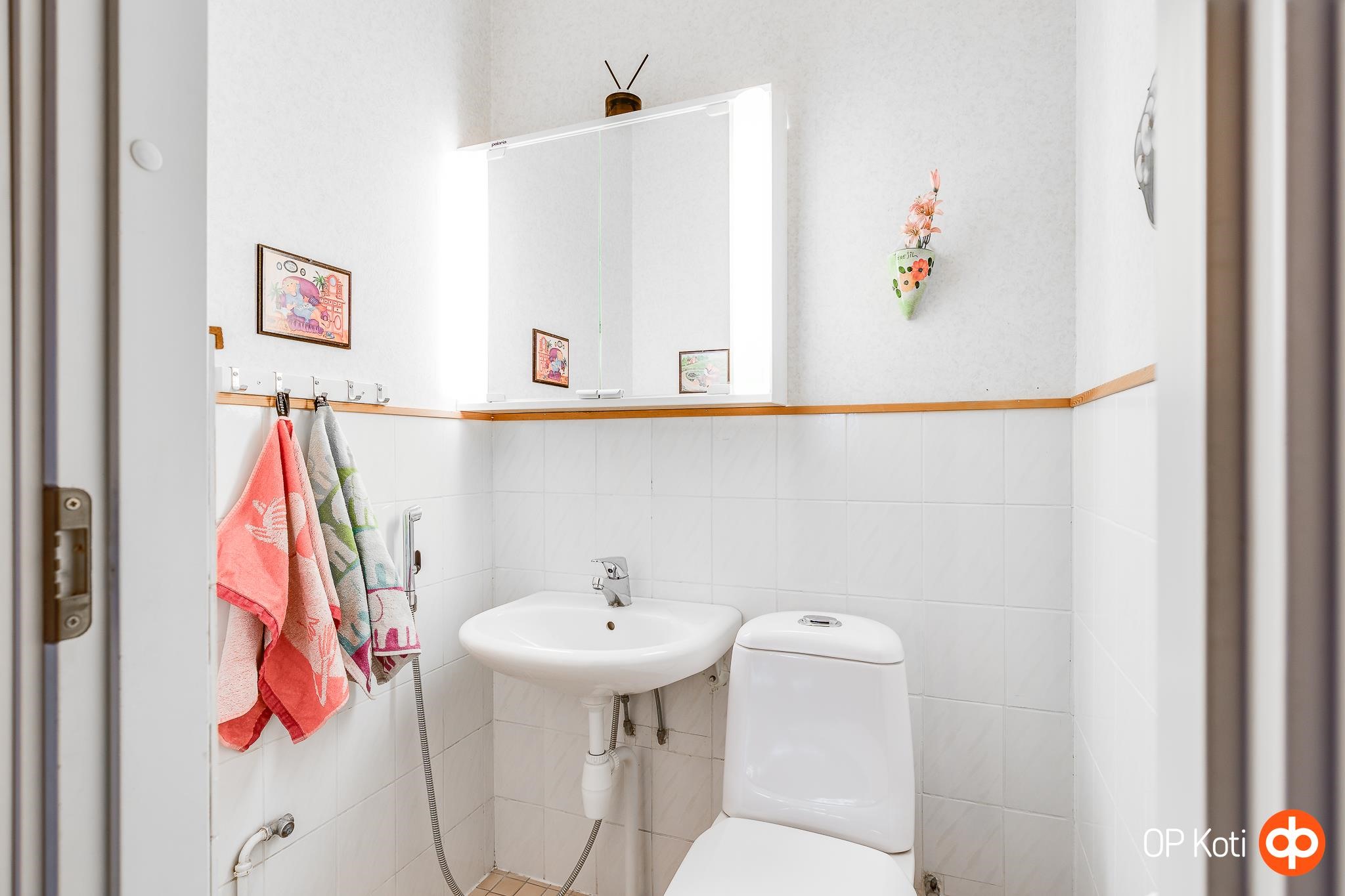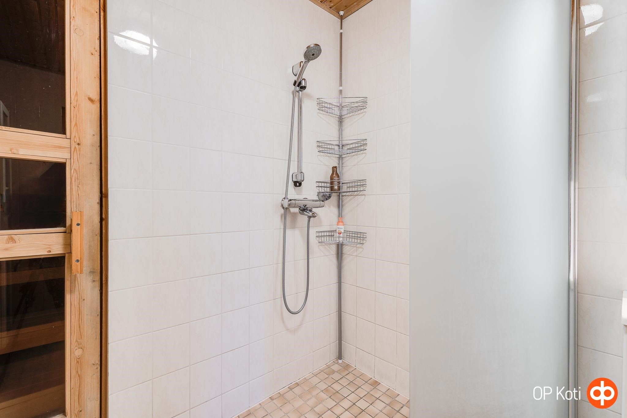 - Sauna, sähkökiuas (uusittu 2015), kylpyhuone, erillinen wc, suihku, suihkuseinä, peilikaappi, kaapit, allaskaappi, pesukoneliitäntä (kodinhoitotilassa), lattialämmitys (kosteissa tiloissa), kiinteät valaisimet. Ulkosaunassa puukiuas.