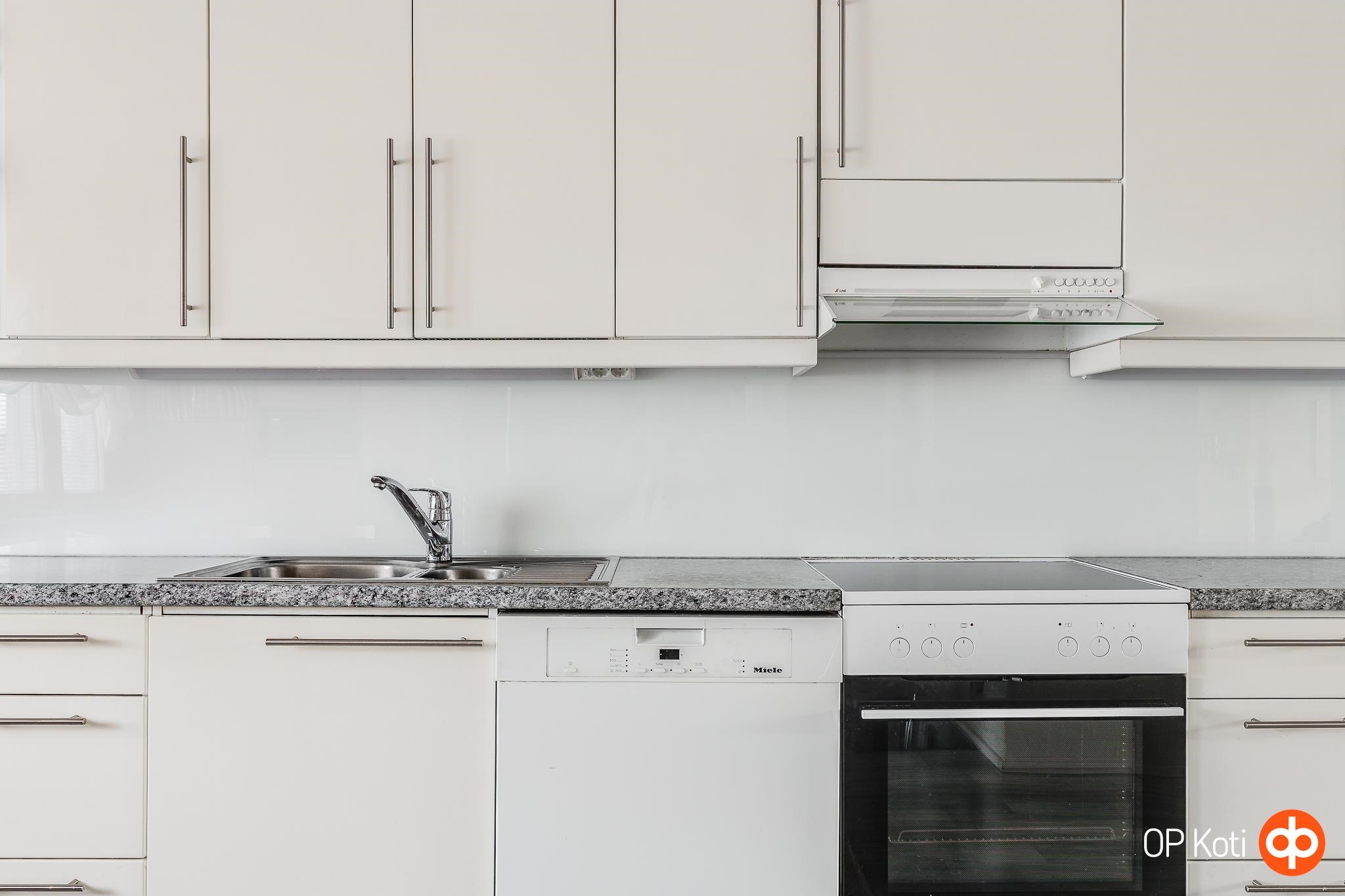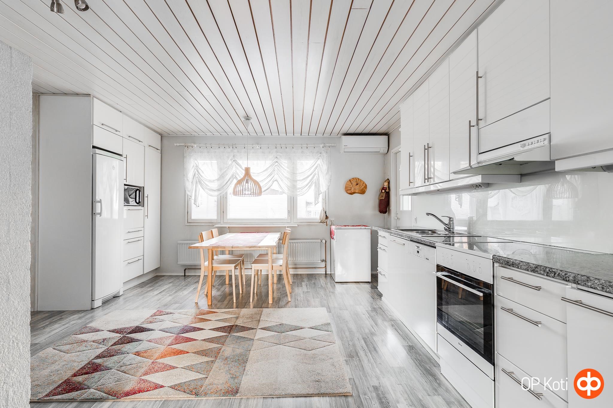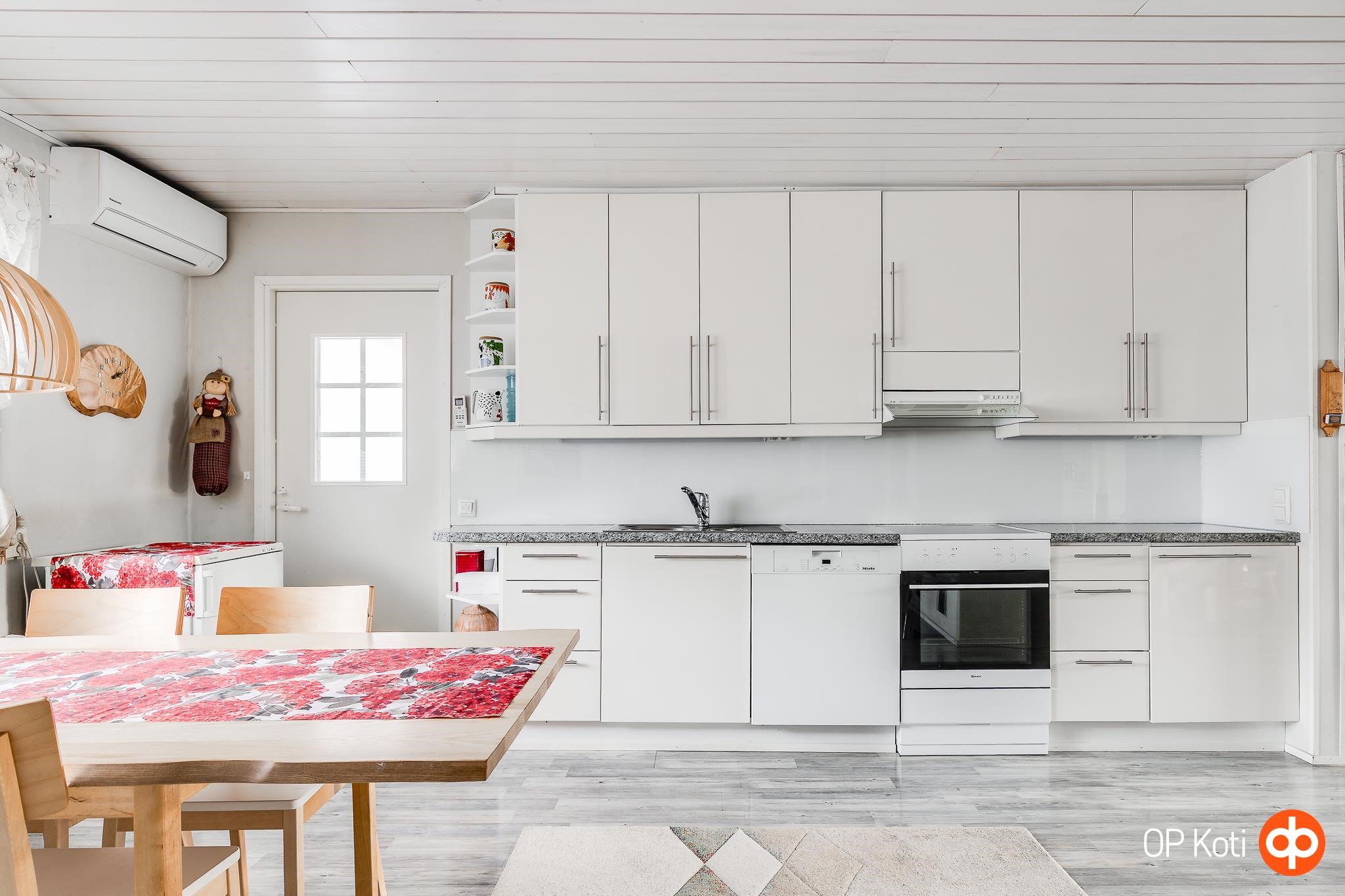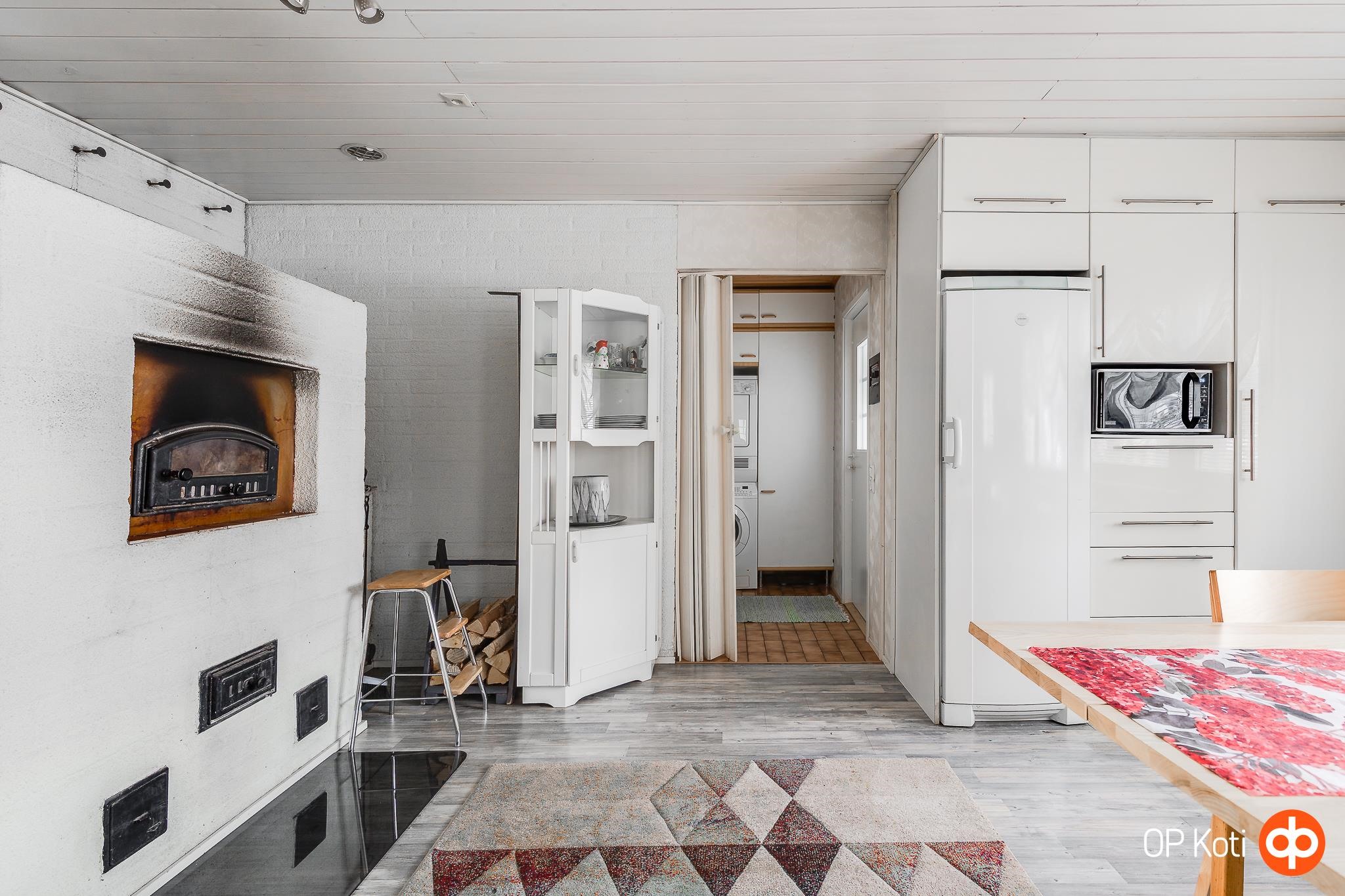 - Jääkaappi, induktioliesi, liesituuletin, leivinuuni, astianpesukone, kaapistot (kaapistojen ovet ja laatikostot uusittu 2015), kiinteät valaisimet. Puuhella. Keittiö remontoitu 2015, leivinuuni ja puuhella asennettu 1987.