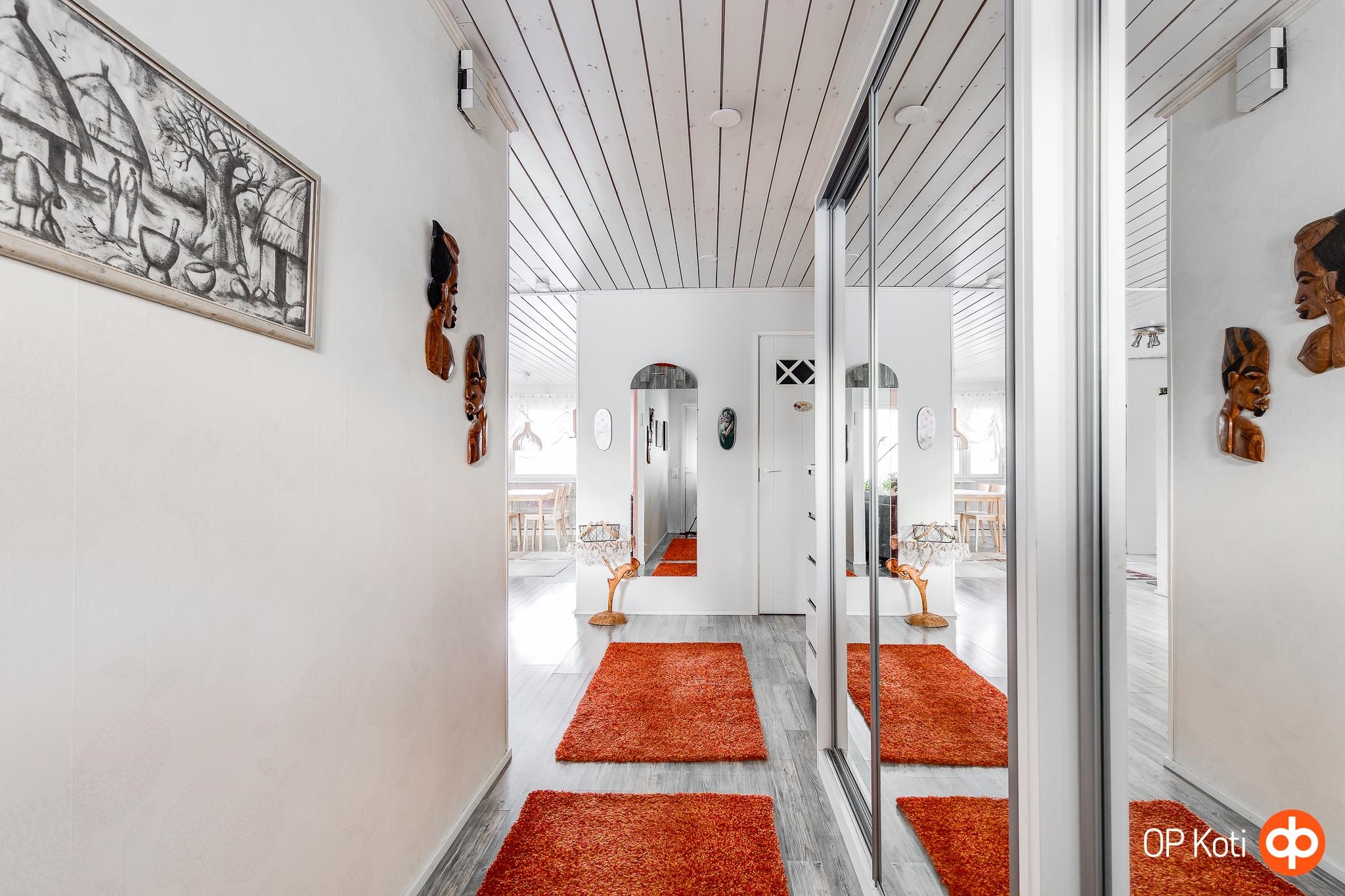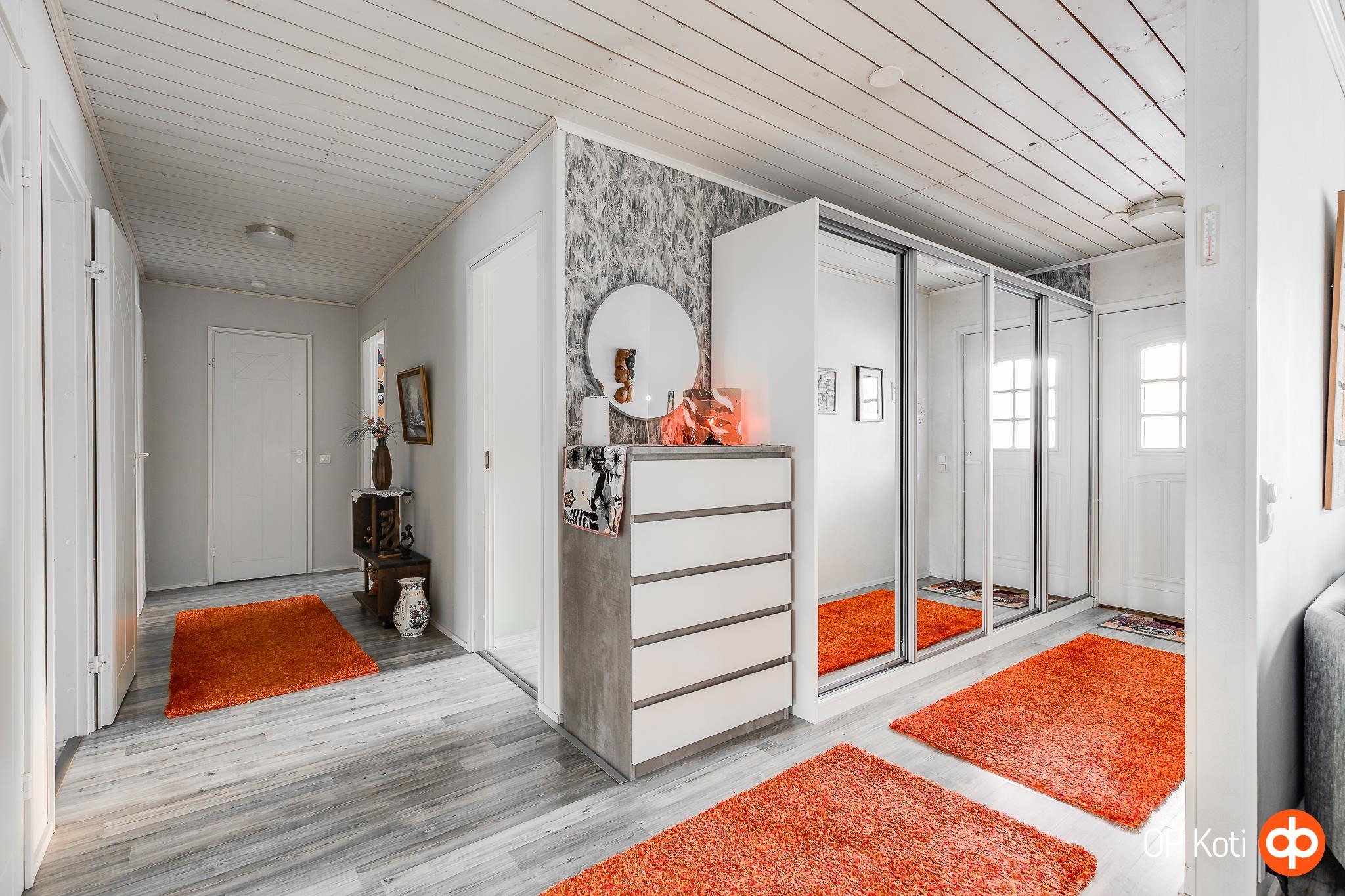 Talo vastaa omakotitalon ostajan tarpeisiin monipuolisilla tilaratkaisuilla ja varustelullaan. Koti avautuu tilavasta eteisestä, josta on käynti kodin sydämeen, avaraan olohuoneeseen ja keittiöön. Takka/leivinuuni sekä keittiön puuliesi luovat tunnelmaa ja lämpöä. Keittiö, joka on remontoitu vuonna 2015, tarjoaa modernit mukavuudet kuten induktiolieden ja astianpesukoneen. Makuuhuoneet ovat valoisia ja käytännöllisiä, ja kodinhoitohuoneessa on tilaa arjen askareille. Kylpyhuoneen lattialämmitys tuo mukavuutta aamun suihkuihin, ja saunan uusittu sähkökiuas takaa rentouttavat löylyt. Pihasauna puukiukaalla tarjoaa mahdollisuuden nauttia perinteisistä saunakokemuksista.