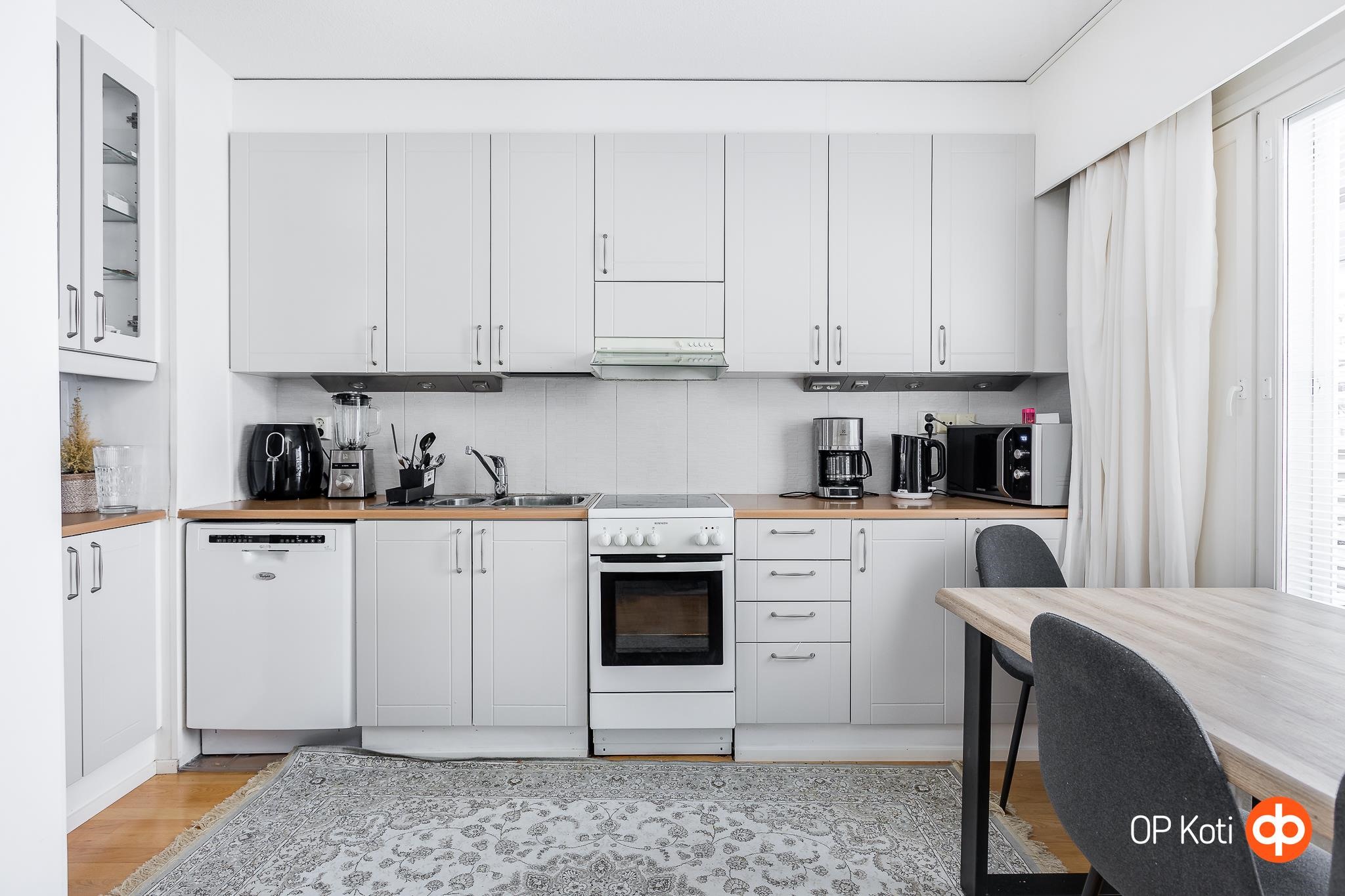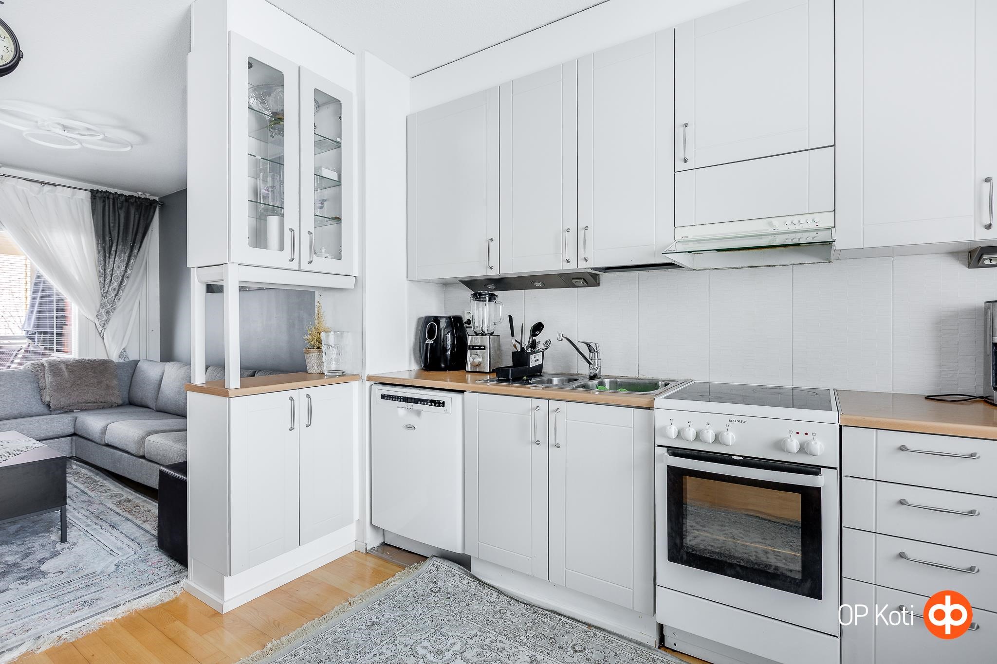 - Jääkaappipakastin, lattialiesi, keraaminen liesi, liesituuletin, astianpesukone, kaapistot, kiinteät valaisimet.
