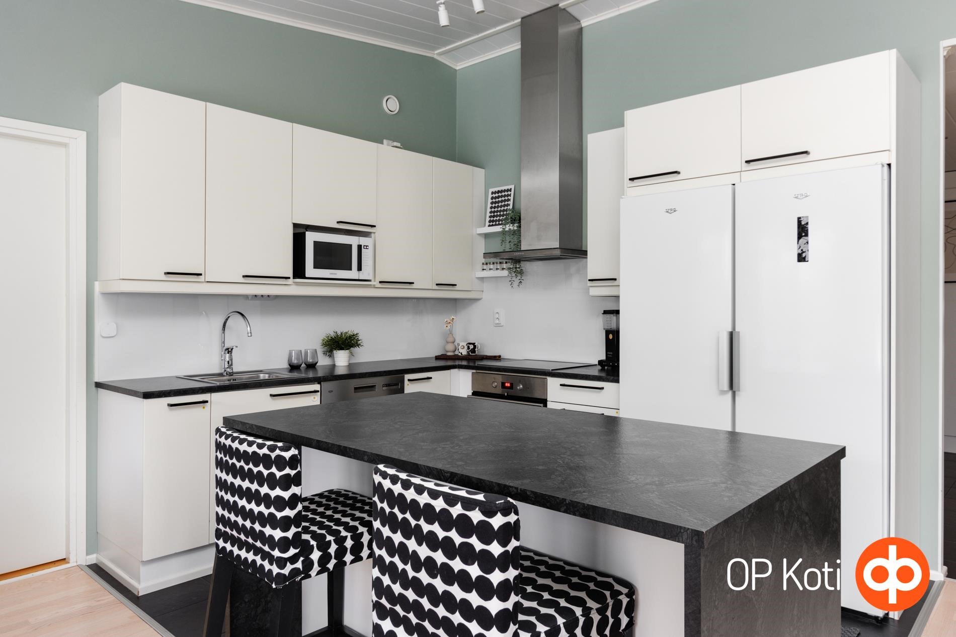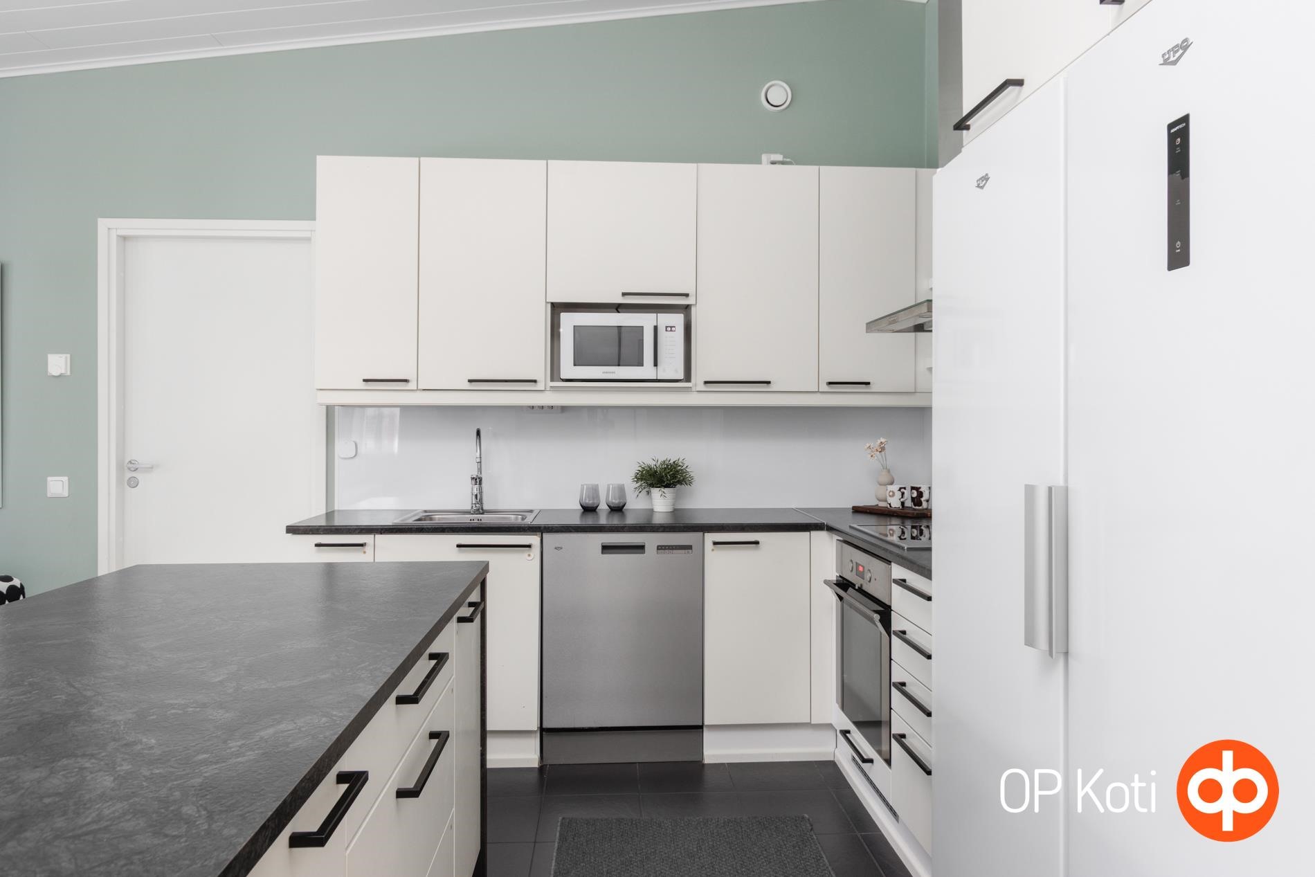 - Jääkaappi 2024, pakastekaappi 2024, erillisuuni, keraaminen liesi, liesituuletin, astianpesukone, kaapistot, kiinteät valaisimet.