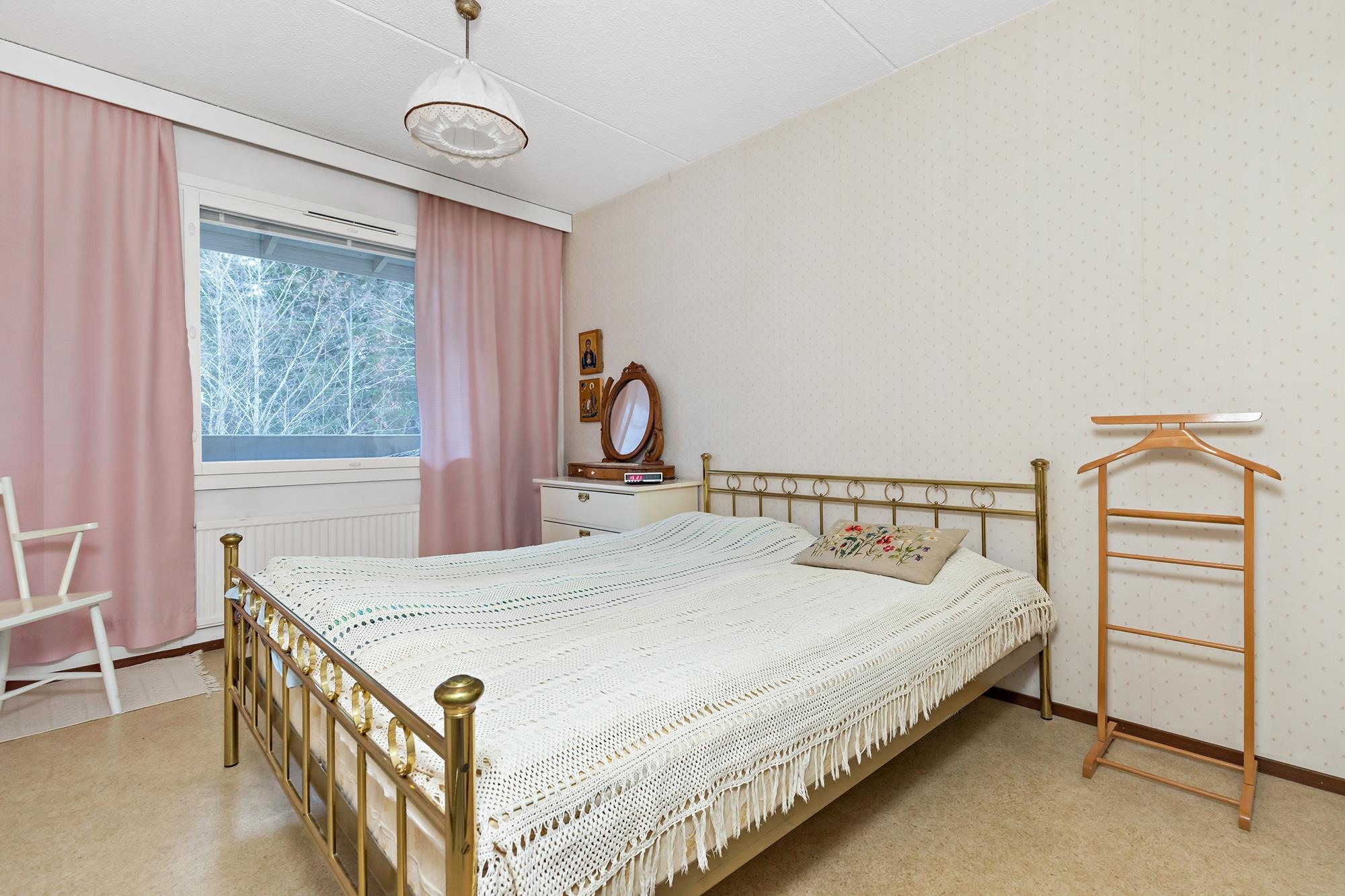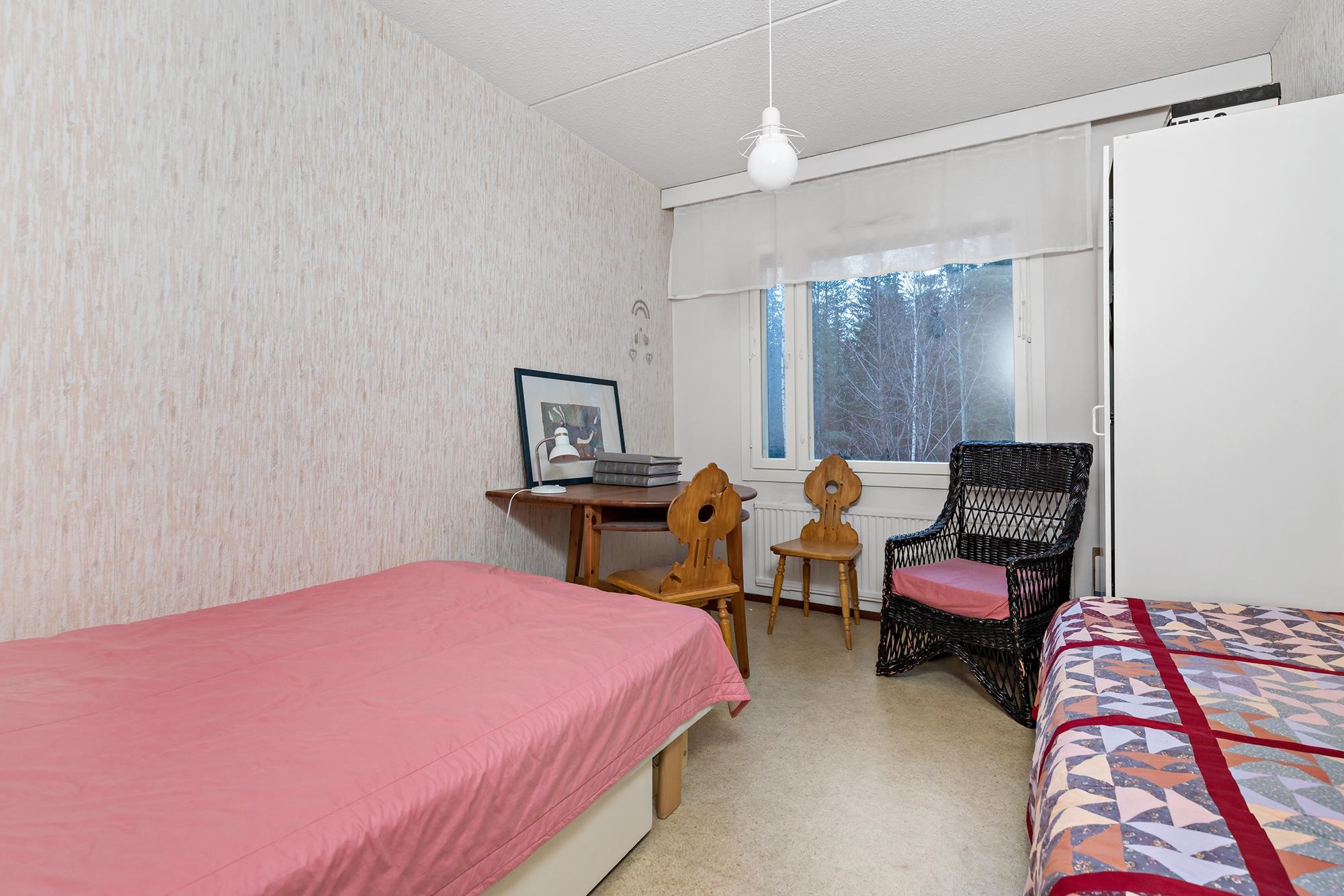 Keittiö: Muovimatto, maalattu. Olohuone: Muovimatto, tapetti. Makuuhuone 1: Muovimatto, tapetti. Makuuhuone 2: Muovimatto, tapetti. Makuuhuone 3: Muovimatto, paneeli. Sauna: Laatta, paneeli. Kylpyhuone: Laatta. Eteinen: Muovimatto, maalattu. Wc: Laatta,paneeli.