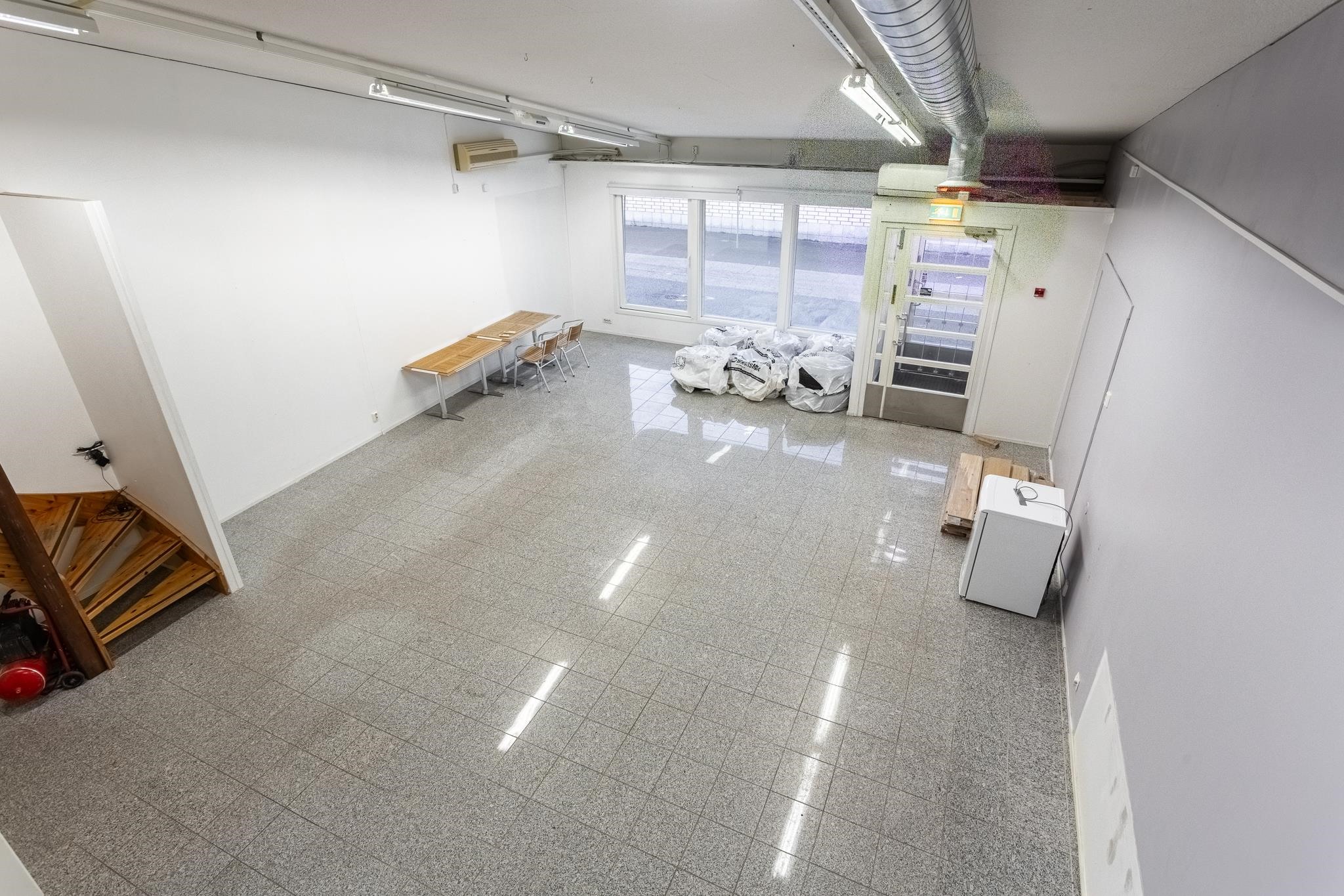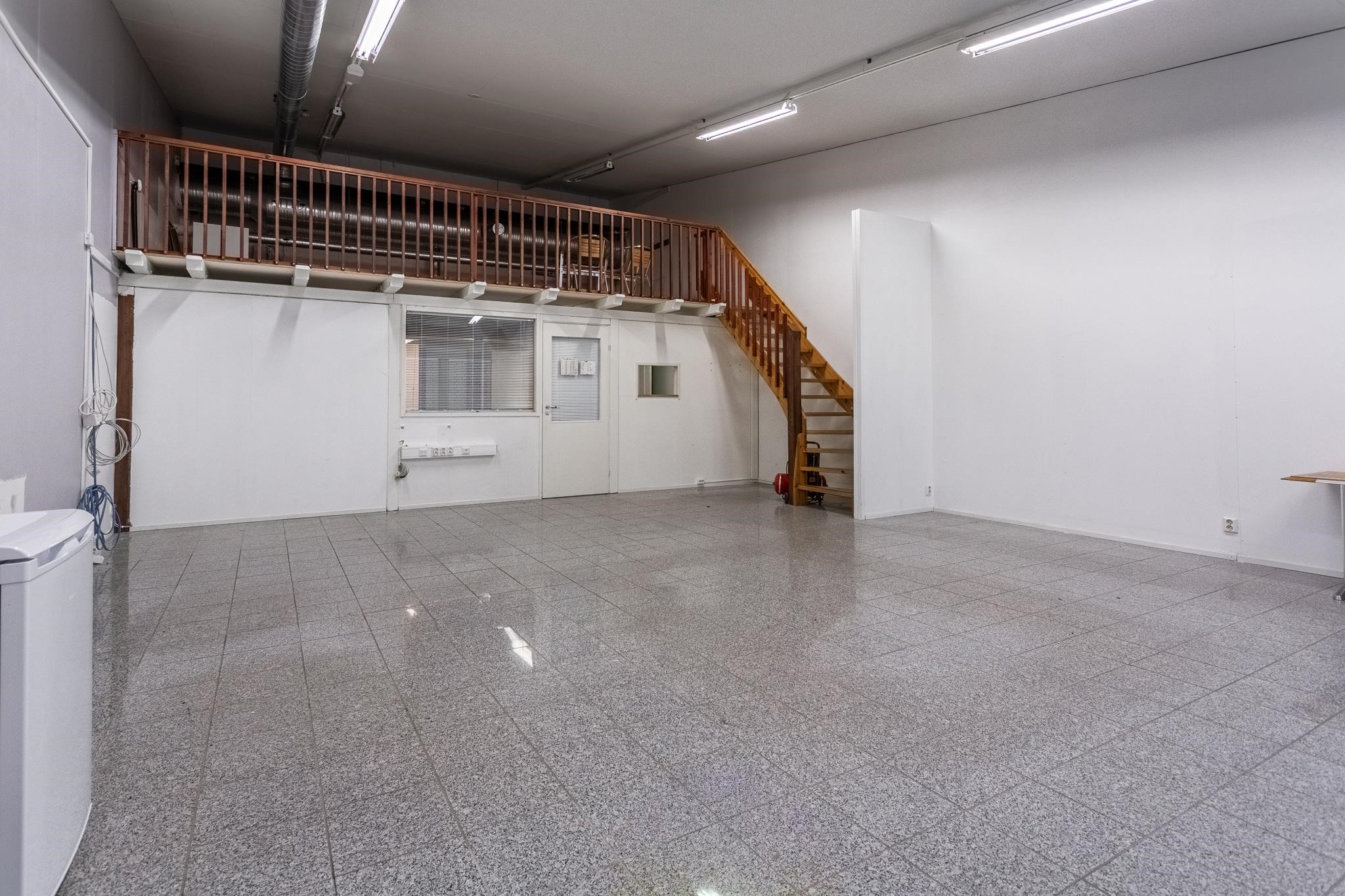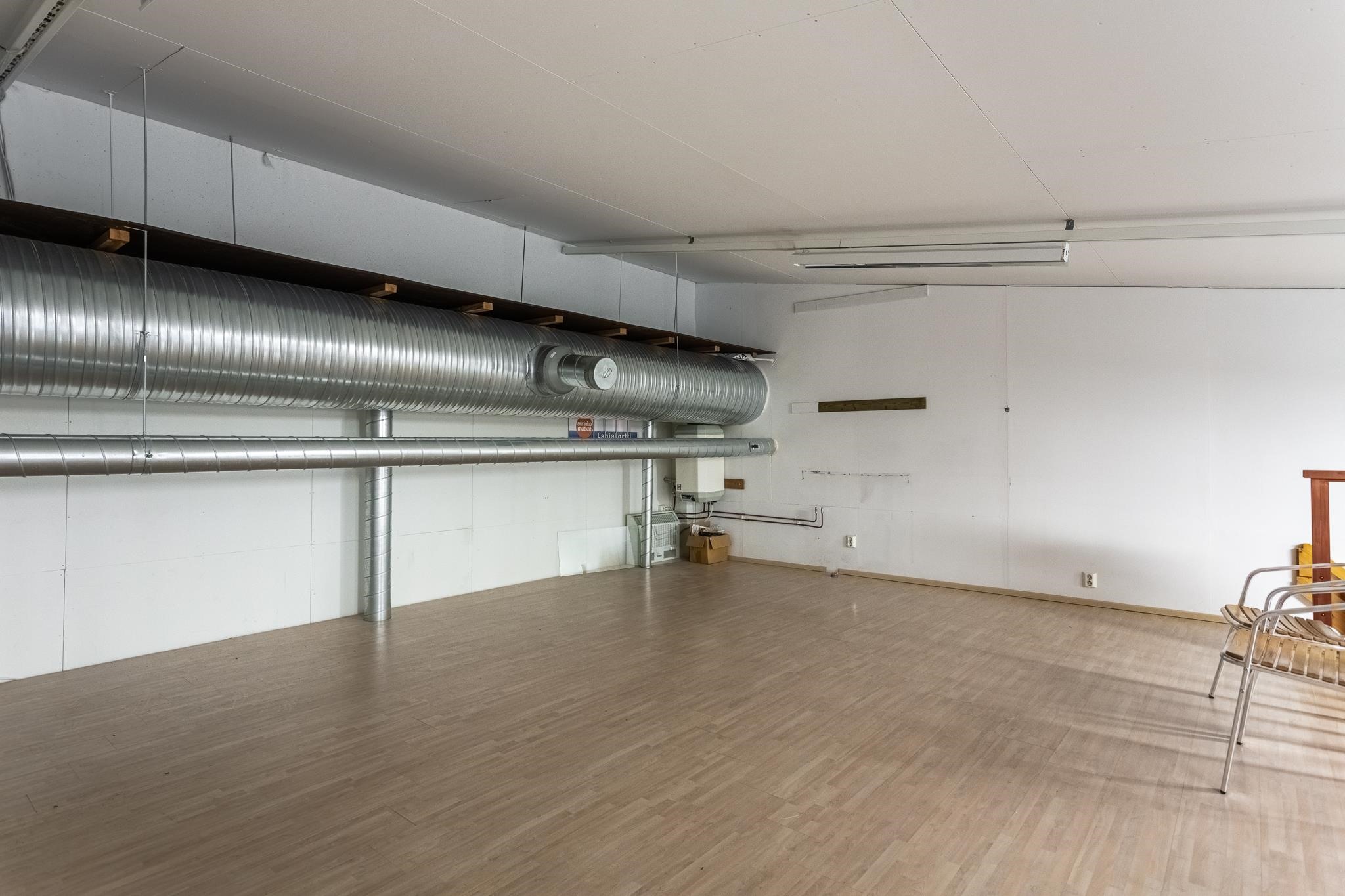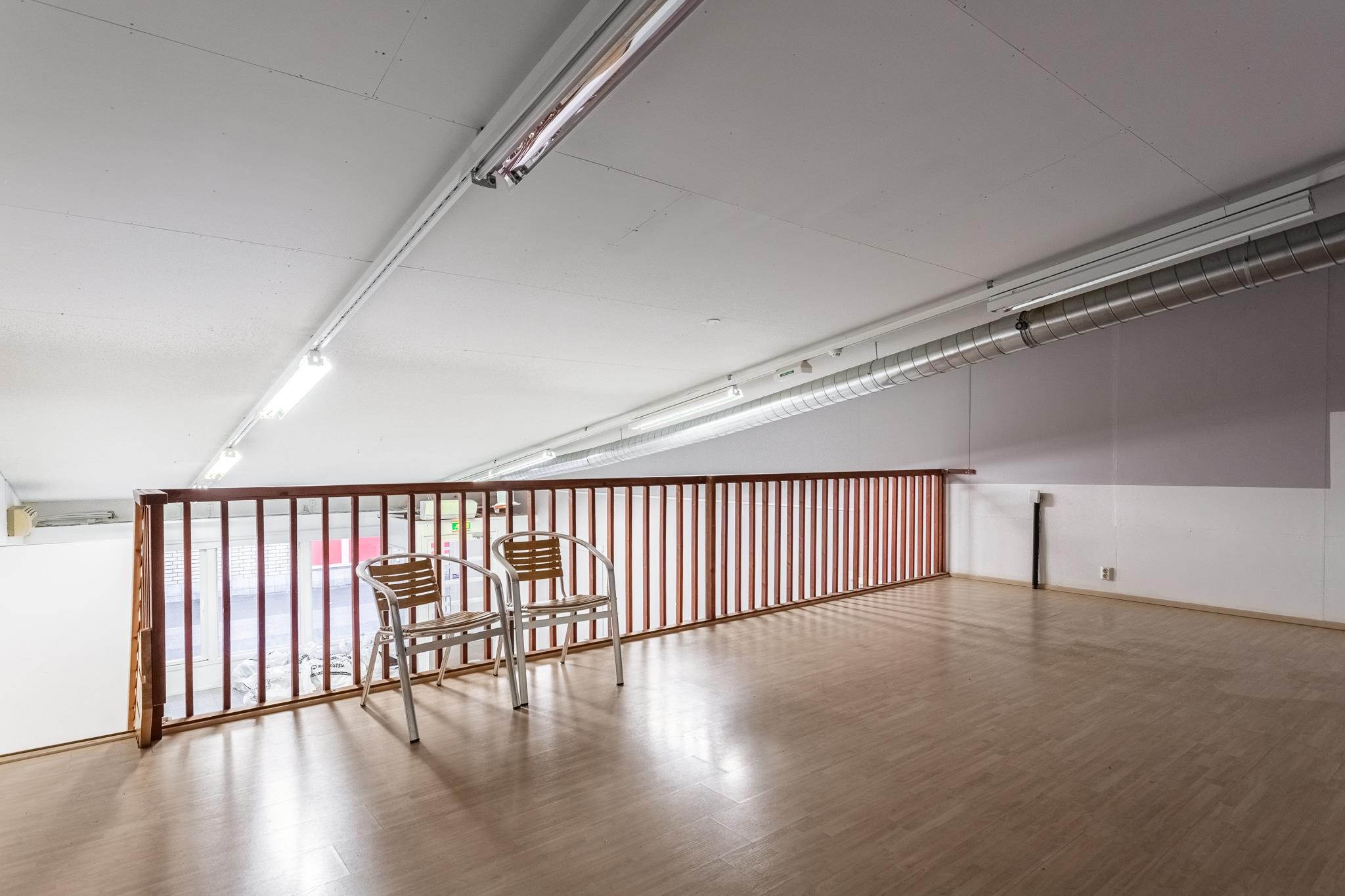 Avoin korkea etutila, parvi ja takana toimisto- ja keittiötilaa. Erillinen wc. Ilmalämpöpumppu liiketilassa.