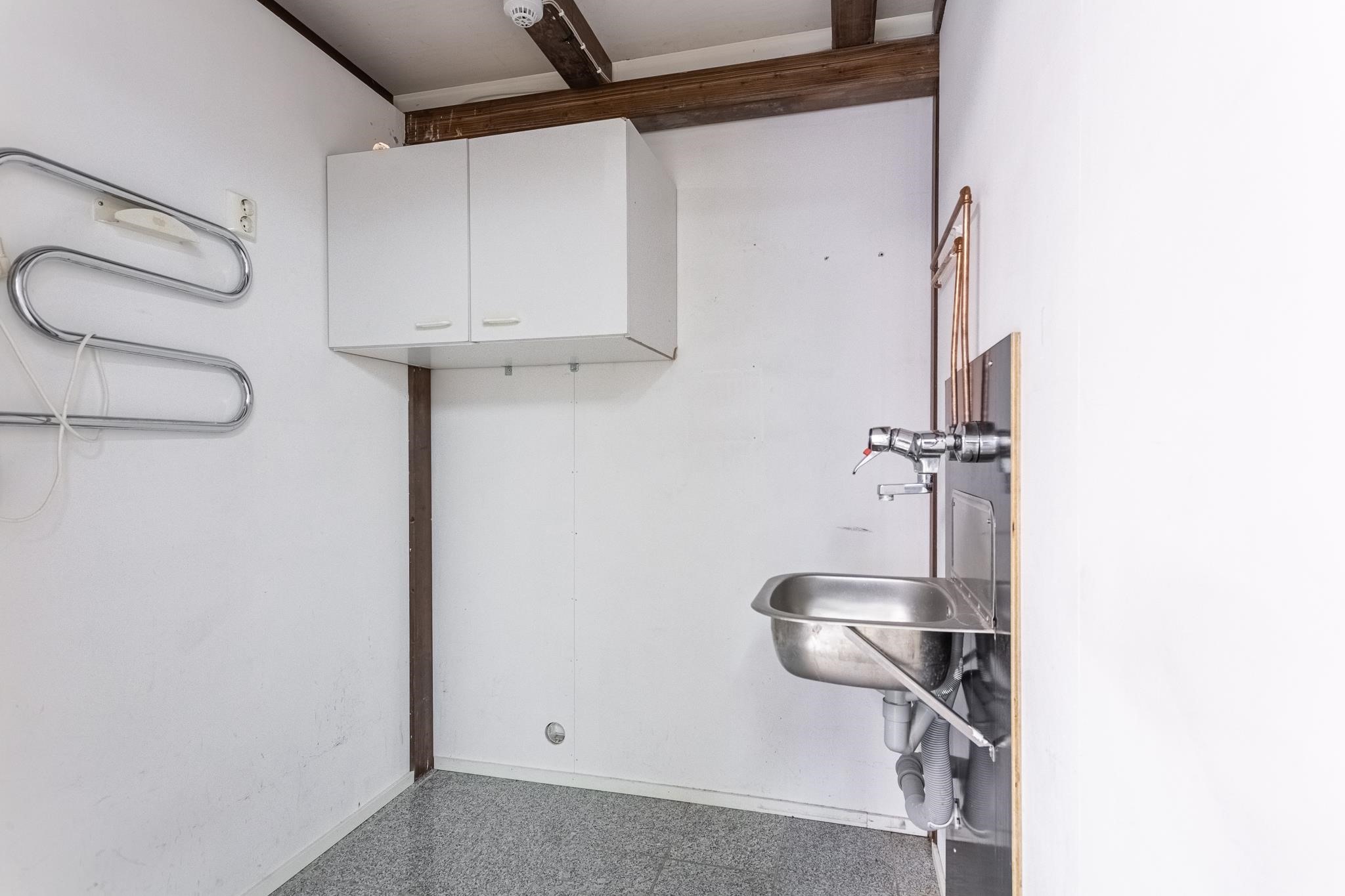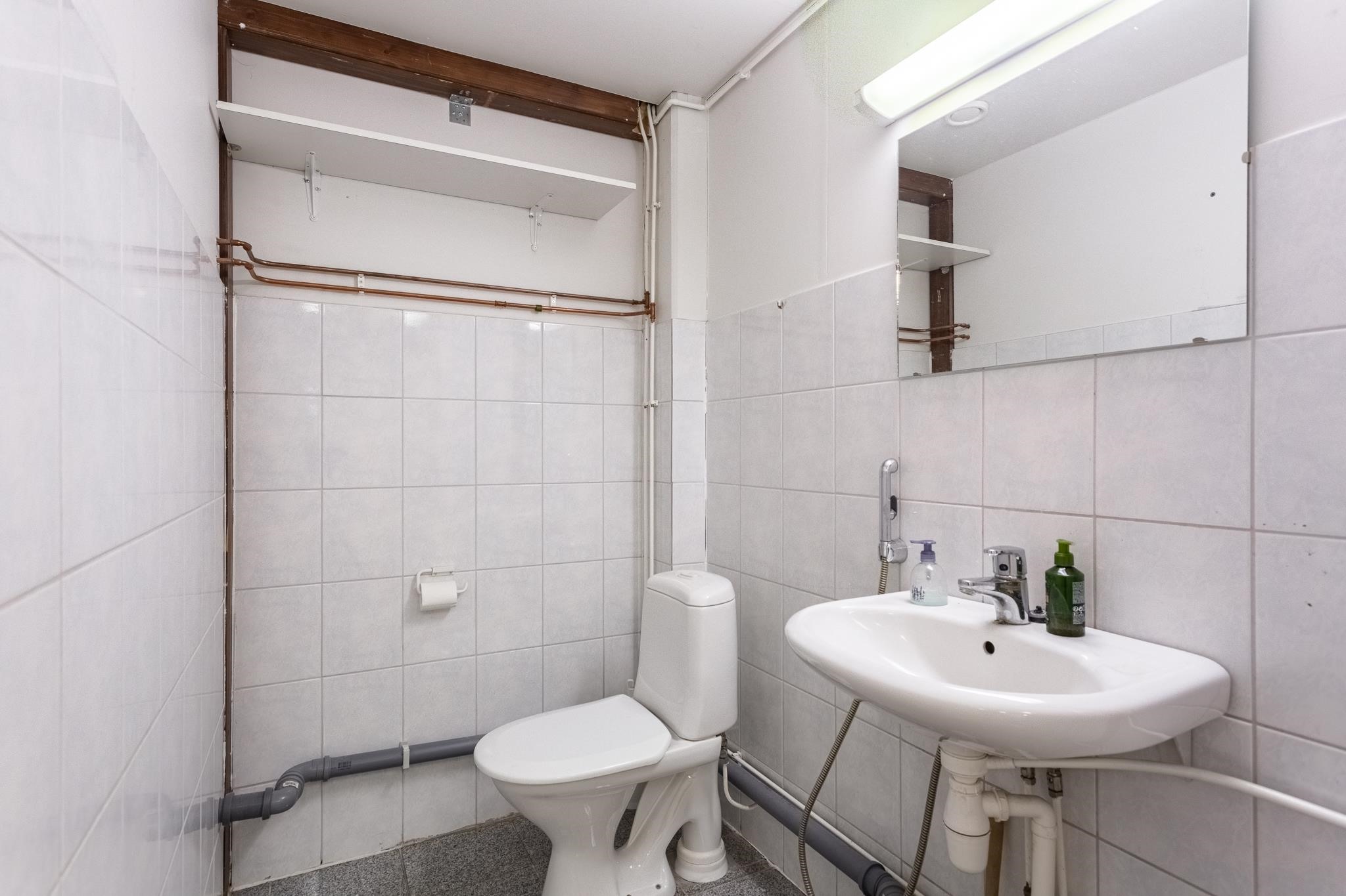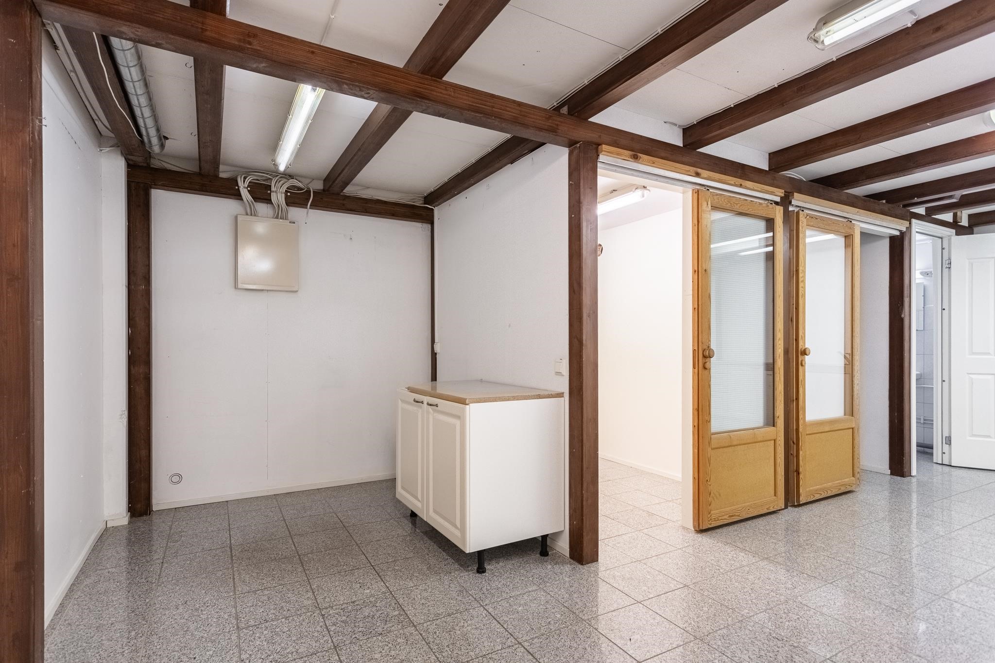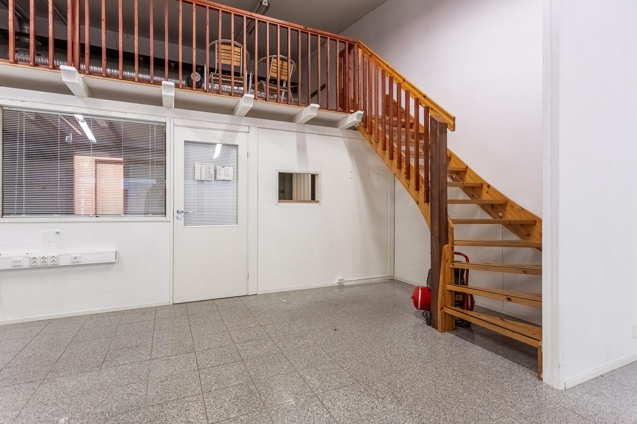 Avoin korkea etutila, parvi ja takana toimisto- ja keittiötilaa. Erillinen wc. Ilmalämpöpumppu liiketilassa.