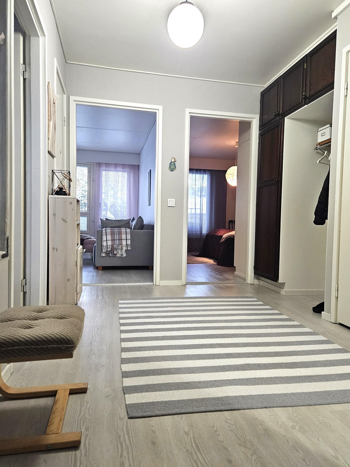 Keittiö: vinyylilankku, tapetti. Olohuone: vinyylilankku, tiili, tapetti. Makuuhuone 1: vinyylilankku, tapetti. Makuuhuone 2: vinyylilankku, tapetti. Sauna: laatta, paneeli. Kylpyhuone: laatta. Eteinen: vinyylilankku, tapetti. Wc: laatta, maalattu. tuulikaappi: betoni/matto, maalattu-tapetti.