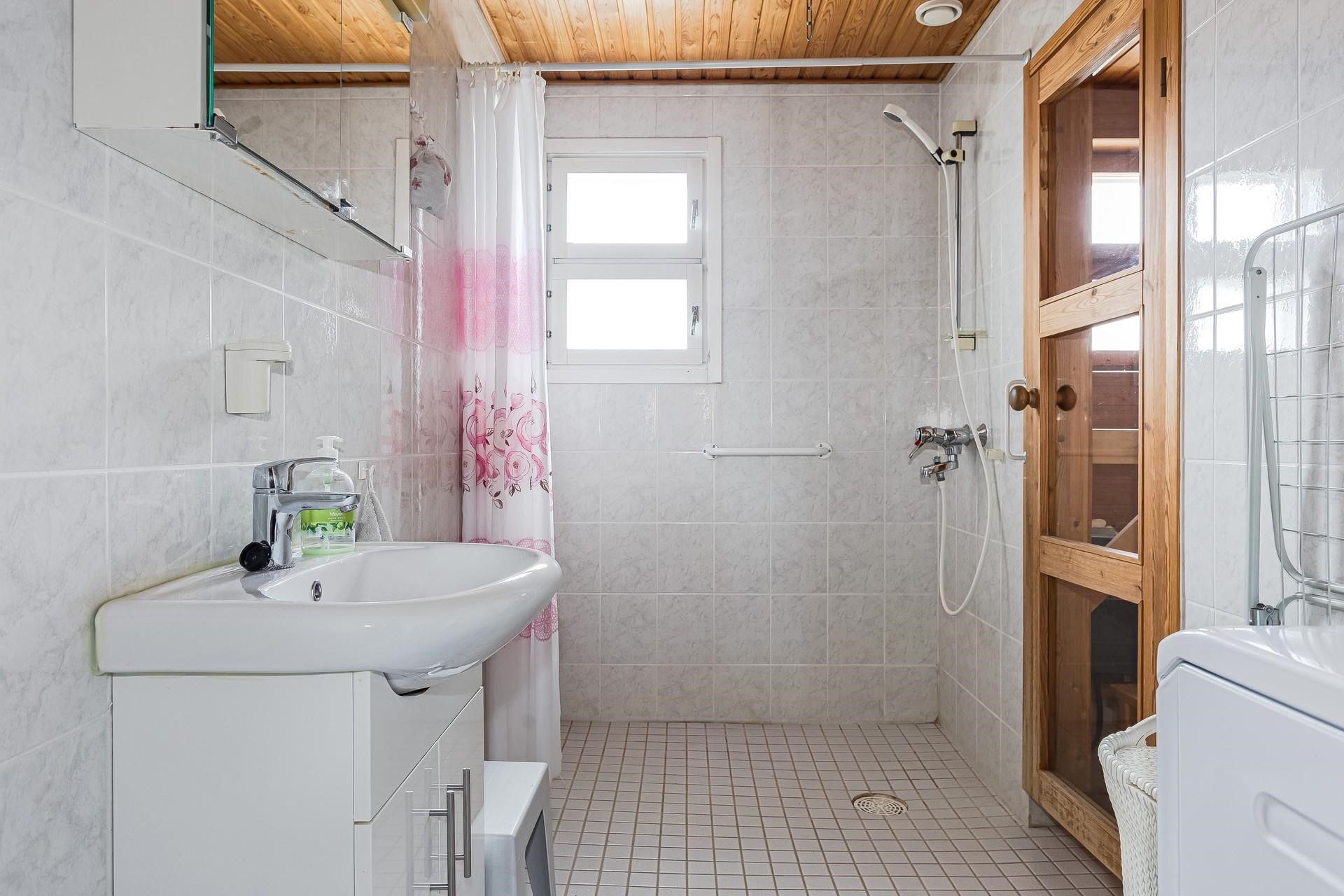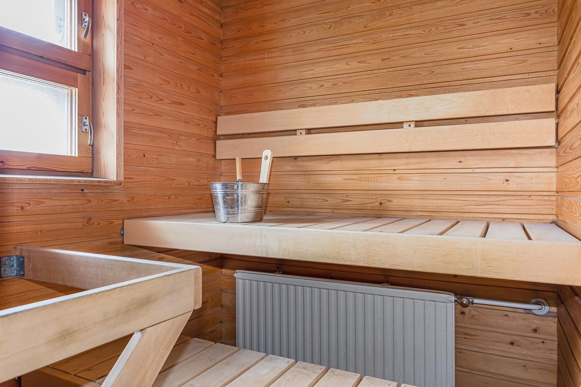 - Sauna, sähkökiuas, kylpyhuone, erillinen wc, peilit, pesukoneliitäntä.