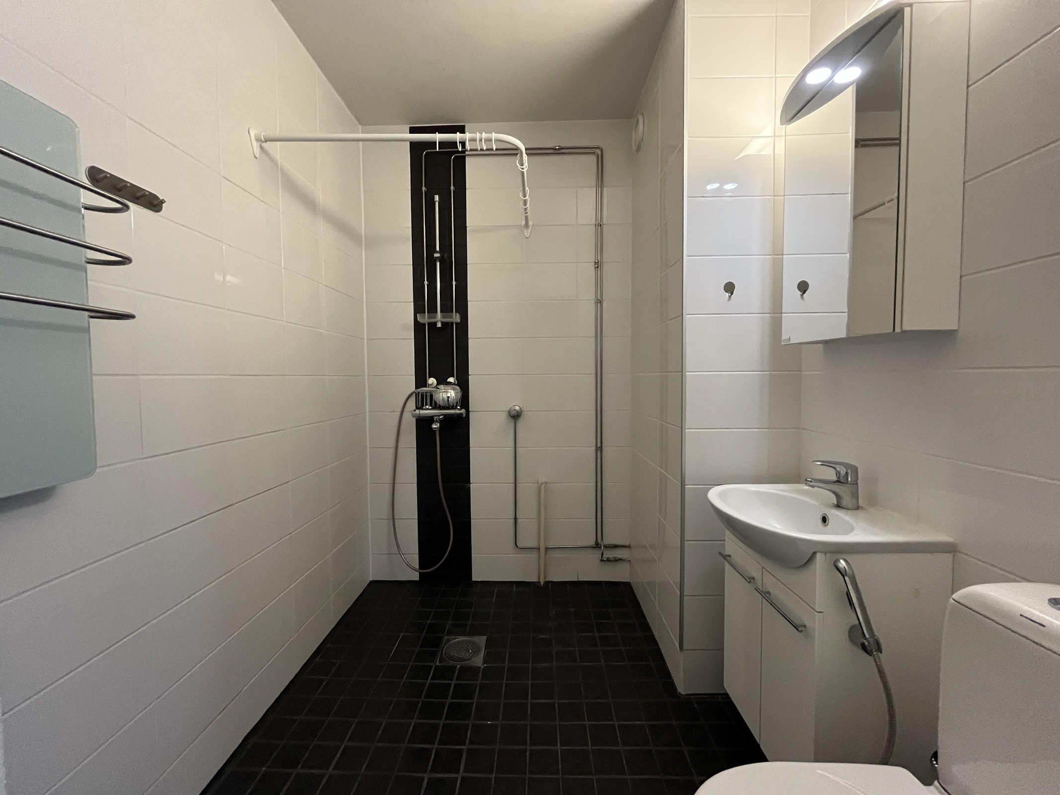 - Kylpyhuone, suihku, peilikaappi, allaskaappi, pesukoneliitäntä, kiinteät valaisimet.