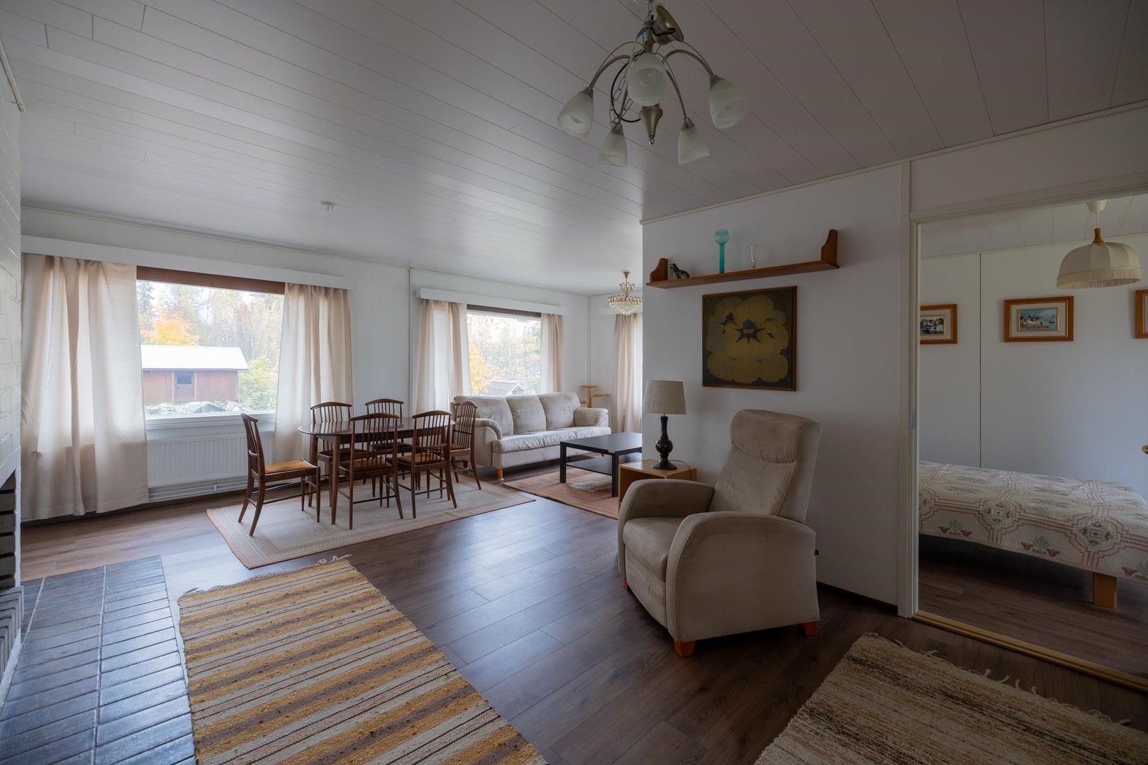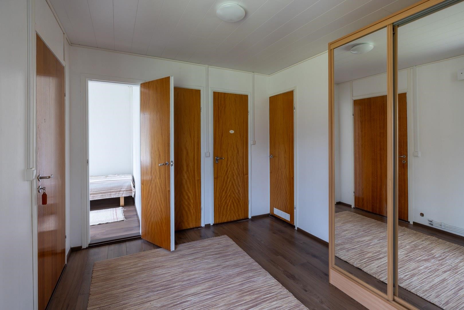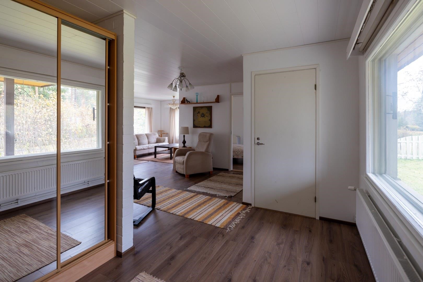 Keittiö: Laminaattilattia, seinät on maalattu,välitilassa laatta.. Olohuone: Laminaattilattia,seinät on maalattu.. Makuuhuone 1: Laminaattilattia,seinät on maalattu.. Makuuhuone 2: Laminaattilattia,seinät on maalattu.. Sauna: Paneloitu. Kylpyhuone: Kaakeloitu. Eteinen: Laminaattilattia,seinät on maalattu. Wc: Seinät maalattu, lattiassa muovimatto..