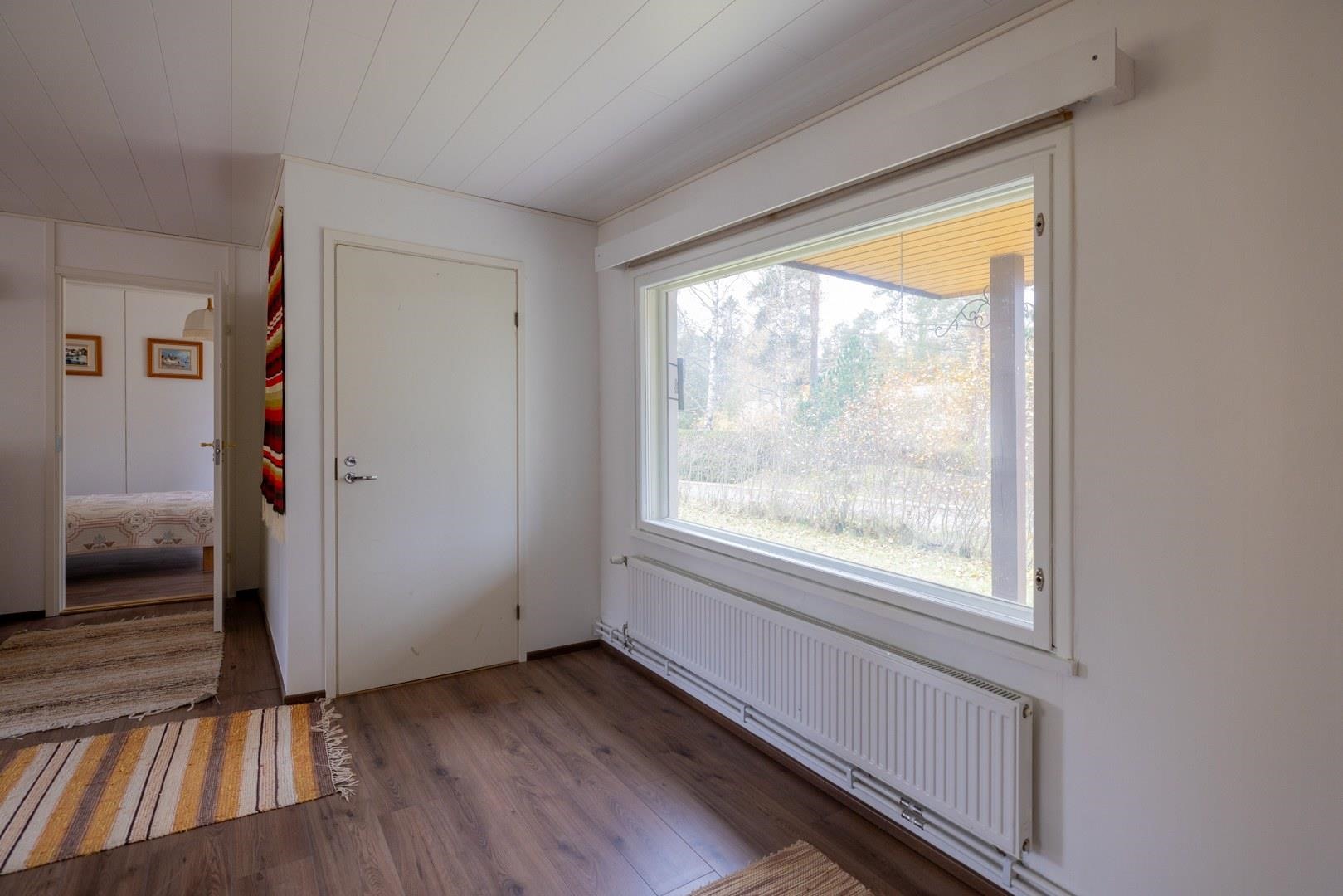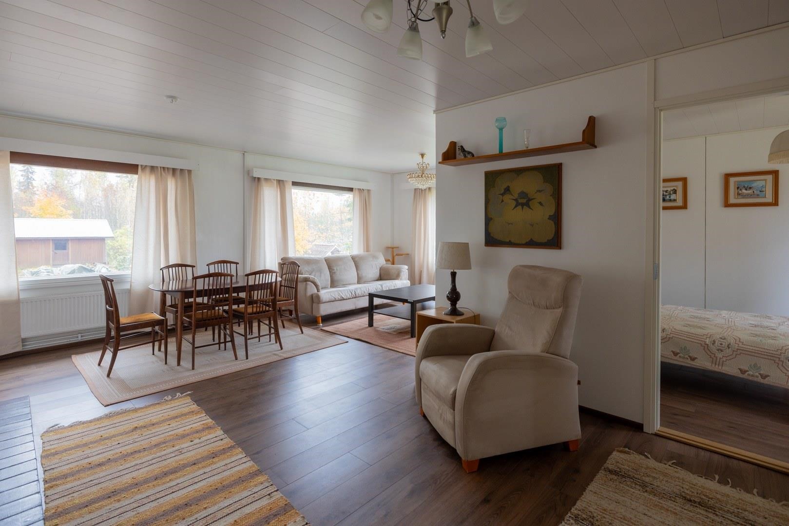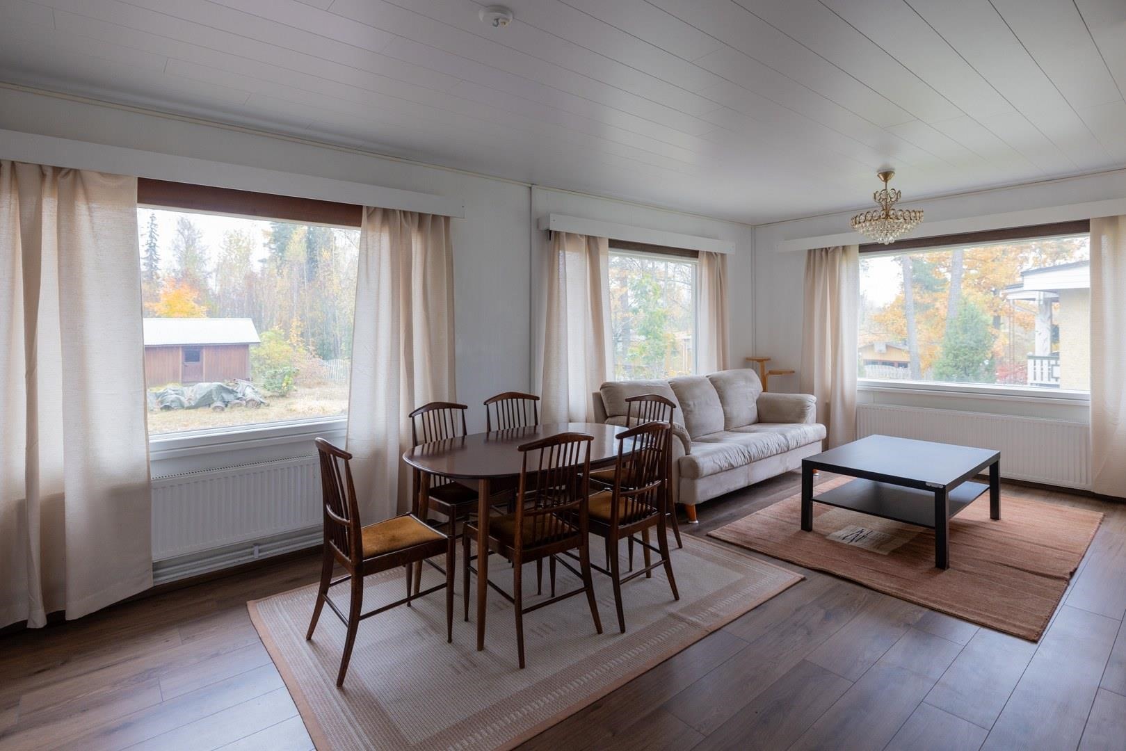 Keittiö: Laminaattilattia, seinät on maalattu,välitilassa laatta.. Olohuone: Laminaattilattia,seinät on maalattu.. Makuuhuone 1: Laminaattilattia,seinät on maalattu.. Makuuhuone 2: Laminaattilattia,seinät on maalattu.. Sauna: Paneloitu. Kylpyhuone: Kaakeloitu. Eteinen: Laminaattilattia,seinät on maalattu. Wc: Seinät maalattu, lattiassa muovimatto..