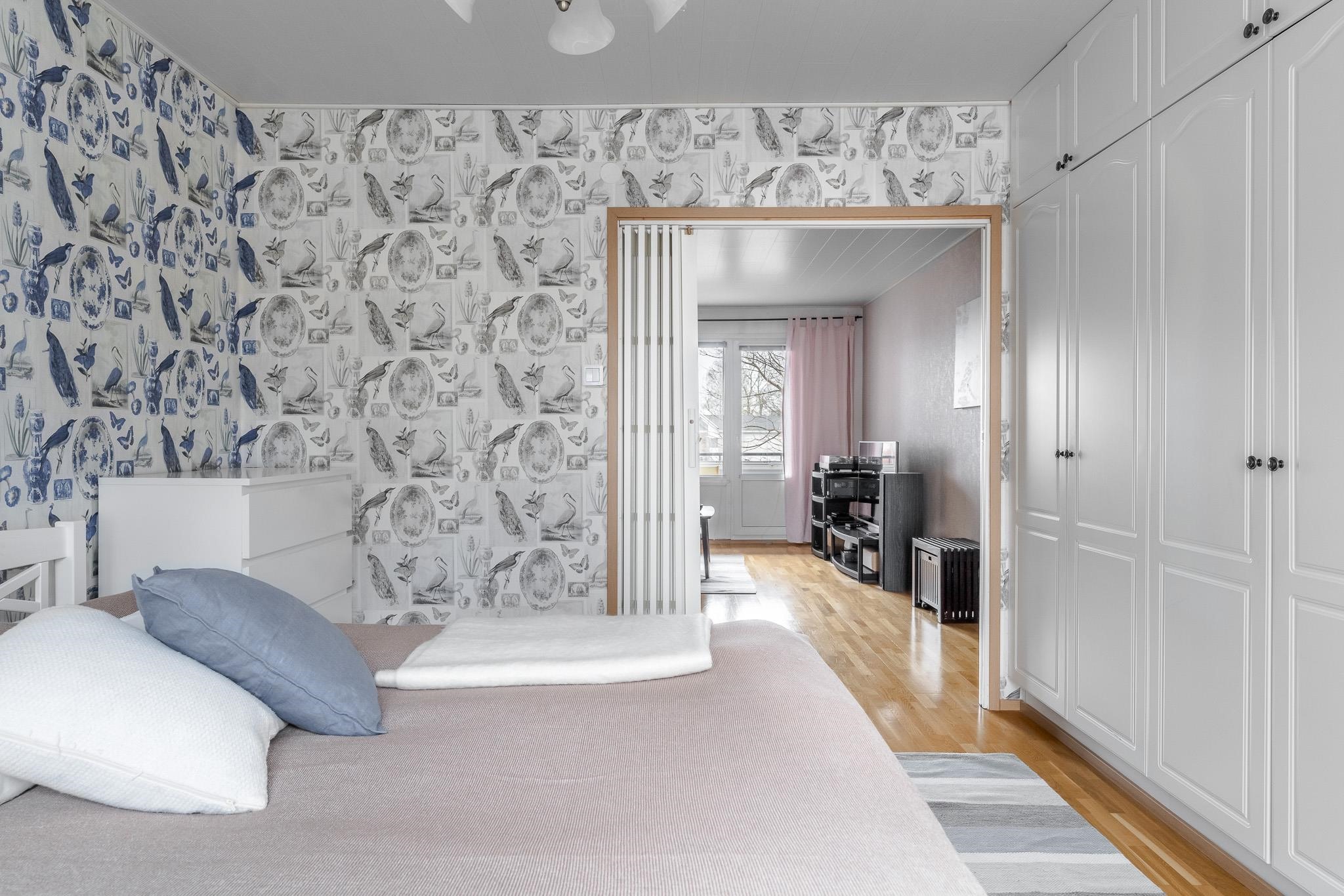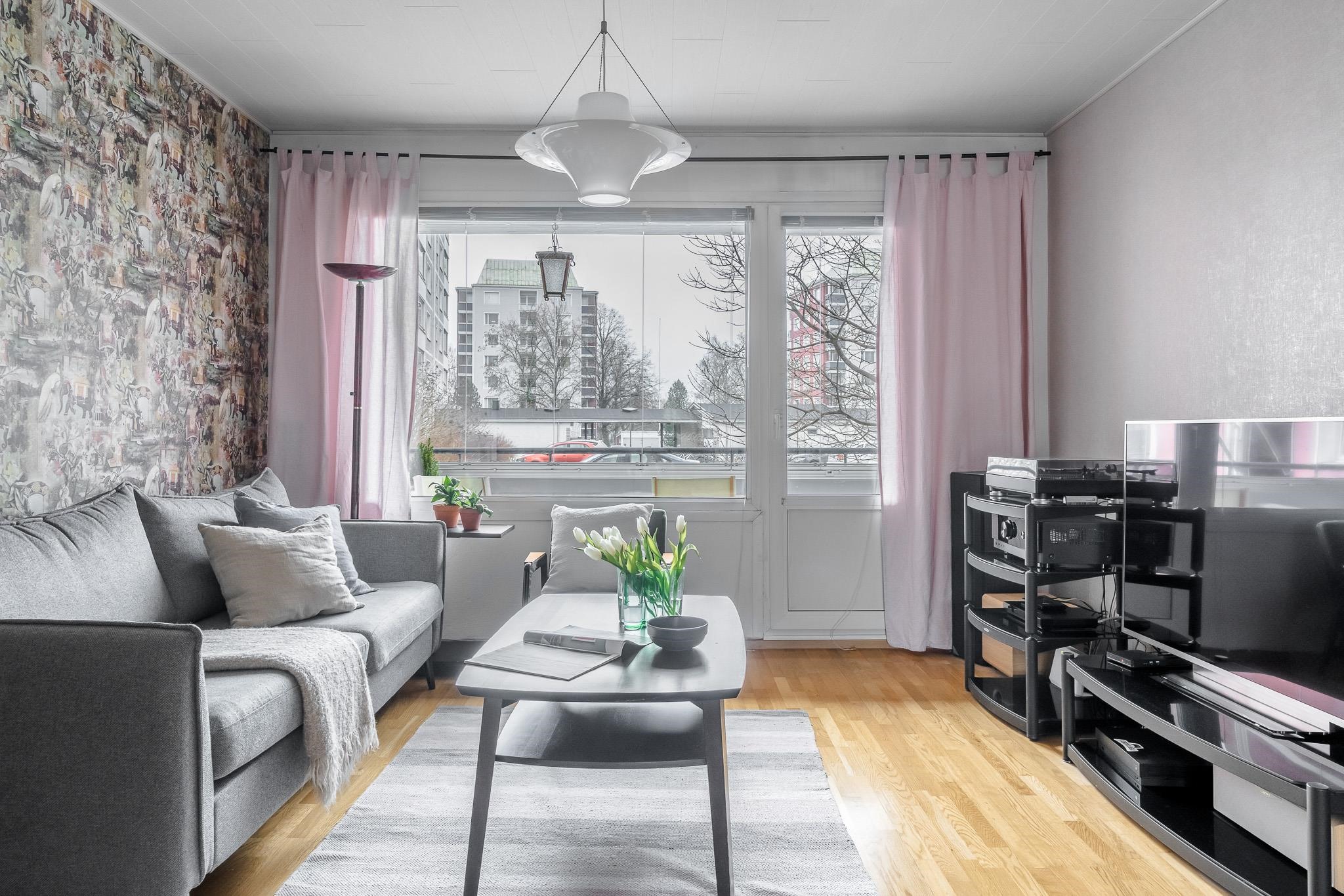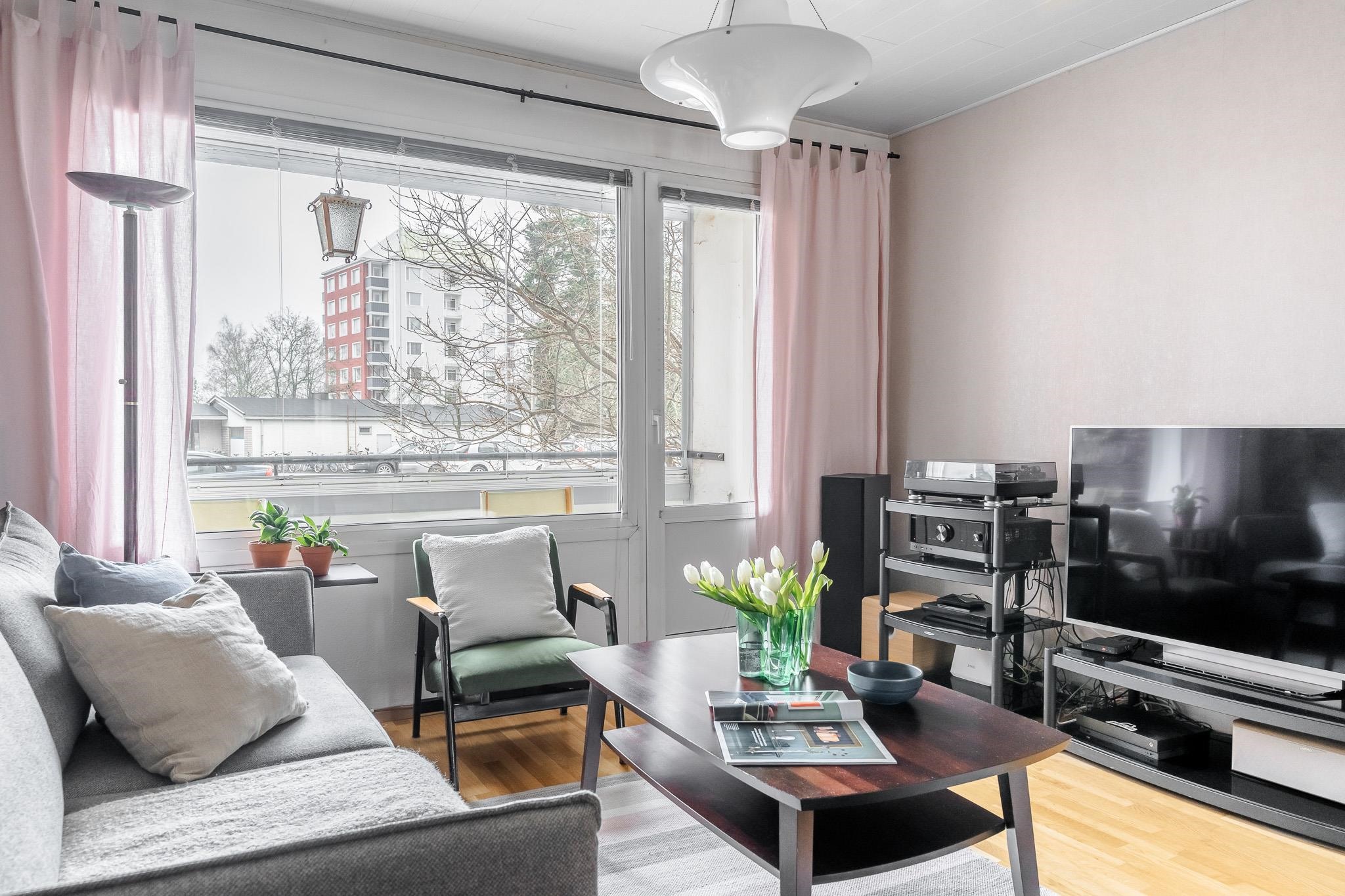Keittiö: Parkettilattia, lasikuitutapettia. Olohuone: Parkettilattia, tapetti. Makuuhuone 1: Parkettilattia, tapetti. Makuuhuone 2: Parkettilattia, tapettia, puolipaneeli. Kylpyhuone: Kokonaan laattaa. Eteinen: Parkettilattia, tapetti.