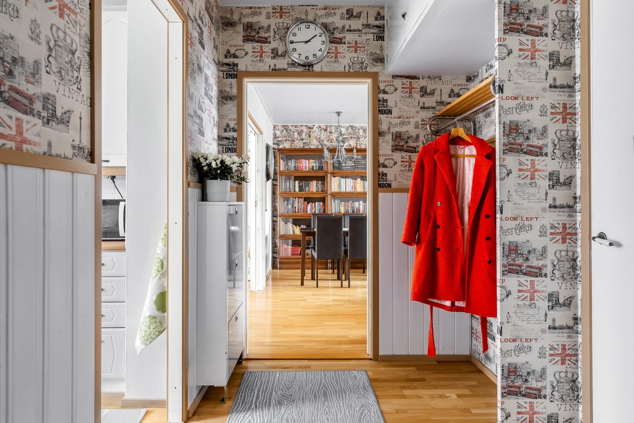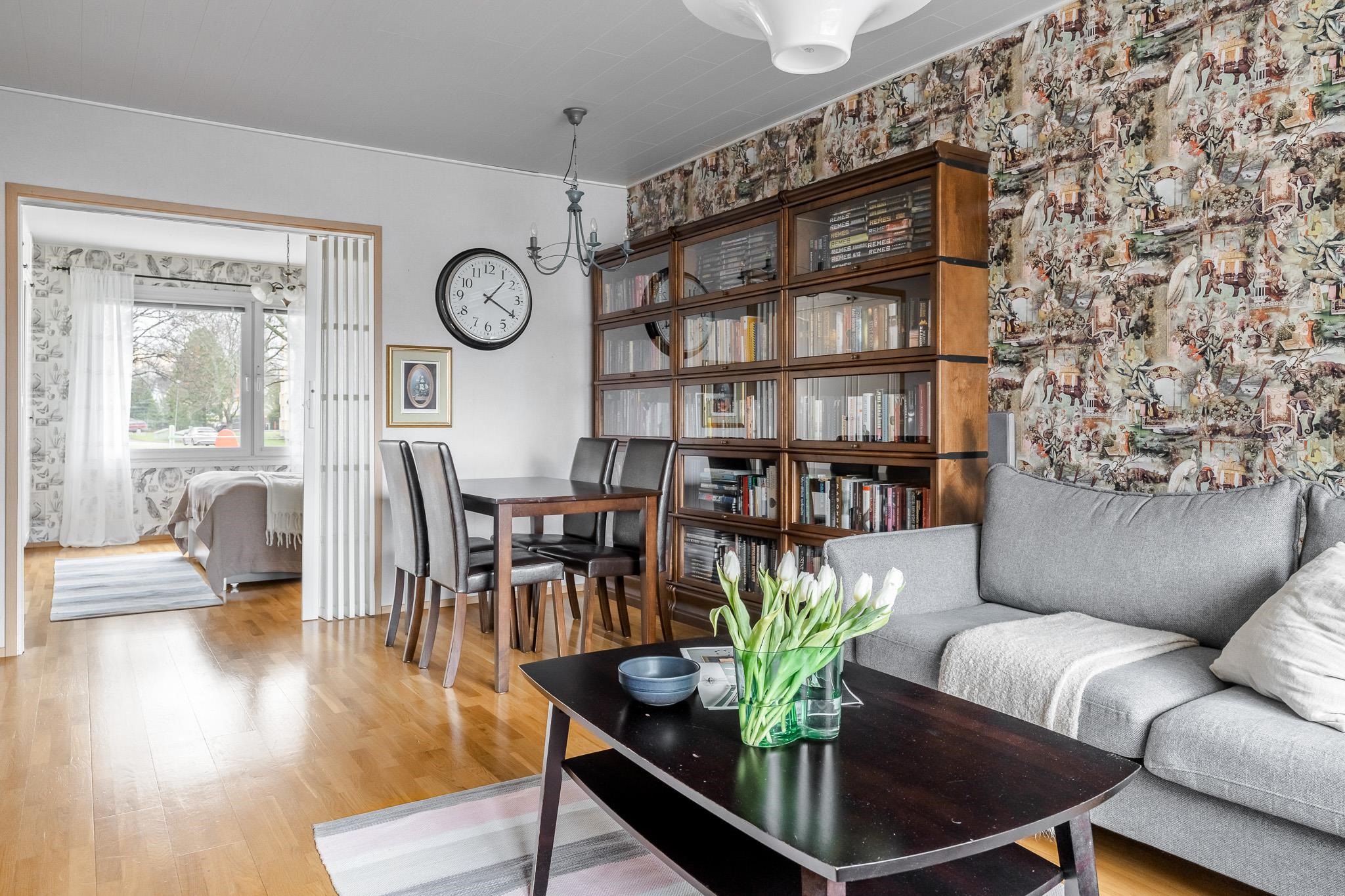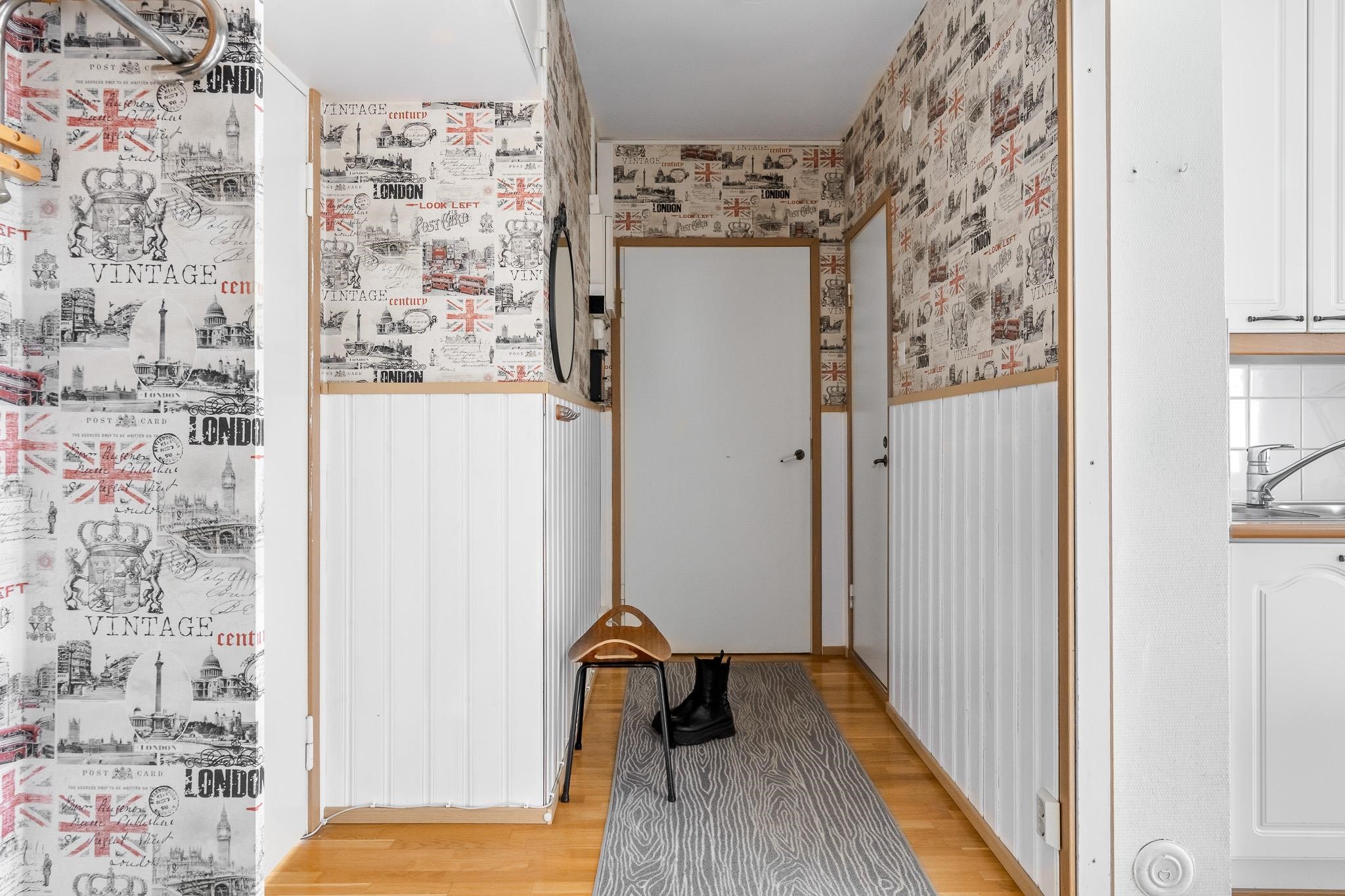 Keittiö: Parkettilattia, lasikuitutapettia. Olohuone: Parkettilattia, tapetti. Makuuhuone 1: Parkettilattia, tapetti. Makuuhuone 2: Parkettilattia, tapettia, puolipaneeli. Kylpyhuone: Kokonaan laattaa. Eteinen: Parkettilattia, tapetti.