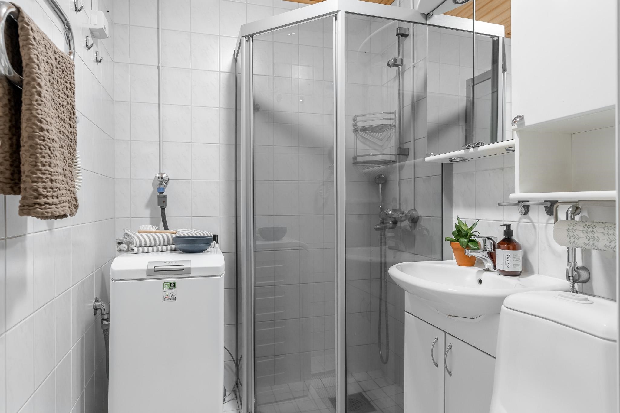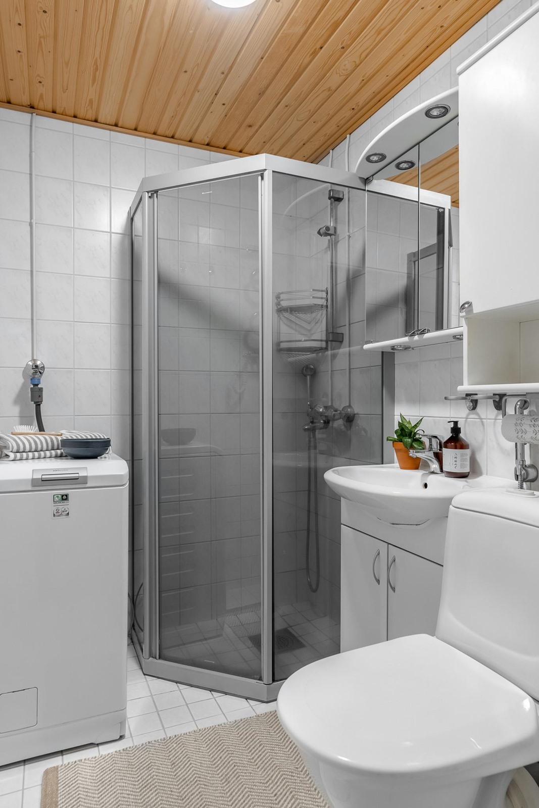 - Kylpyhuone, suihku, suihkukaappi, suihkuseinä, peilikaappi, allaskaappi, pesukoneliitäntä, lattialämmitys vesikiertoinen, kiinteät valaisimet. Kaappi seinällä