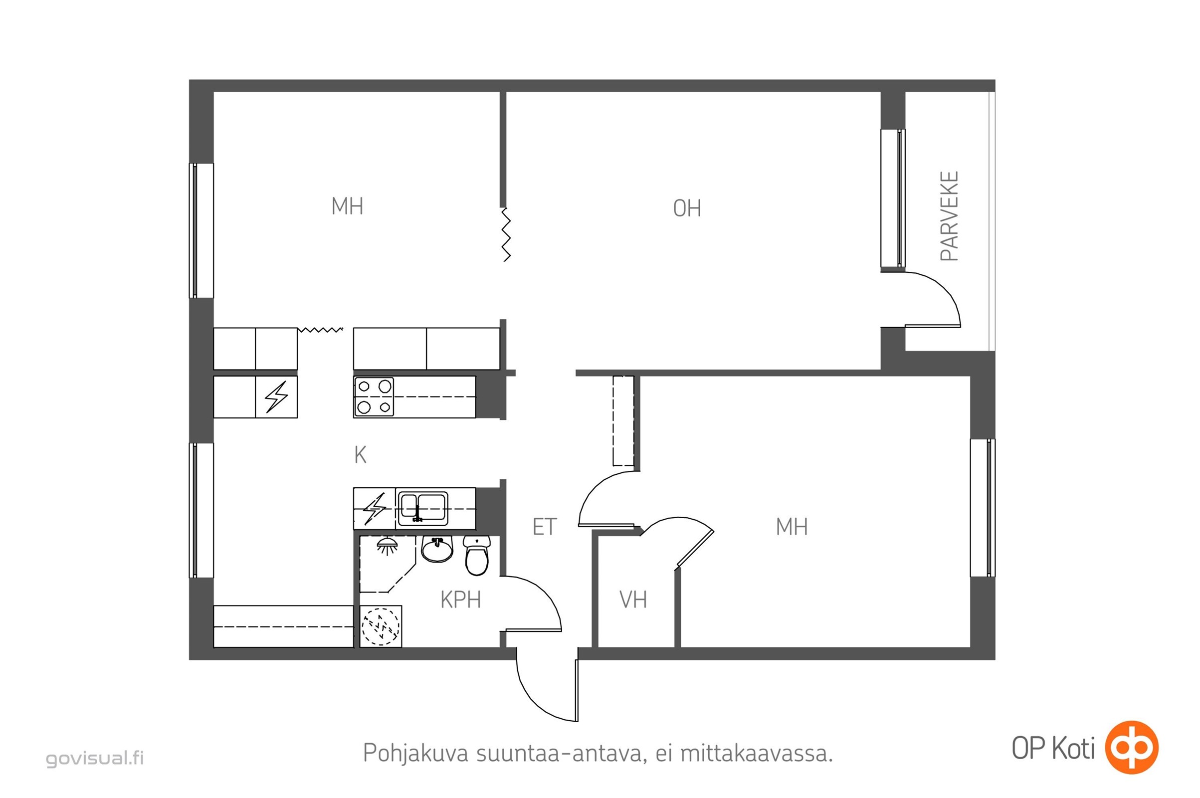 - Olohuone ja toinen makuuhuone etelään, keittiö ja toinen makuuhuone pohjoiseen.