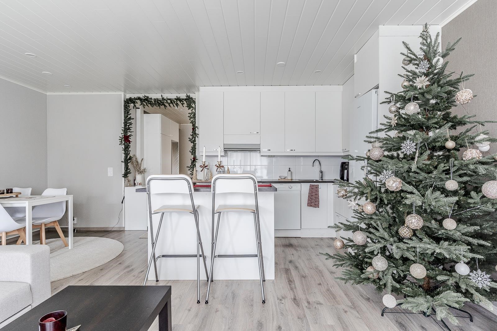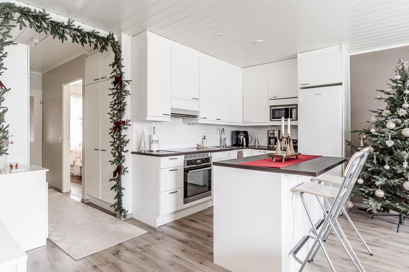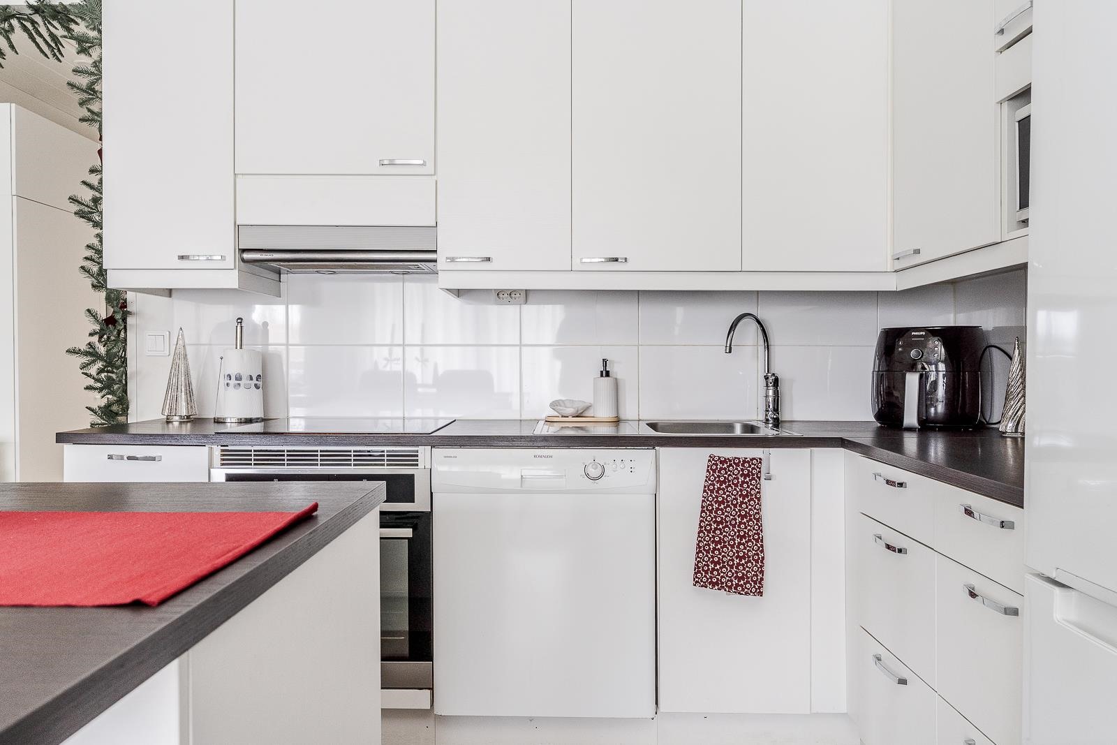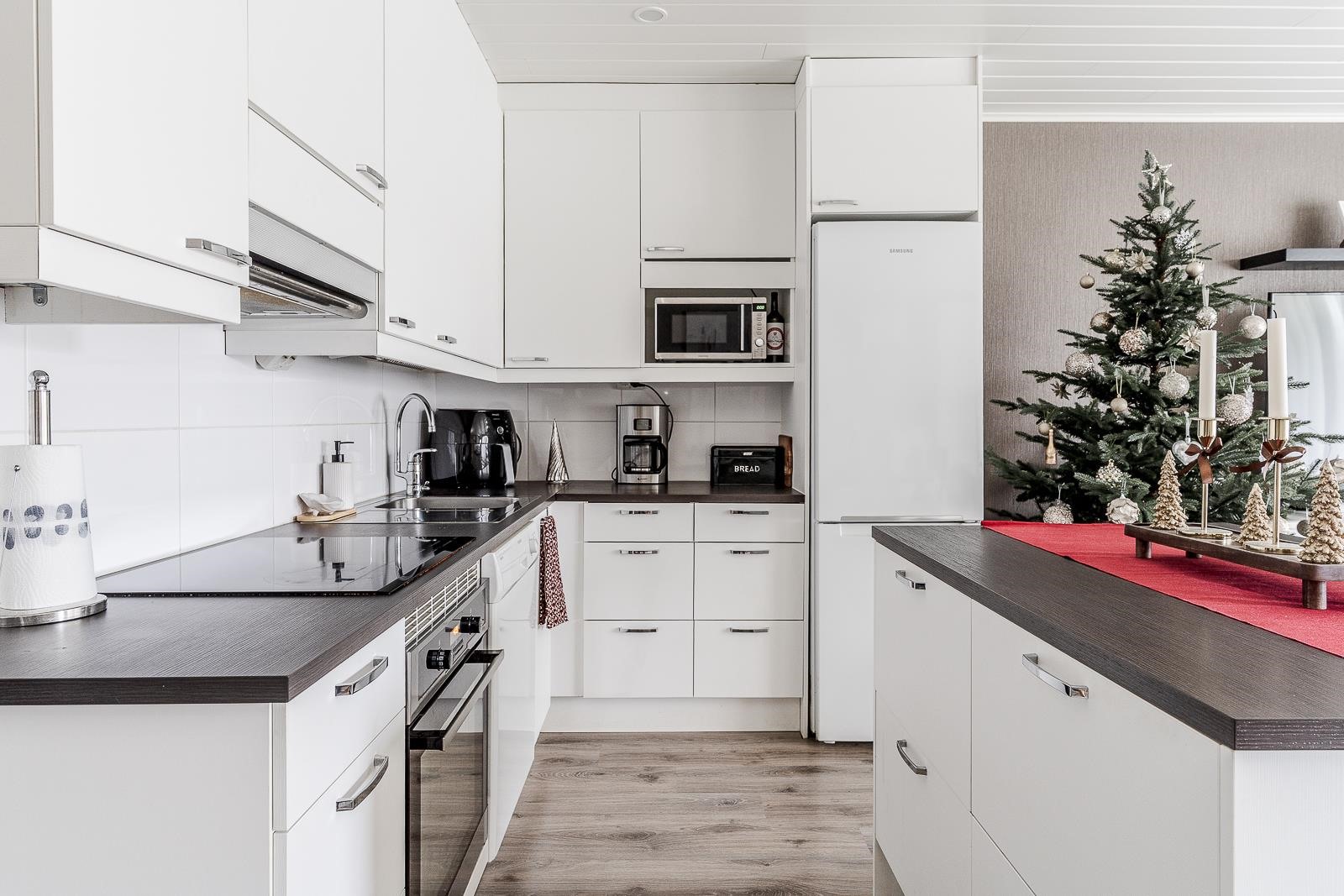 - Jääkaappipakastin, erillisuuni, liesitaso, induktioliesi, liesituuletin, astianpesukone, kaapistot, irralliset saarekkeet, kiinteät valaisimet.