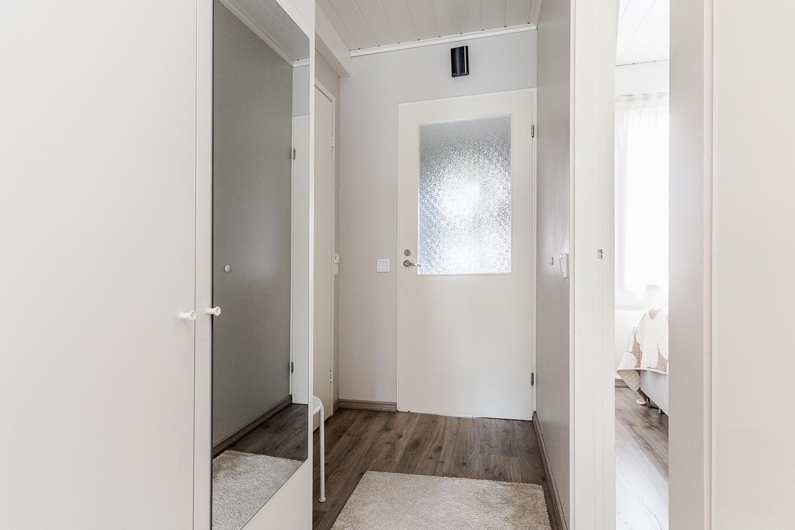 Keittiö: Lattia laminaatti, seinät tapetti, katto paneeli. Olohuone: Lattia laminaatti, seinät tapetti, katto paneeli. Makuuhuone 1: Lattia laminaatti, seinät tapetti, katto paneeli. Sauna: Lattia laatta, seinät paneeli, katto paneeli. Kylpyhuone: Lattia ja seinät laatta, katto paneeli. Eteinen: Lattia laminaatti, seinät tapetti, katto paneeli. Wc Kylpyhuoneen yhteydessä.