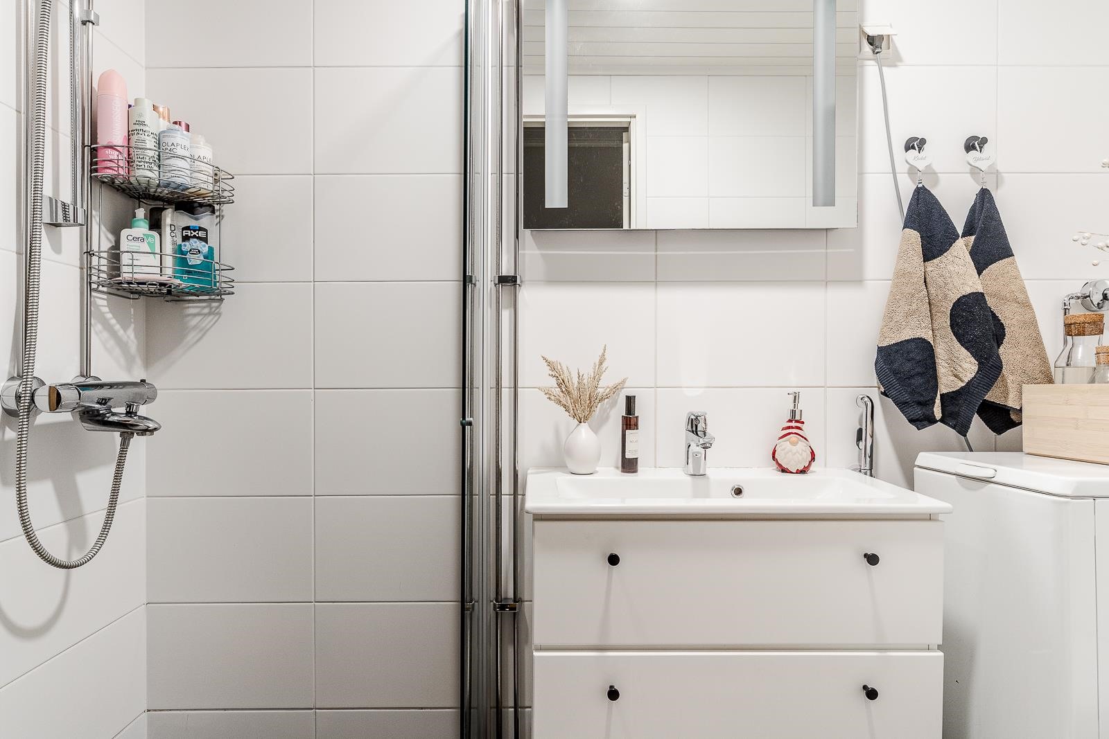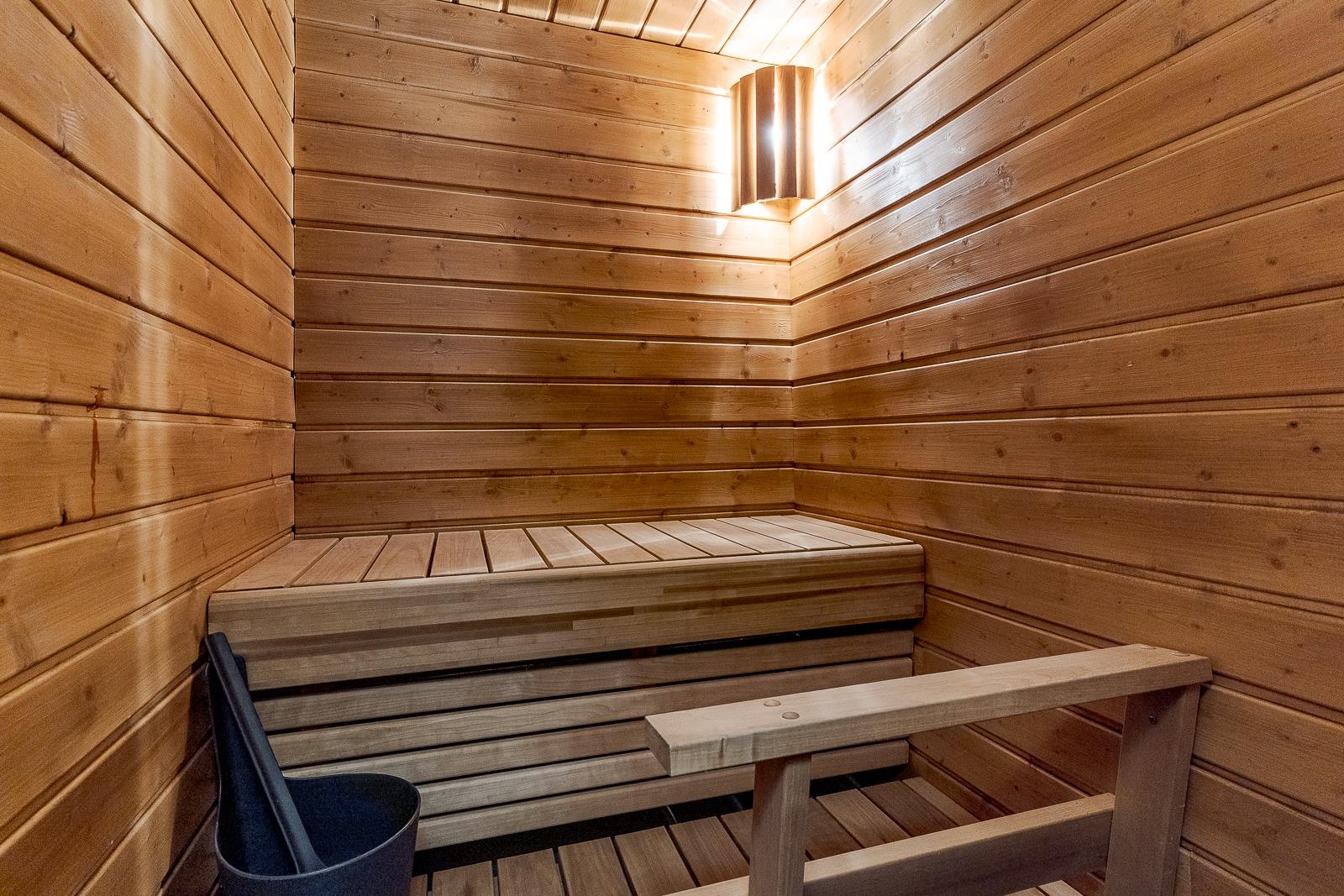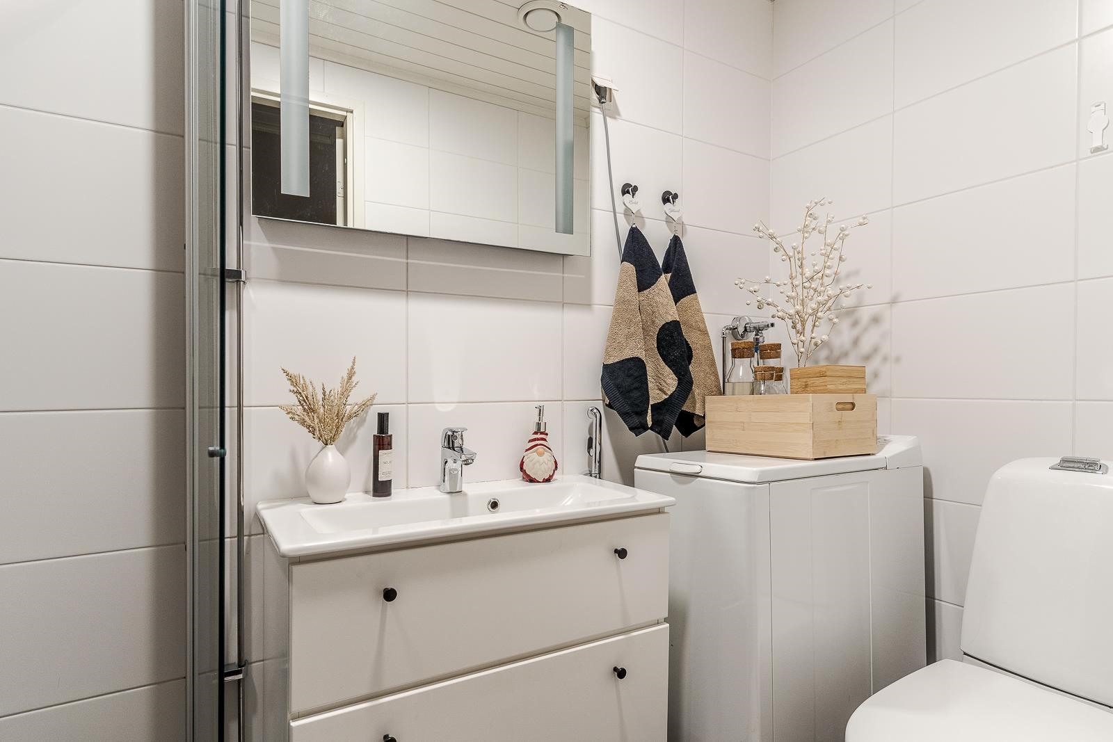 - Sauna, sähkökiuas, kylpyhuone, suihku, suihkuseinä, peilit, allaskaappi, pesukoneliitäntä, lattialämmitys, kiinteät valaisimet.