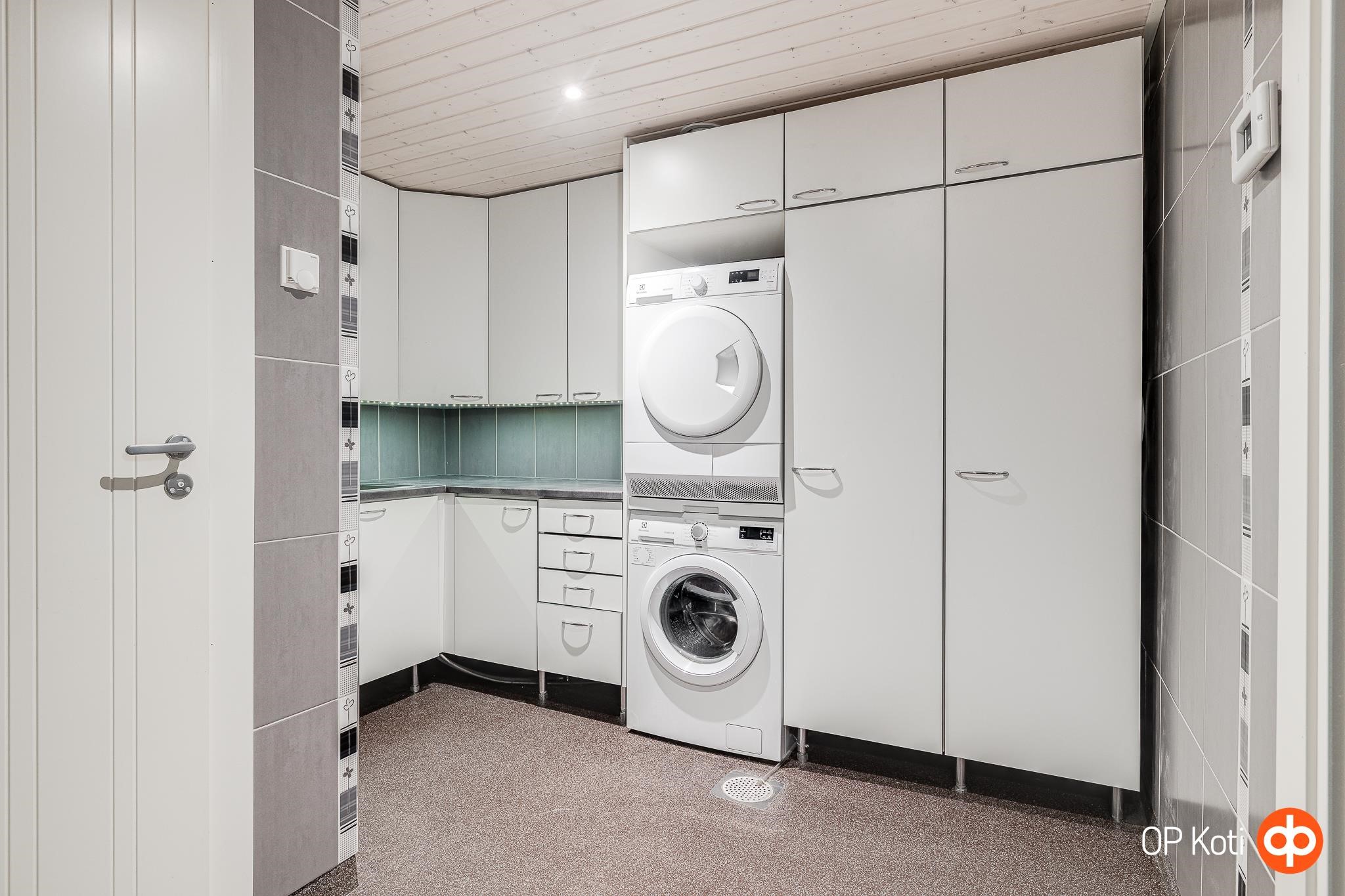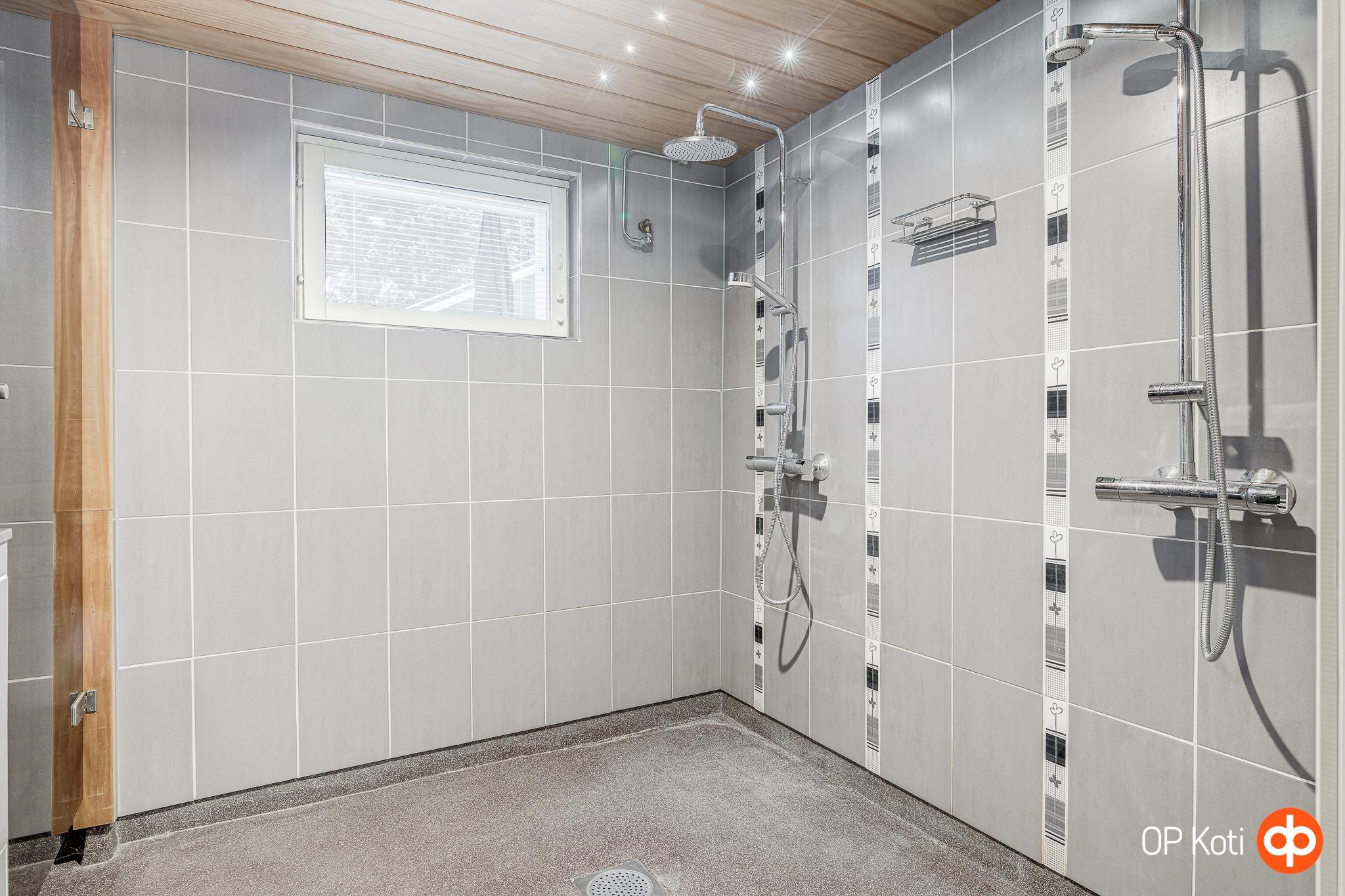 - Sauna, sähkökiuas, kylpyhuone 2 kpl, erillinen wc 2 kph alakerrassa sekä keskikerroksessa, suihku 3, suihkukaappi, peilikaappi, kaapit, allaskaappi, pesukoneliitäntä, lattialämmitys Vesikiertoinen (yläkerran kph sähköinen), kiinteät valaisimet led. Kylpyhuoneet on yläkerrassa ja alakerrassa.