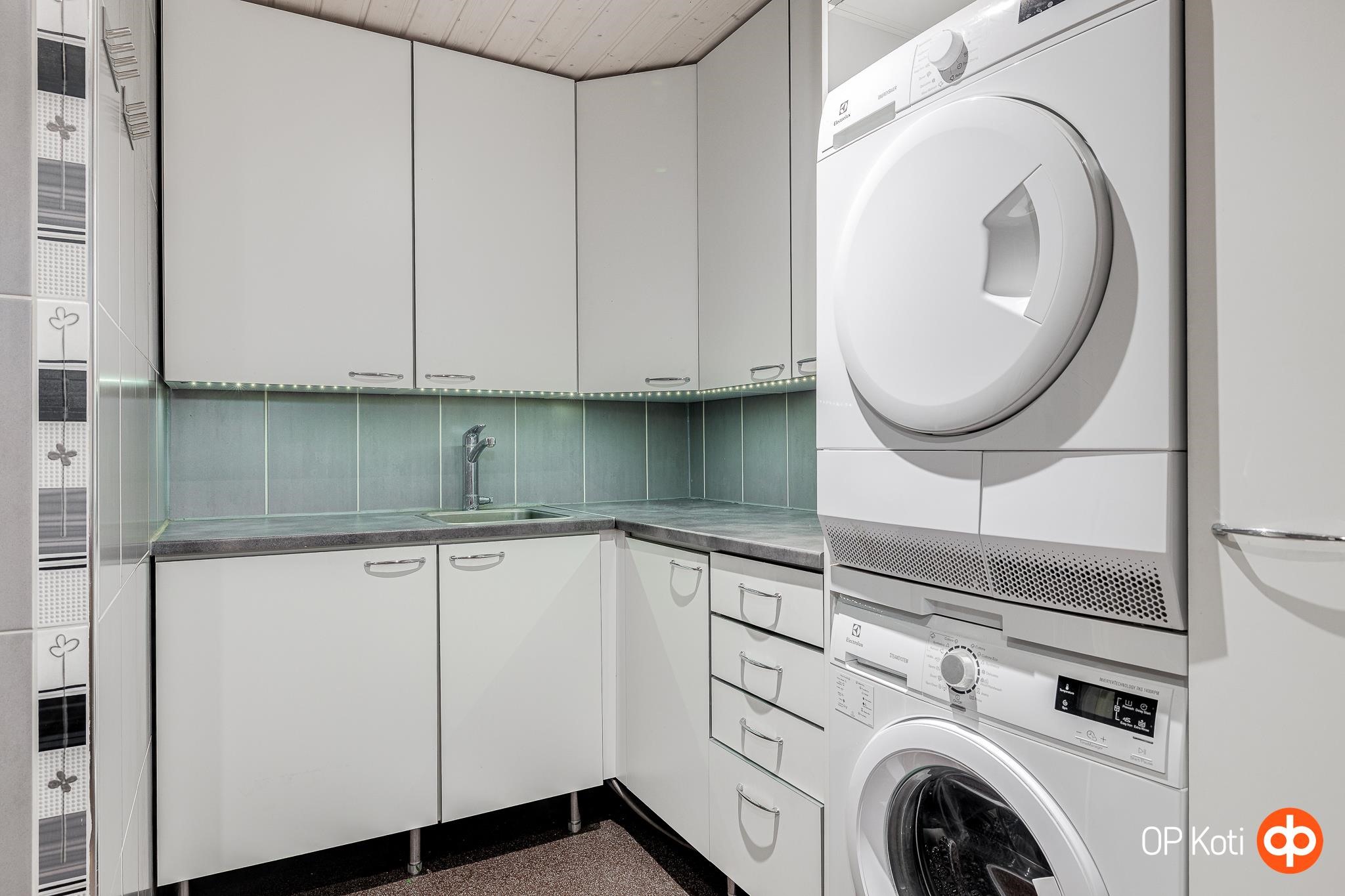 - Jääkaappi, pakastekaappi, keraaminen liesi, liesituuletin, mikroaaltouuni, astianpesukone, kaapistot Aallon kaluste, kiinteät valaisimet led, pöytätasojen materiaali kalustelevy.