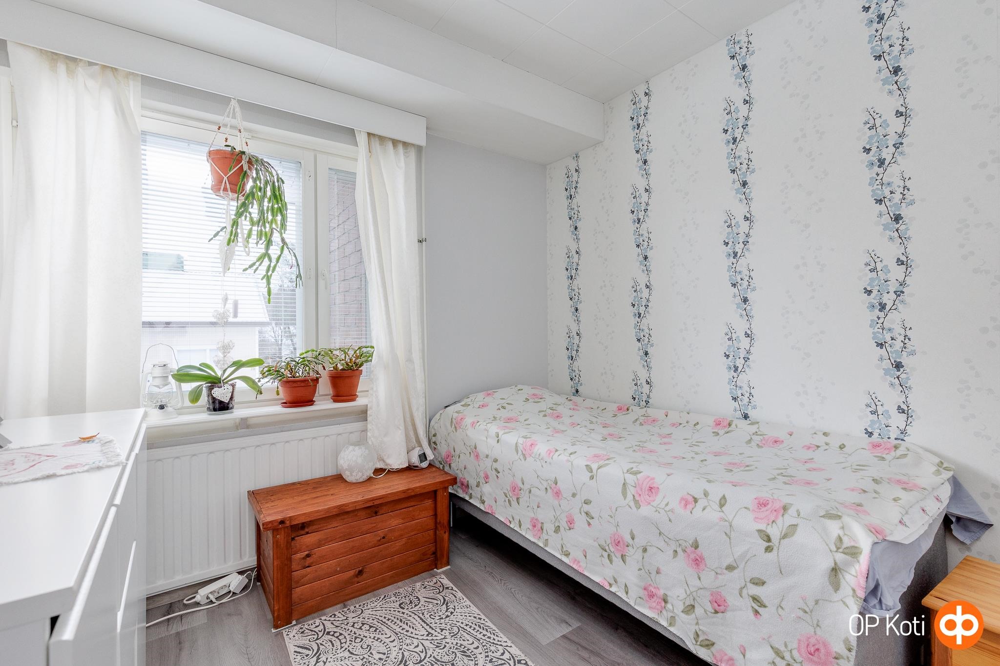 Asunnossa on kaksi kompaktia makuuhuonetta, joissa molemmissa on vaatehuoneet, jotka helpottavat säilytystarpeita. Olohuone ja toinen makuuhuoneista on jaettu tilaa säästävällä liukuovella. Keittiö on remontoitu ja kodinkoneet uusittu vuonna 2016. Kylpyhuoneessa on lattialämmitys, mikä tuo mukavuutta arkeen. Sisäänkäynnin vieressä sijaitsee ulkovarasto, joka tarjoaa kätevää lisäsäilytystilaa. Lännen suuntaan avautuva takapiha on ihanteellinen paikka rentoutua; terassille mahtuu grilli, ruokailuryhmä ja muitakin ulkokalusteita, mikä tekee siitä täydellisen paikan kesäpäivien viettoon.