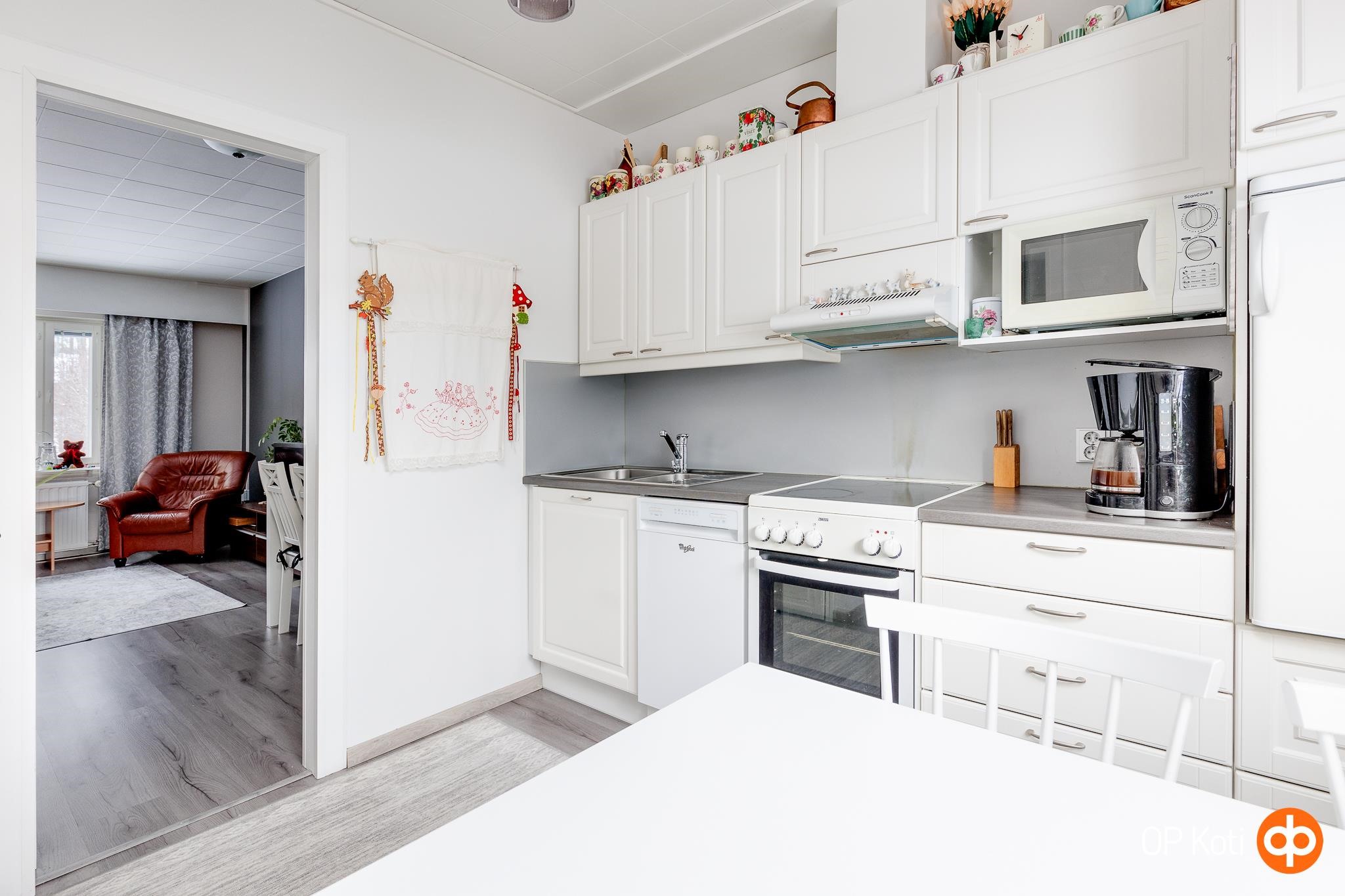 - Jääkaappi (uusittu 2016), sähköliesi, keraaminen liesi (uusittu 2016), liesituuletin (uusittu 2016), astianpesukone (uusittu 2016), kaapistot, kiinteät valaisimet.