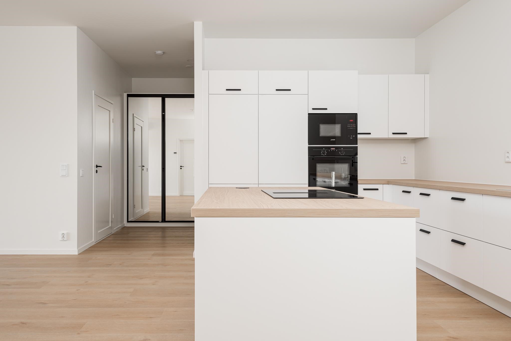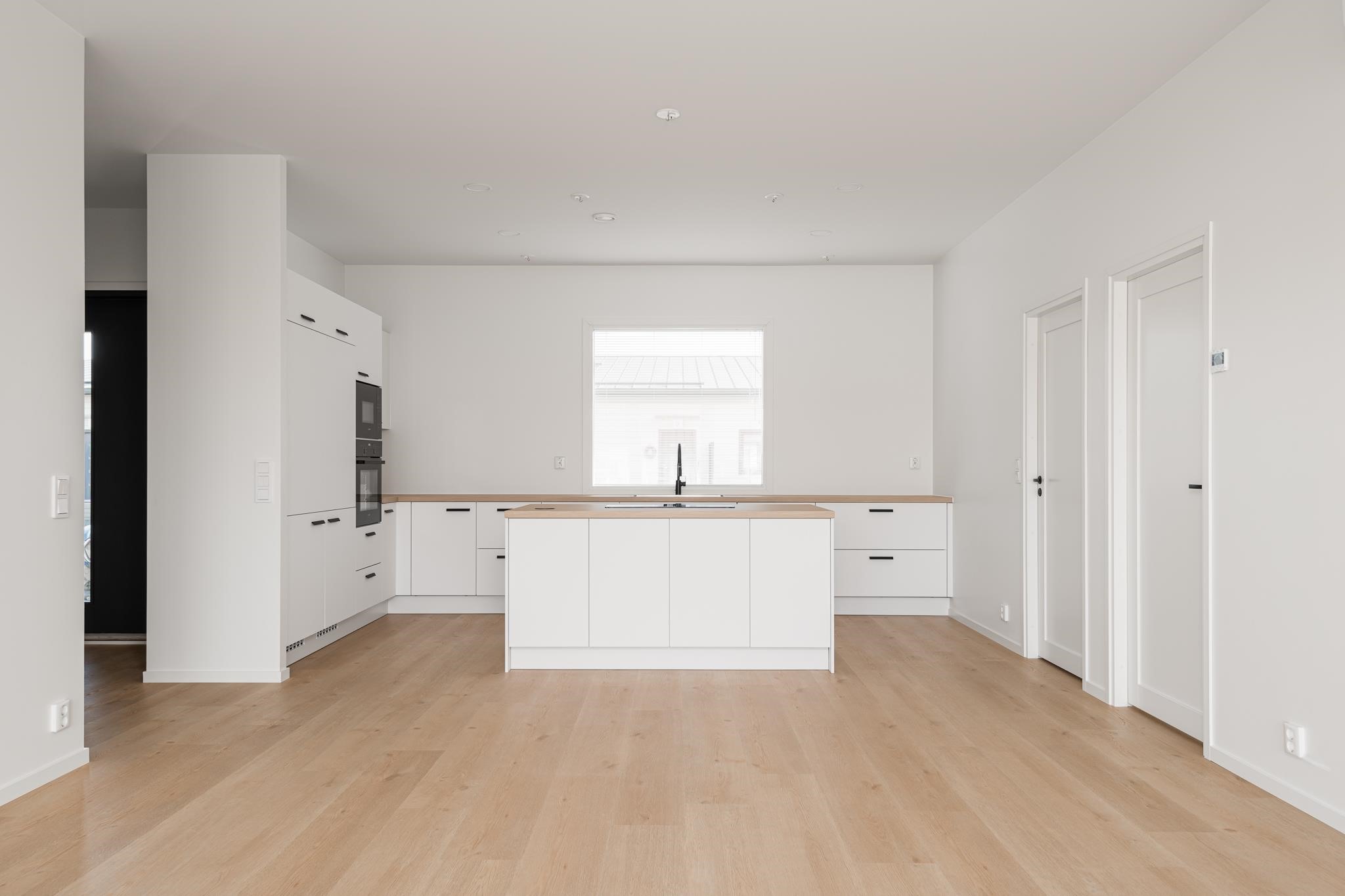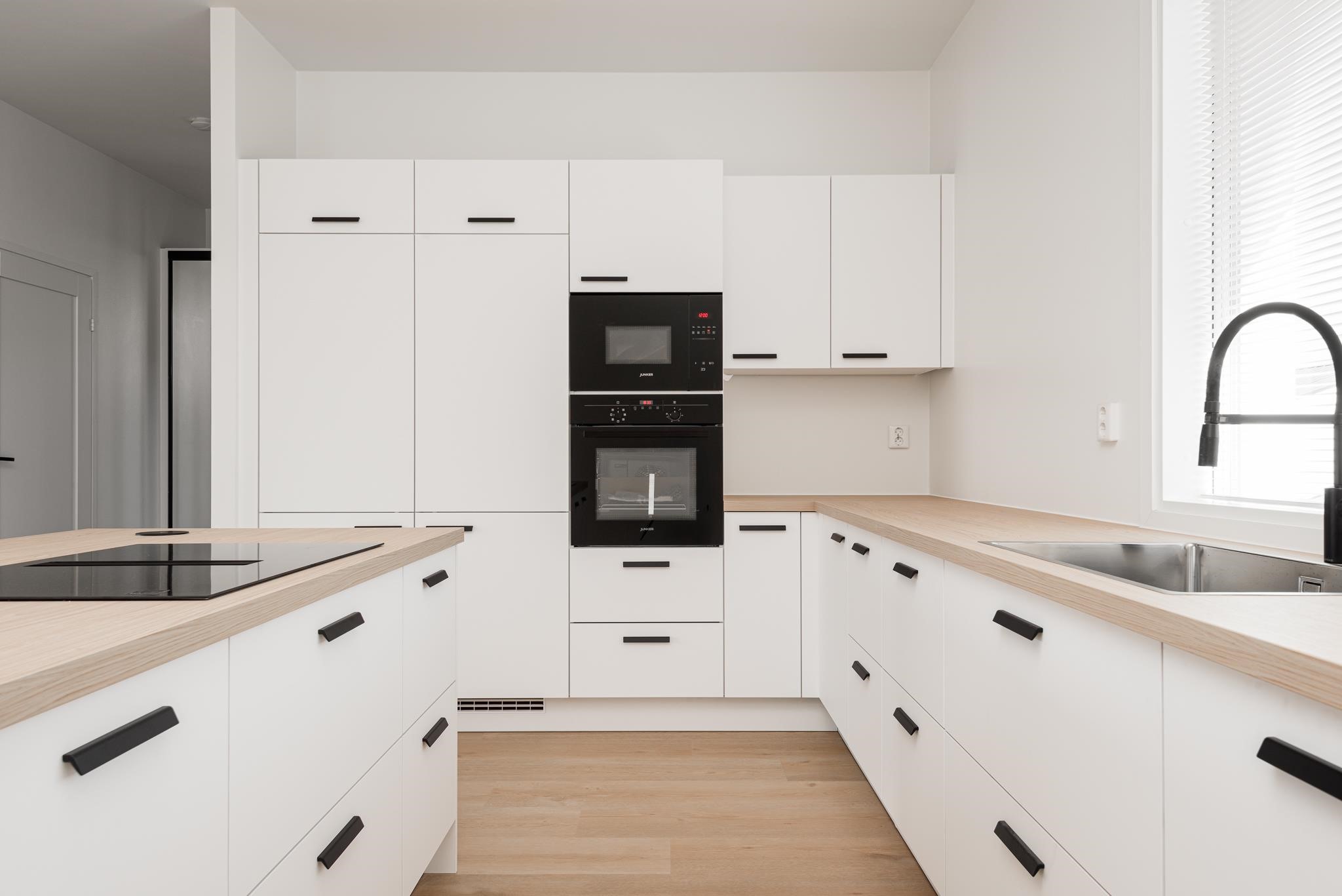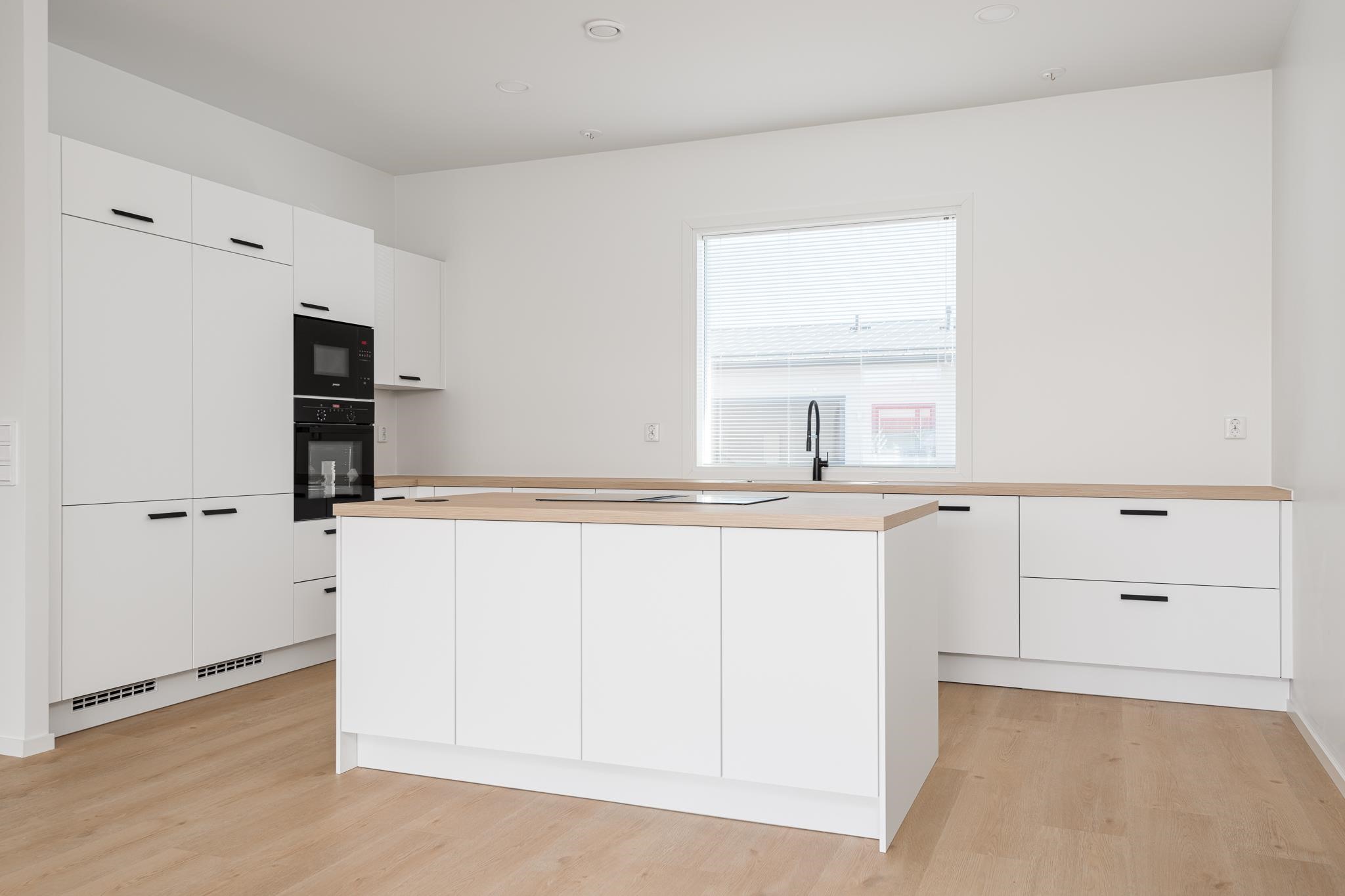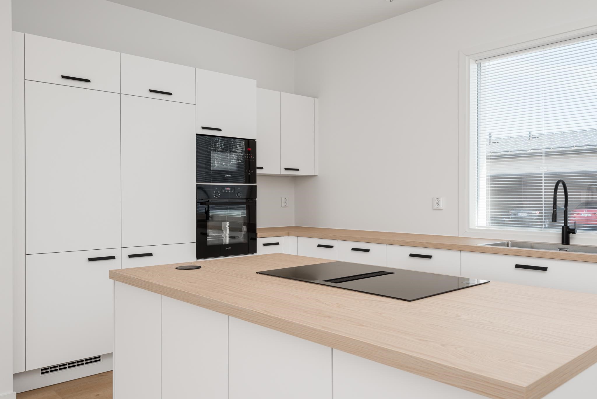 - Jääkaappi, pakastekaappi, erillisuuni, induktioliesi, liesituuletin saarekemalli, astianpesukone, kaapistot, kiinteät valaisimet.