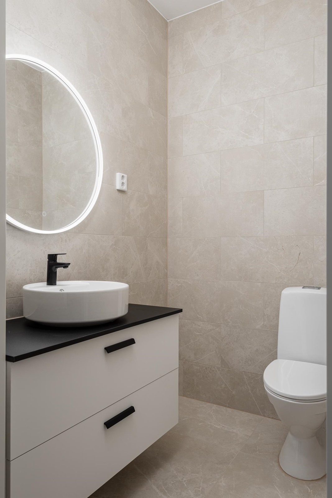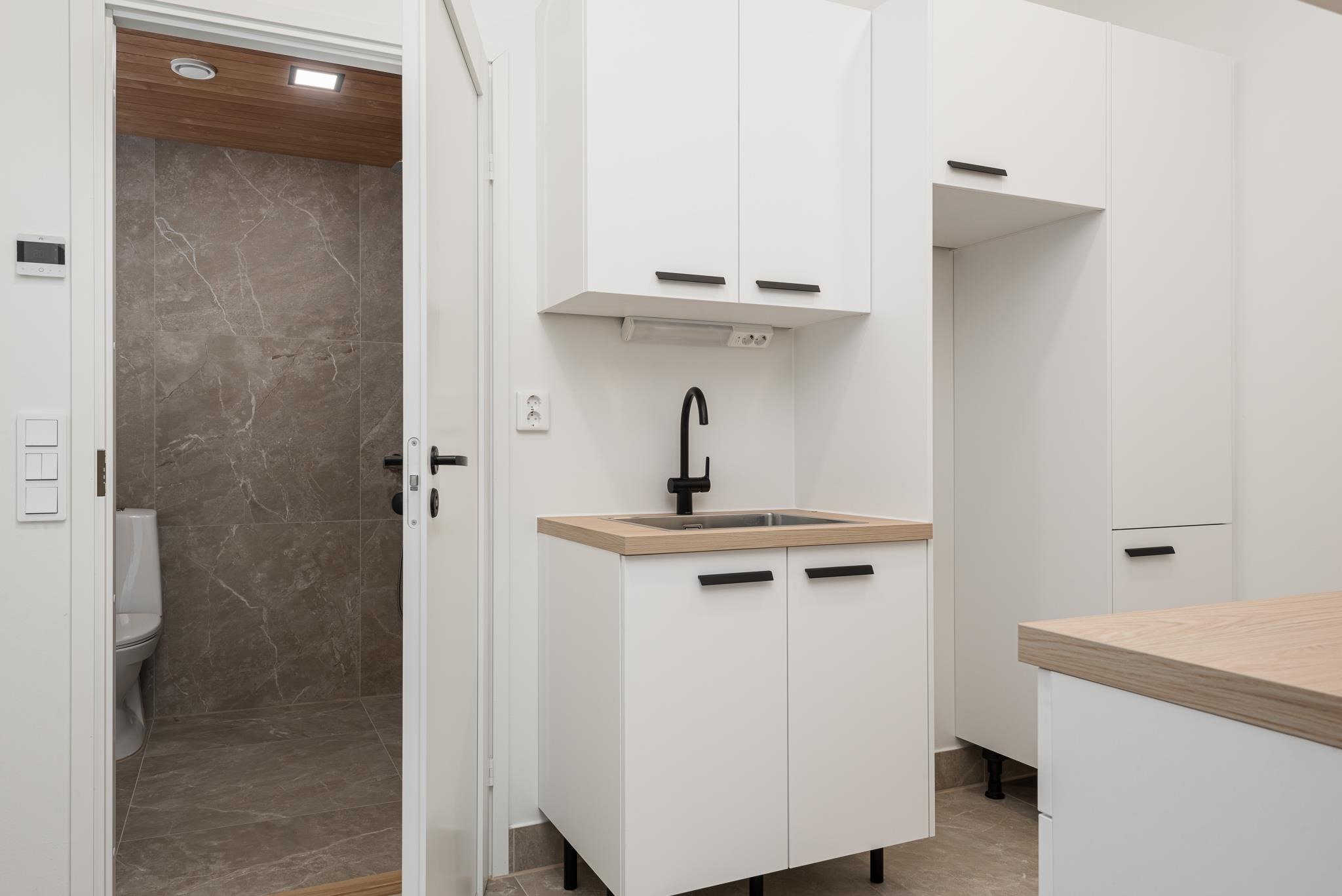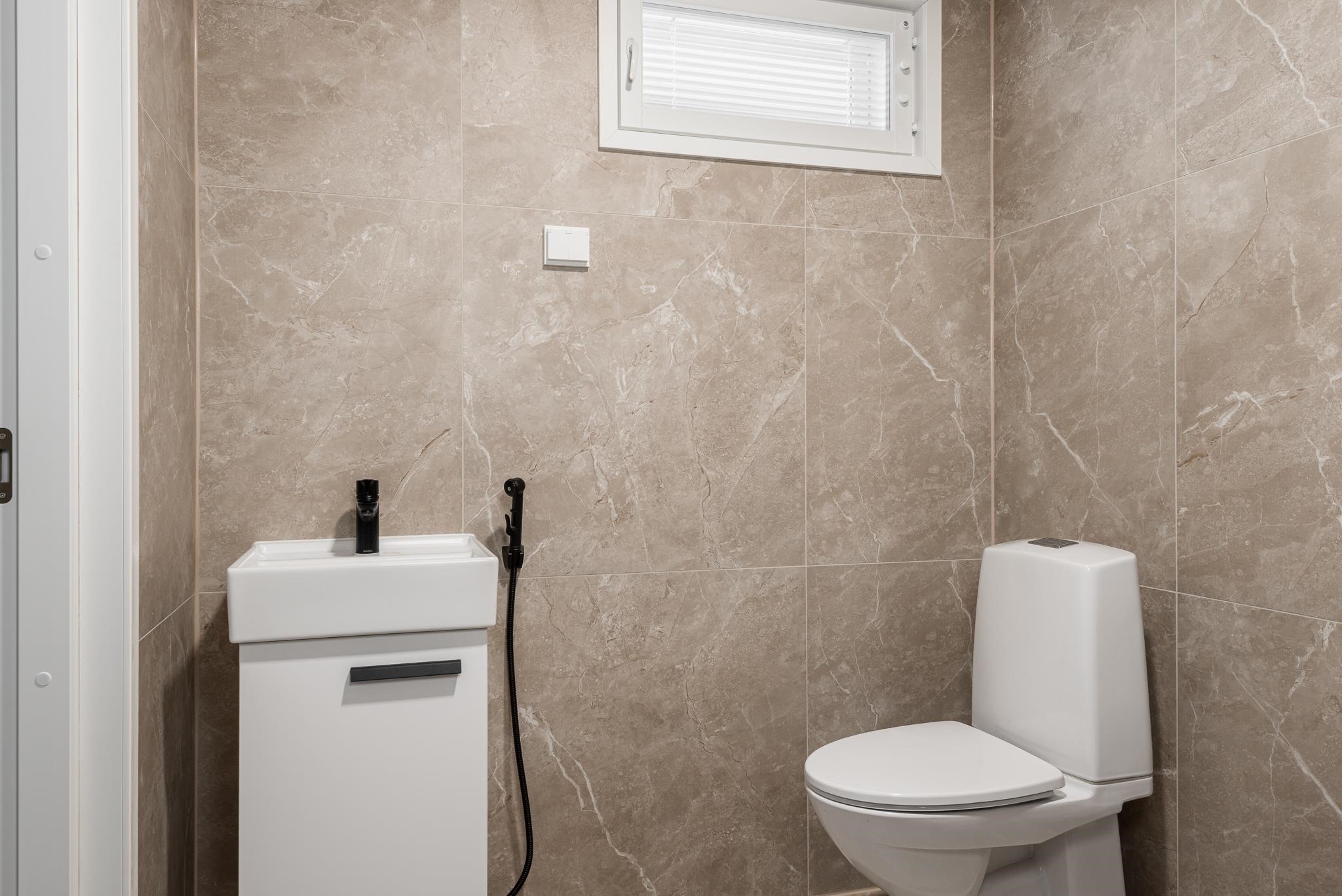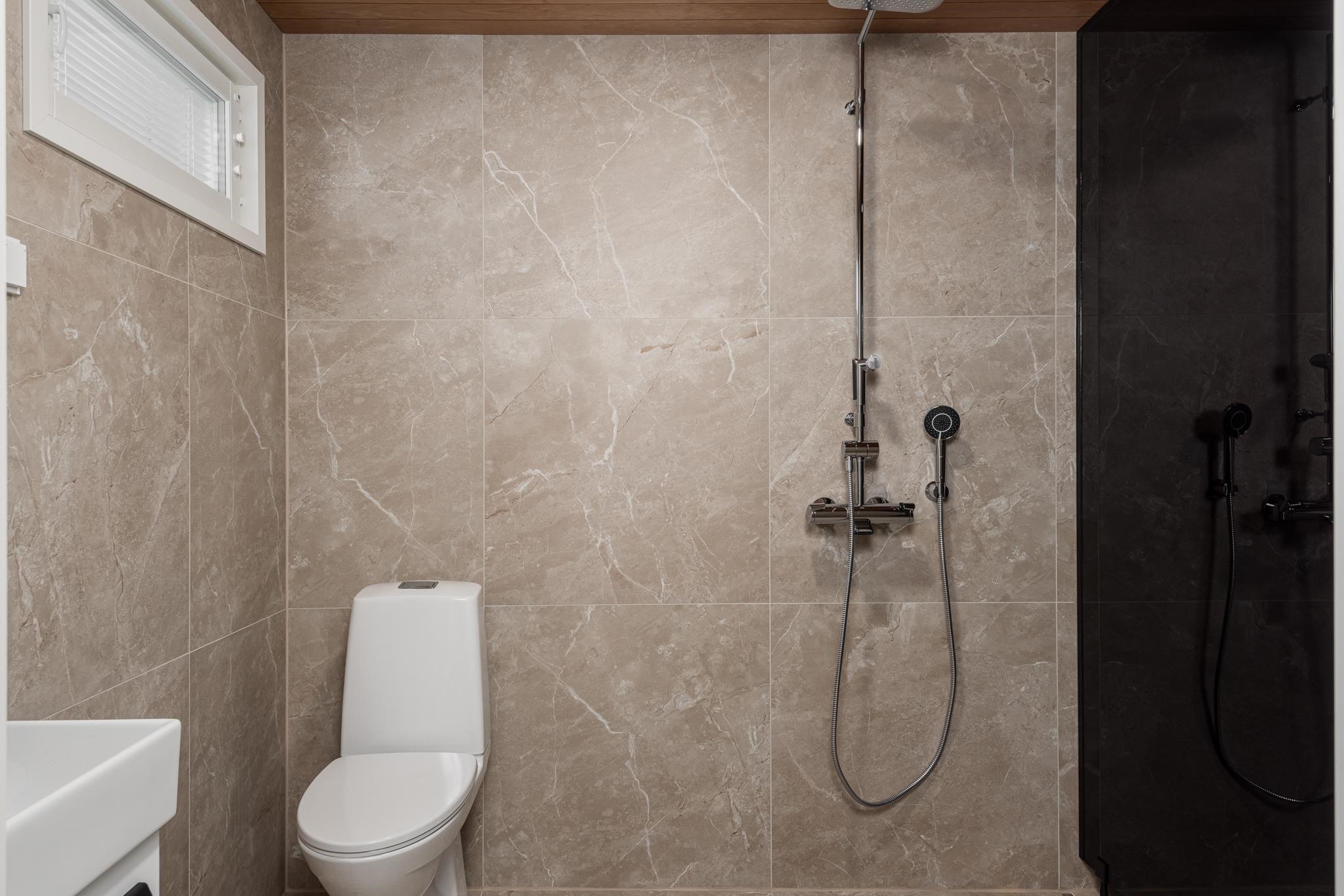 - Sauna, sähkökiuas, kylpyhuone, erillinen wc, suihku, peilit, kaapit, allaskaappi, pesukoneliitäntä, lattialämmitys koko asunto, kiinteät valaisimet.