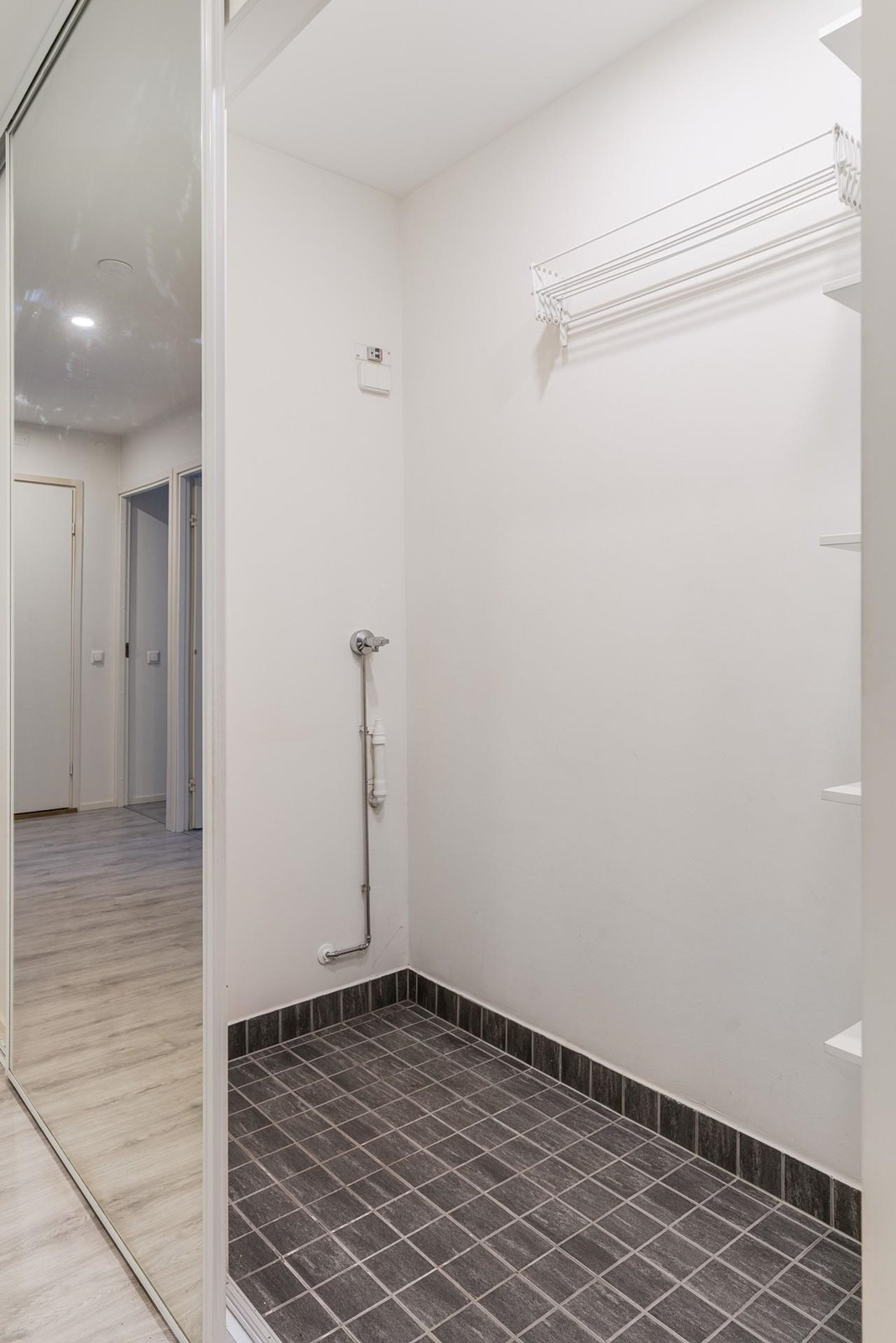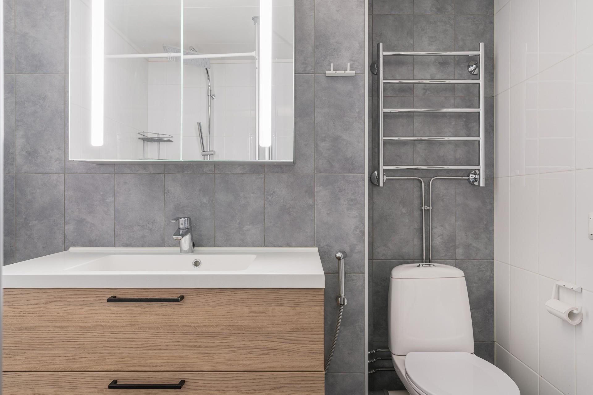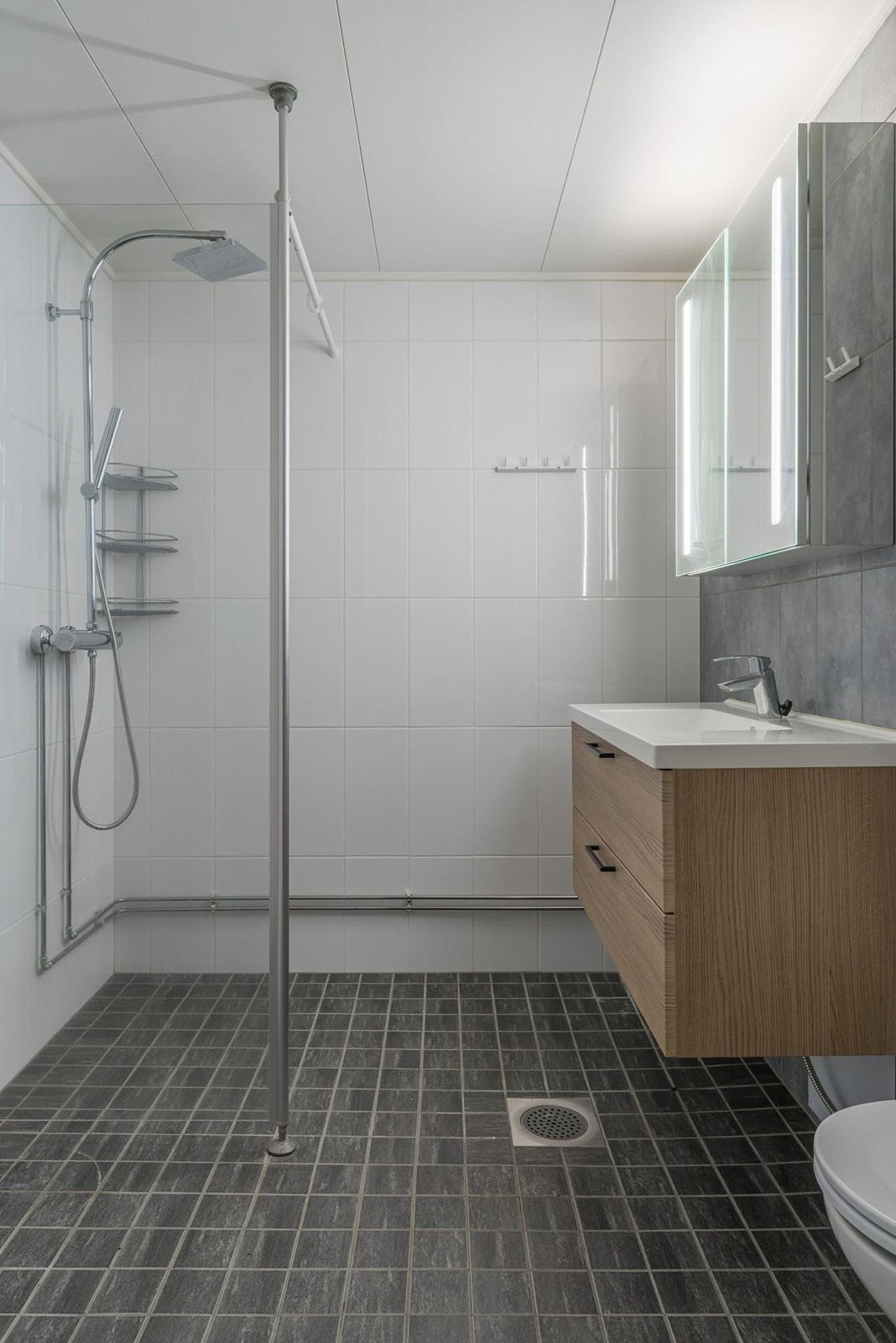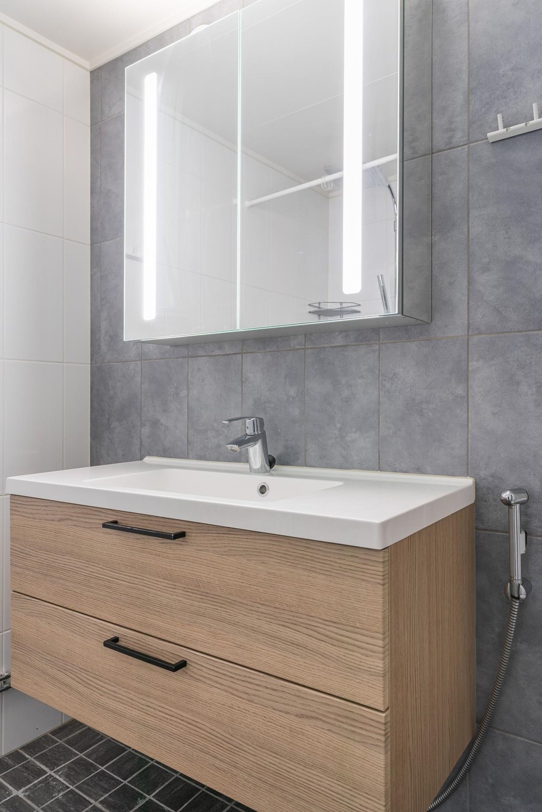 - Kylpyhuone, suihku sadesuihku, suihkuseinä, peilikaappi, kaapit, allaskaappi, pesukoneliitäntä kodinhoitohuone, lattialämmitys sähkö, kiinteät valaisimet, Pyyhepatteri , Bideesuihku.