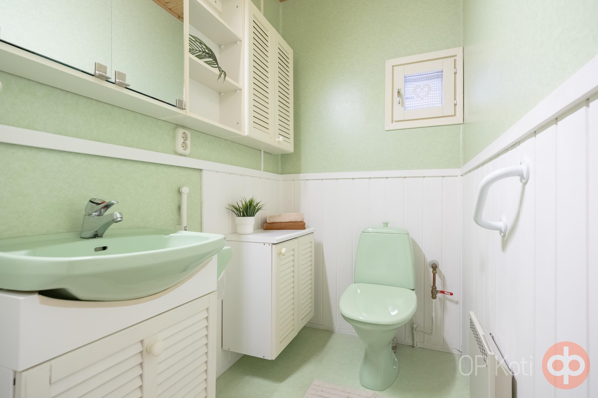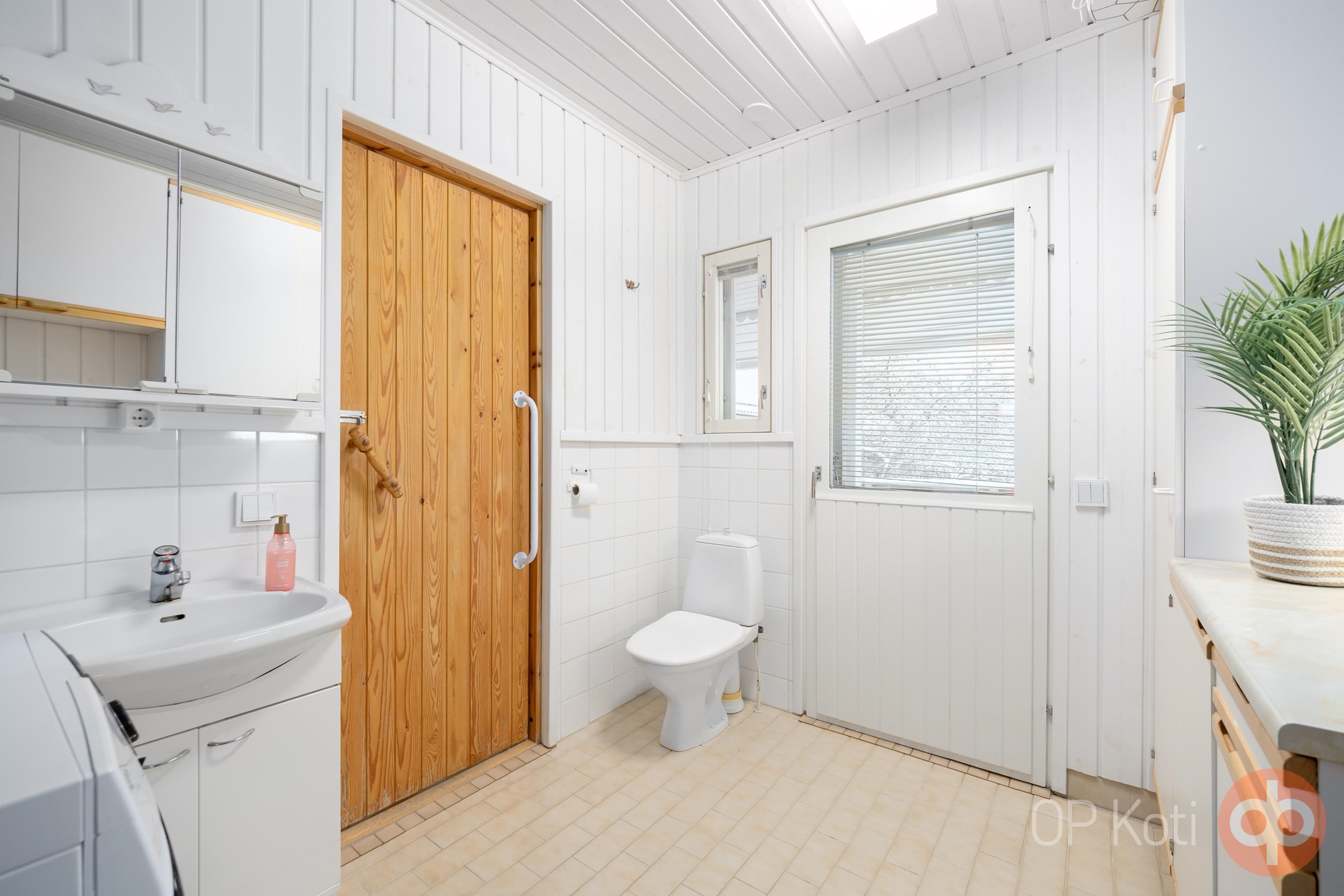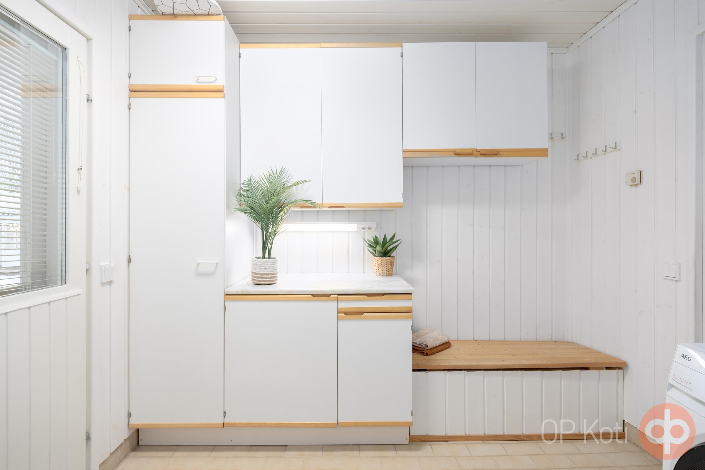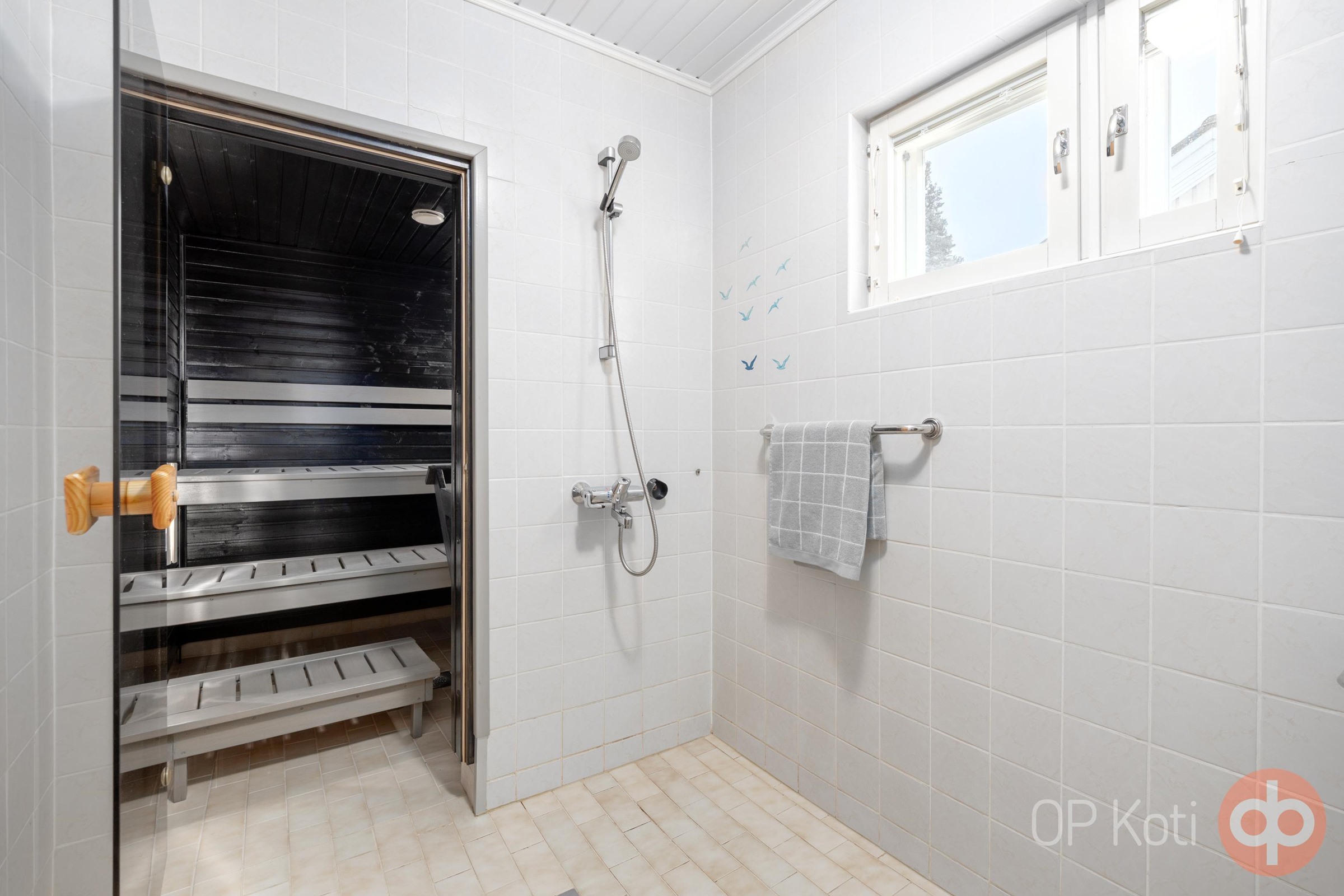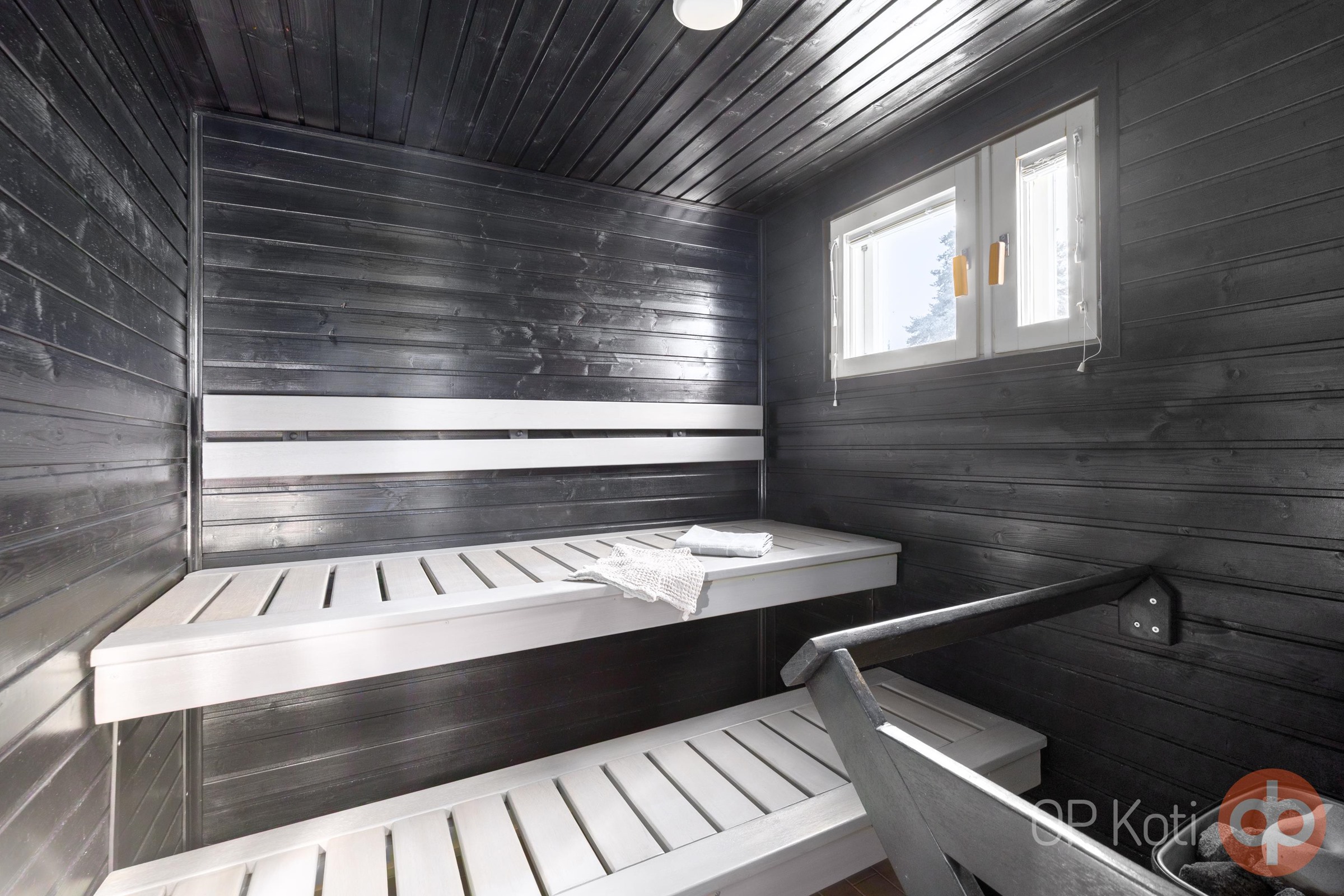 - Sauna, sähkökiuas, kylpyhuone, erillinen wc, suihku, peilikaappi, allaskaappi, pesukoneliitäntä. Pesuhuoneessa ja kodinhoitohuoneessa lattialämmitys