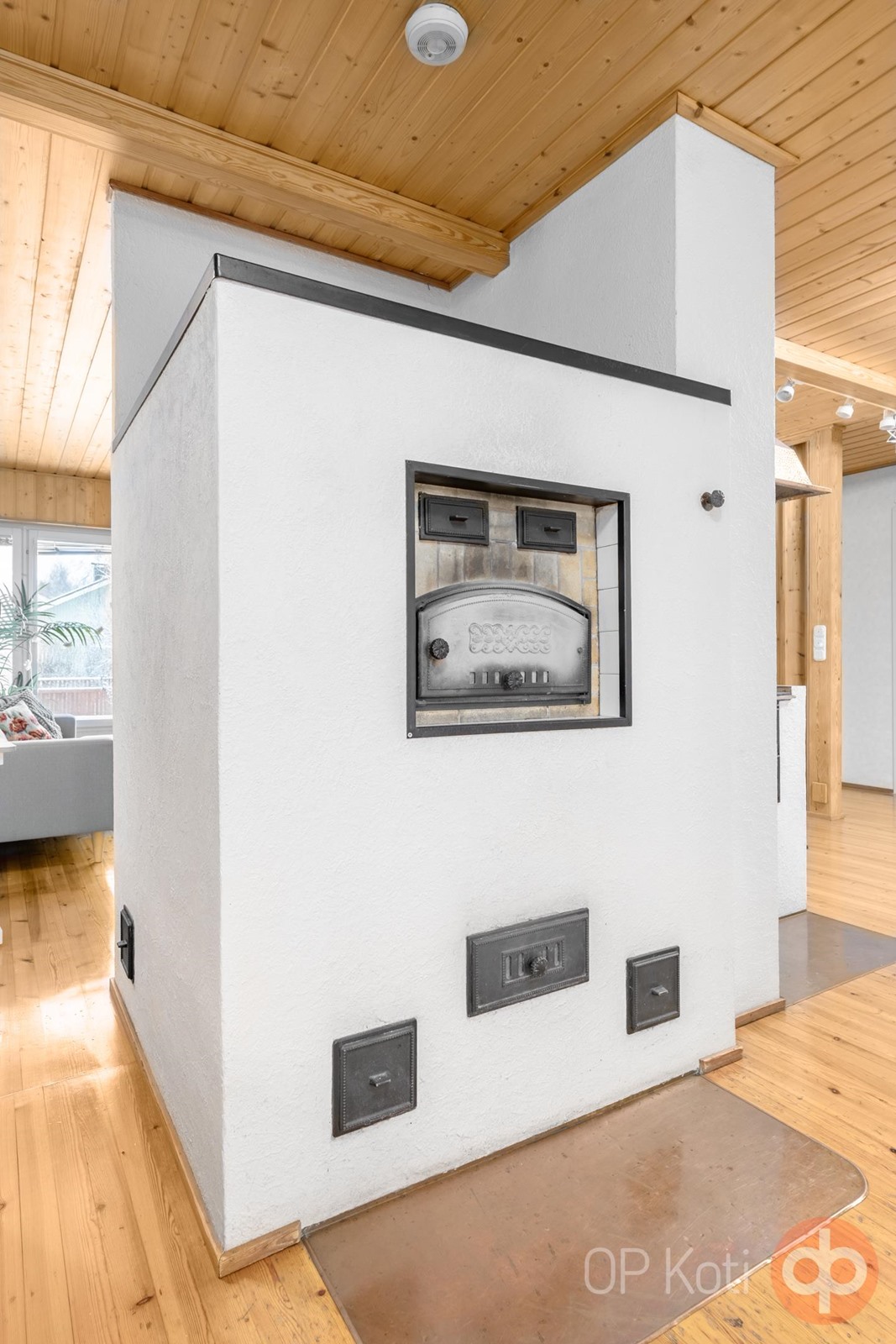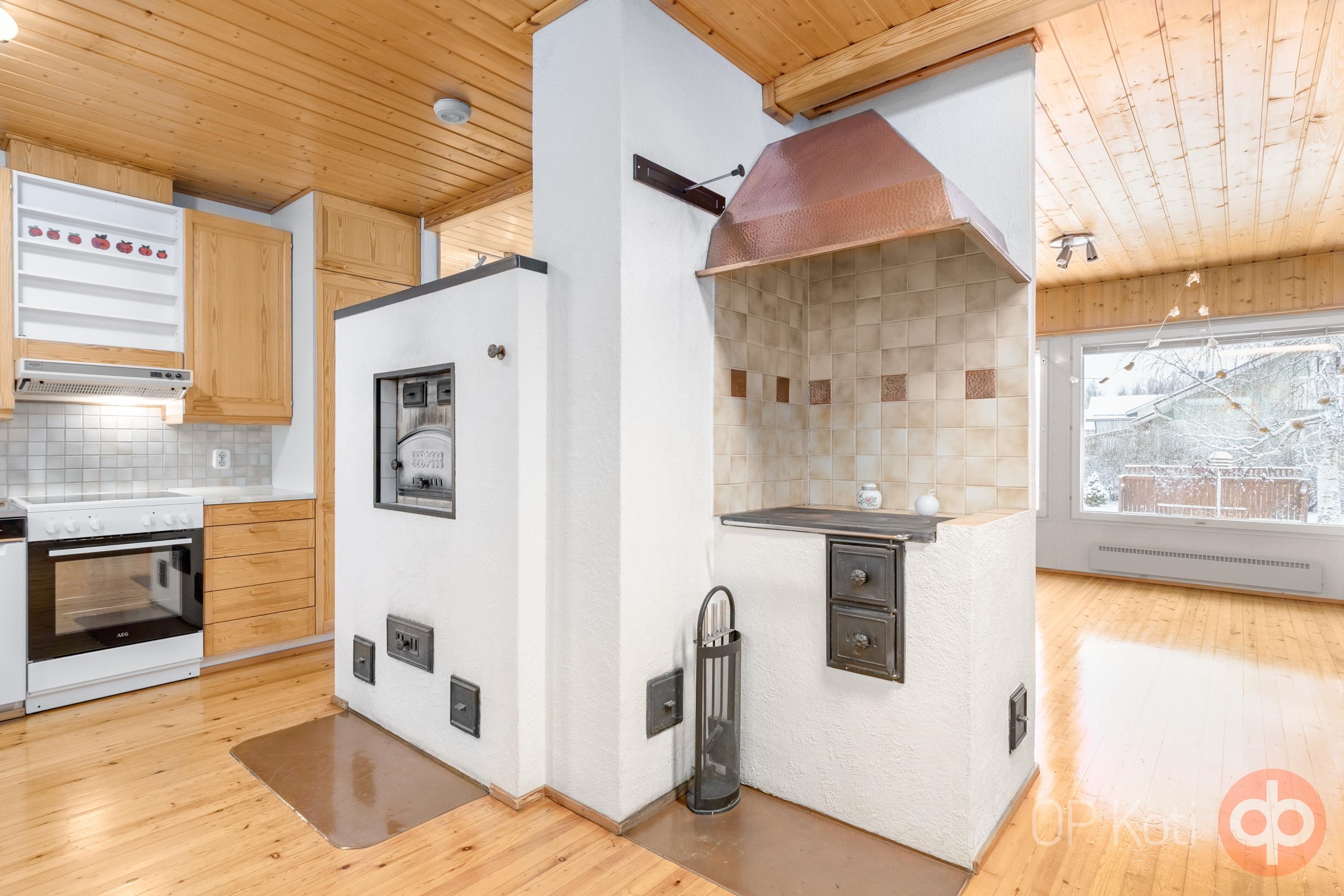 Talossa on kaksi makuuhuonetta sekä tilava olohuone, keittiö sekä ruokailutila, joita yhdistää talon keskellä sijaitsevat kaksi erillistä tulisijaa, puuhella ja leivinuuni, jotka tuovat lämpöä koko taloon ja pitävät lämmityskustannukset maltillisena. Keittiössä on runsaasti kaappitilaa ja ruoanlaitto onnistuu isommallekin porukalle. Toisen makuuhuoneen yhteydessä on vaatehuone, joten säilytystilaa riittää ja lisäksi talossa on erillinen wc. Toinen wc sijaitsee kodinhoitohuoneessa, joka tuo käytännöllisyyttä arjen askareisiin. Tilavan kodinhoitohuoneen yhteydessä sijaitsevat pesuhuone sekä sauna. Kodinhoitohuoneesta on käynti suoraan takapihan reilun kokoiselle terassille.