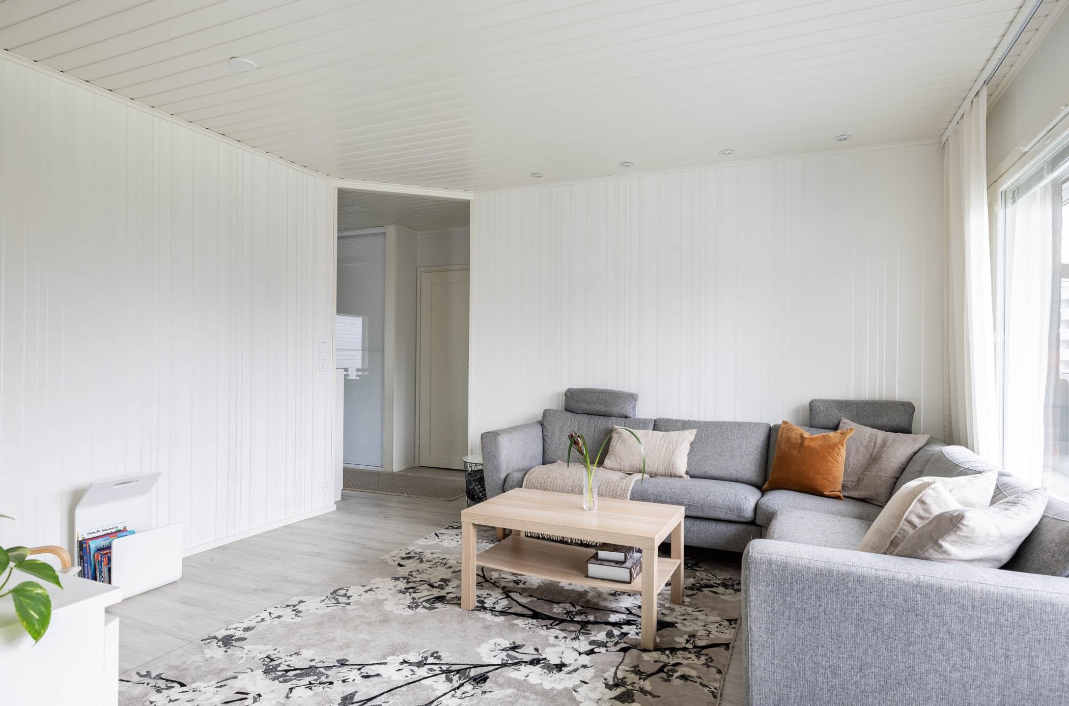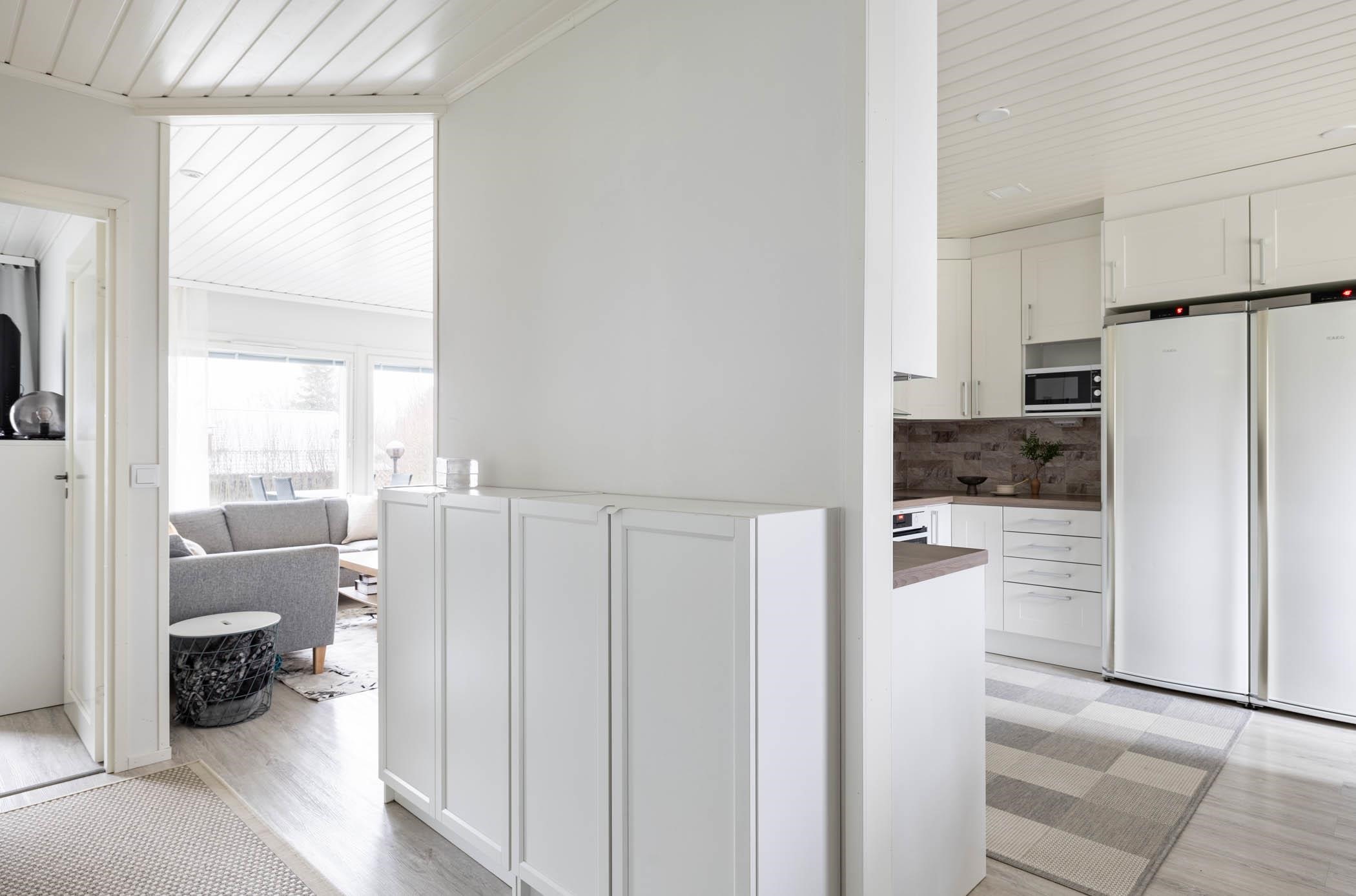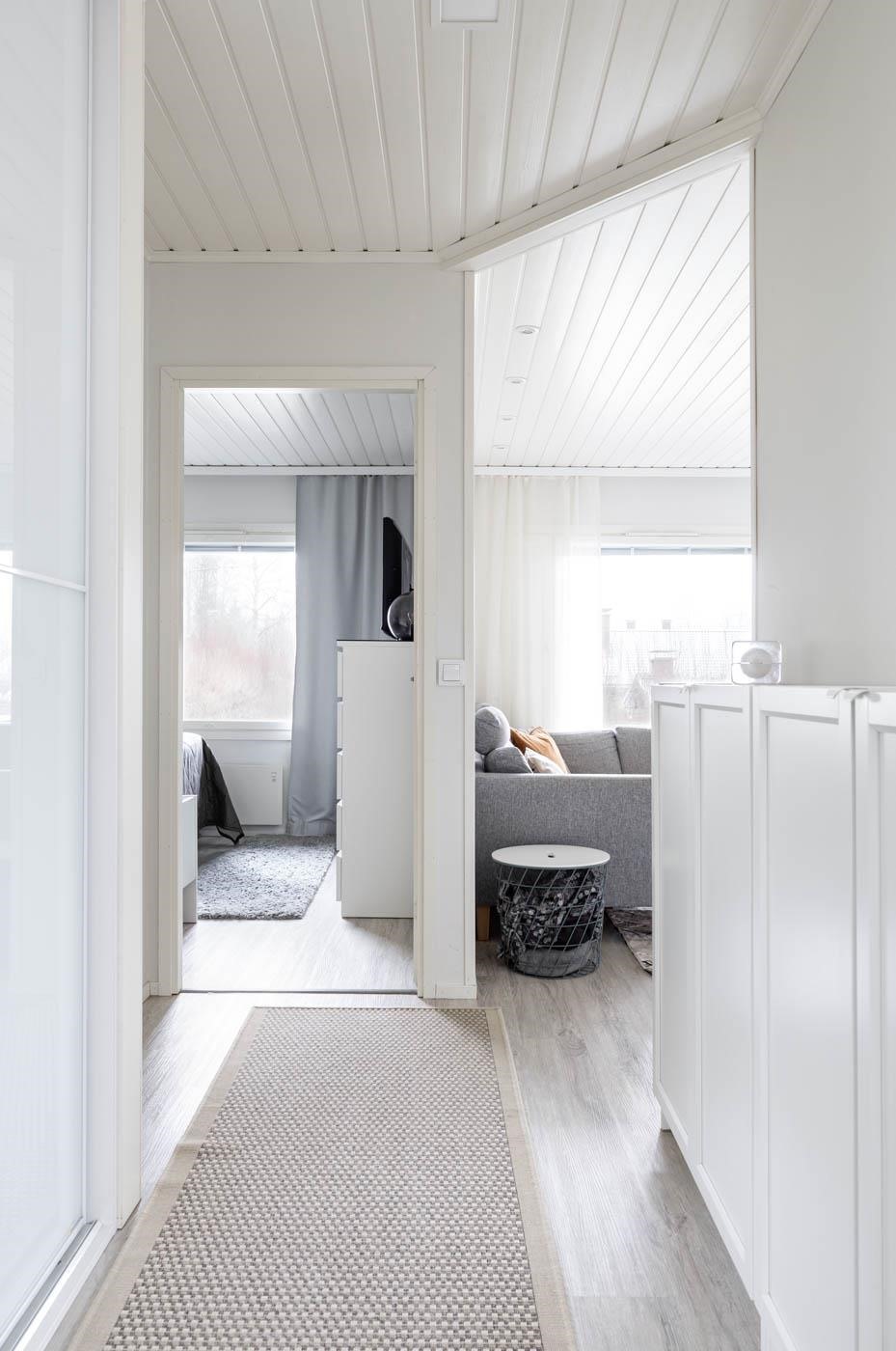 Keittiö: vinyylikorkki, maali. Olohuone: vinyylikorkki, tapetti. Makuuhuone 1: vinyylikorkki, maali/tapetti. Makuuhuone 2: vinyylikorkki, maali. Kodinhoitohuone: laatta, tapetti. Sauna: laatta, paneelit. Kylpyhuone: laatta, laatta. Eteinen: vinyylikorkki, maali. Tuulikaappi: laattalattia, sisutuslevy. Takkahuone: vinyylikorkki, maali.