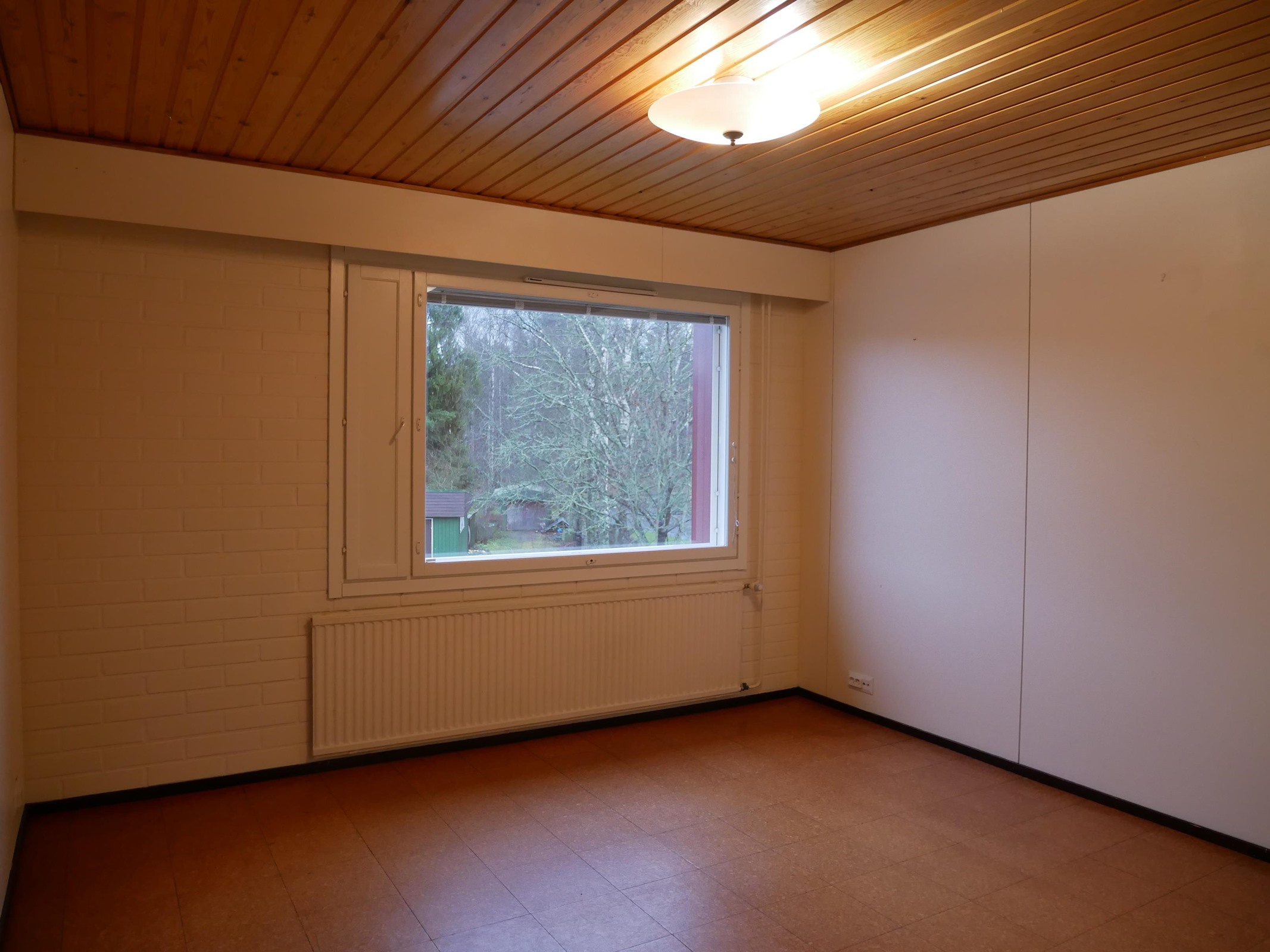 Keittiö: korkki, maali. Olohuone: korkki, maali. Makuuhuone 1: korkki, maali. Sauna: muovimatto, paneeli. Kylpyhuone: muovimatto, laatta.